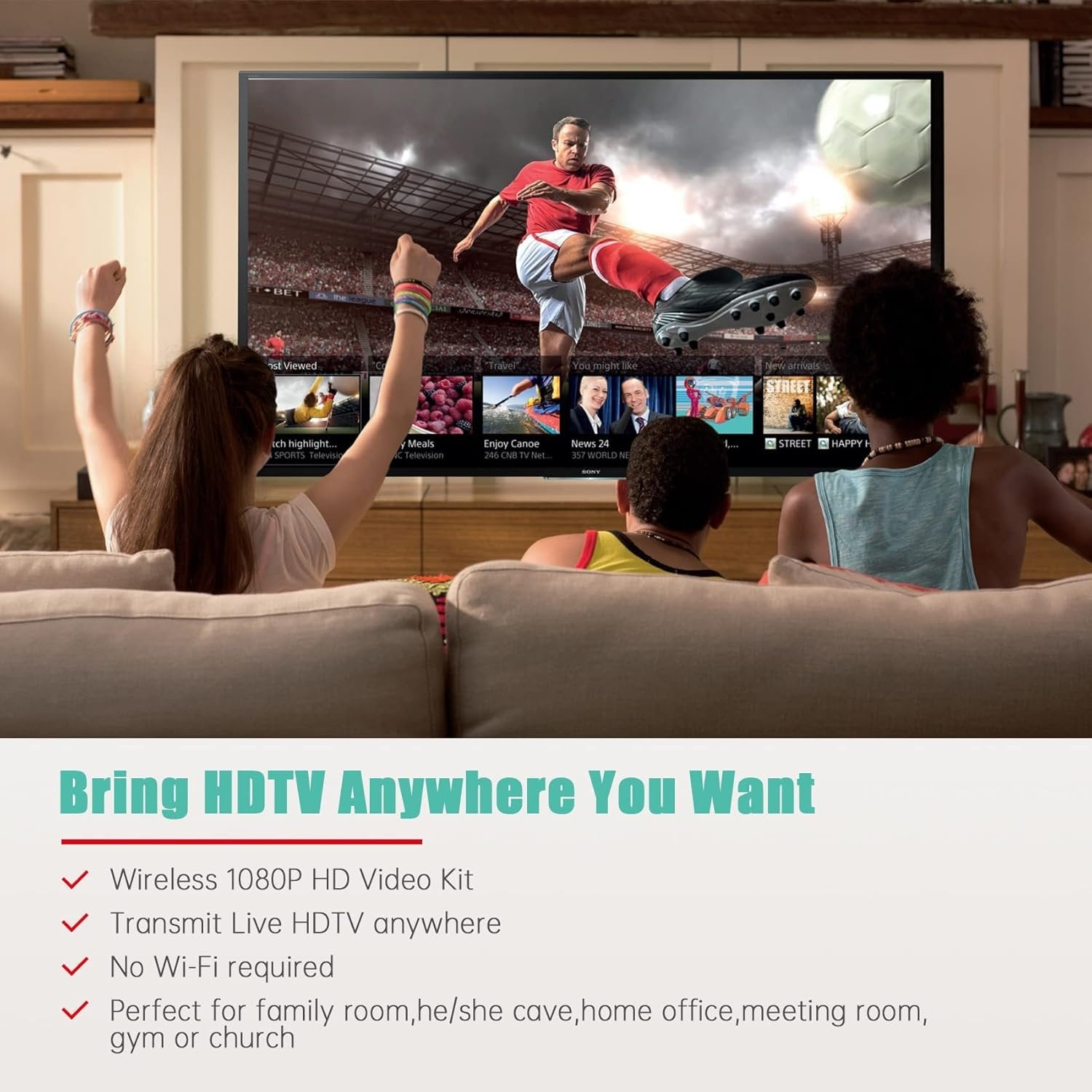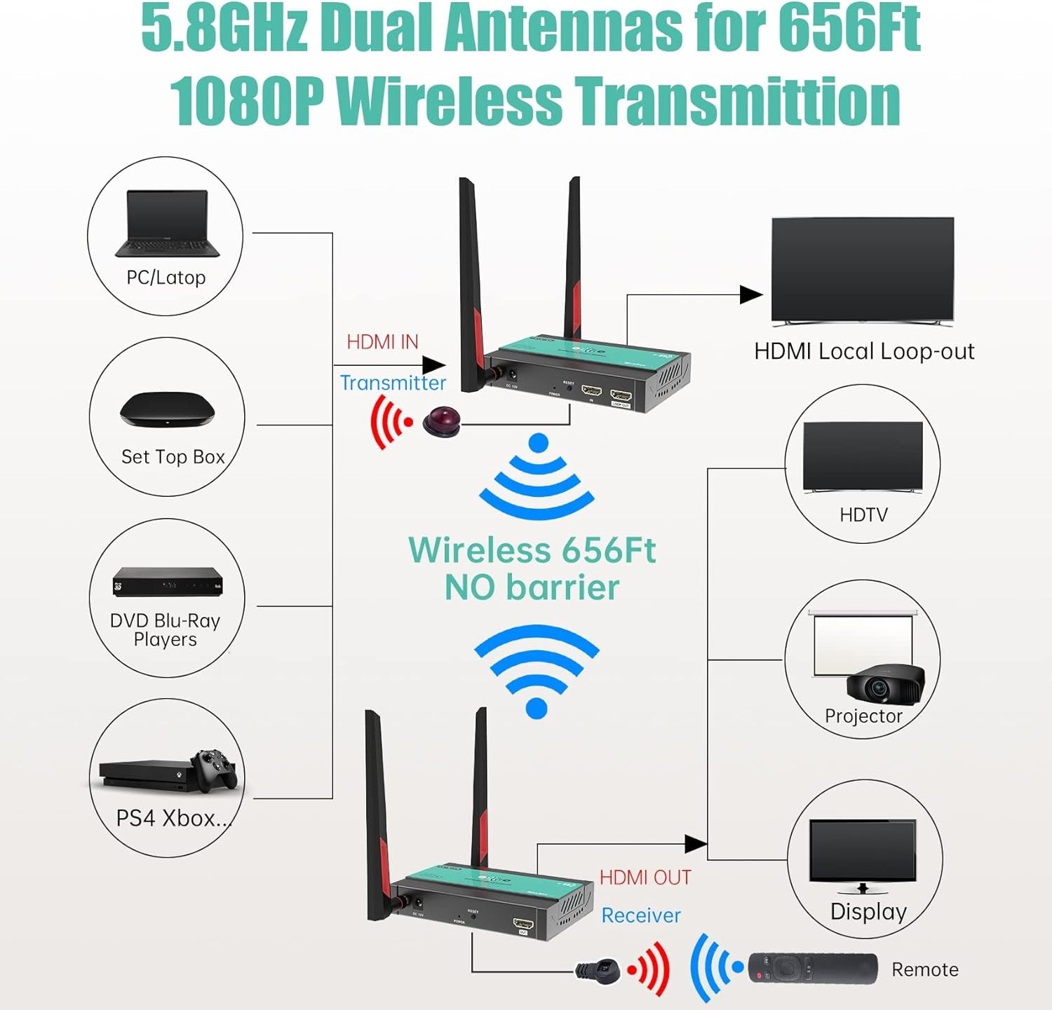 【This is 1TX+1RX Set】【Support 1TX to 4RXs(Max)】This wireless hdmi trasnmitter and receiver can support 1TX to 4RXs(Max) for multiple screens,add more RXs as you need(like: buy 1x2, 1x3, 1x4 receivers for 2 tvs,3 tvs, 4 tvs).Buy more RXs from this ASIN:B0B586LDTW .Noted:With the increase of RX, the wireless transmission distance will become shorter.Theoretically,line of sight distance: 1 TX to 1 RX: 200m(656ft); 1 TX to 2 RX: 60m(196ft); 1 TX to 3 RX: 40m(130ft); 1 TX to 4 RX: 30m(98ft). 【200m(656Ft) Line Of Sight Transmission】This wireless HDMI extender wirelessly sends HDMI A/V signals up to 656 feet(200m) through line-of-sight environments; works with most HDMI-equipped devices, including TV, DSLR camera,Projector, PS4,PS5, switch, hd digital video camera, blu-ray players, set-top boxes, AV receivers, cable/satellite boxes, laptop and computer pc systems. 【5.8GHz Dual Antennas,Strong and Stable Signal】Wireless hdmi extender 5.8GHz dual antenna for strong signal broadcast and long distance transmission.Thanks to the 5.8GHz dual antennas,the delay of this device is very low,only 0.12s,which is very suitable for conference presentations,home theather and live broadcast transmission needs. NOTE: Do NOT install multiple kits in the same location as this may cause signal interference, we recommend install 5 kits in the same location at most. 【1080P@60HZ Full HD Transmission and No Delay HDMI Loop-out】This wireless hd video transmitter and receiver kit supports vivid, high-definition videos up 1080p @60Hz. Compatible with HDMI 1.3 (High-bandwidth Digital Content Protection) and Loop-out 1080P full HD signal to the local monitor. Resolution supported: 1080p@50Hz / 1080p@60Hz / 1080p@24Hz /1080p@25Hz /1080p@30Hz / 720p@50Hz / 720p@60Hz / 576i@50Hz / 480p@60Hz 【Built in IR Remote Control】This wireless hdmi transmitter and receiver built-in IR signal extension feature allows you to control the playback device remotely. Imagine you have a DVD player in your media room and a TV in your living room, while you are in the living room, you can still use your DVD remote to control the DVD player with IR CONTROL EXTENSION function. 【Package Content】Wireless HDMI Transmitter x 1,Wireless HDMI Receiver x 1,5.8GHz Antennas x 4,12V1A DC Power Adapter x 2,IR extension cable TX x 1,IR extension cable RX x 1,User Manual x1