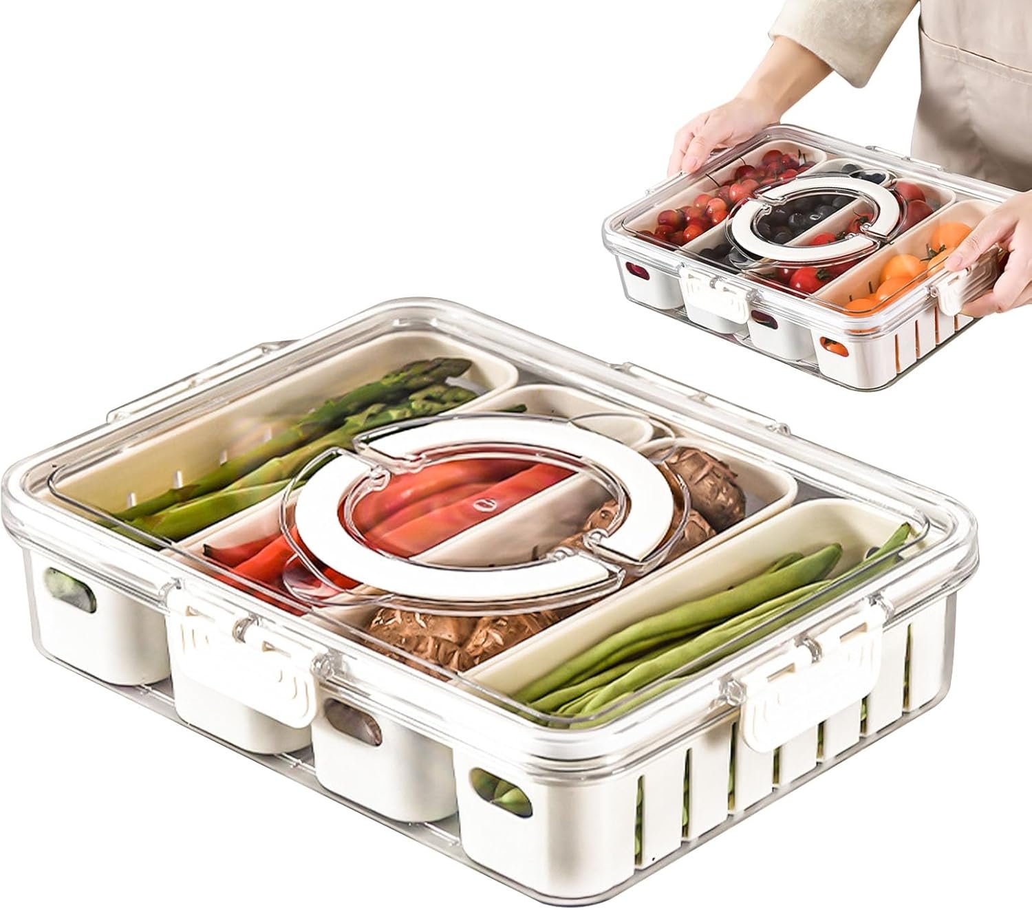 ã€Multiple Compartments Design】This multi-functional fridge organiser comes with 4 removable compartments, the multiple compartments are designed for sorting and storing food, preventing food from mixing together and spoiling ã€Strong Sealing】The lid of this fruit and vegetable storage container features a food-grade silicone ring seal and 4 reinforced clasps for excellent airtightness, and the lid has a nice carrying handle for easy carrying on the go ã€High Quality Material】The fridge storage organiser is made of high quality food grade plastic is clearer and more durable than other ordinary plastic food storage containers for storing food, BPA free, durable food containers with lids are designed for long term use ã€Built-in Drainage Basket】The food storage container has removable water filter, which can be used inside the container or separately for easy cleaning and filtering out water from the surface of vegetables and fruits ã€Multi-layer Stackable】The refrigerator storage box can be stacked in multiple layers, saving you a lot of space in the refrigerator, perfect for storing a variety of fruits or vegetables, such as blueberries, grapes, strawberries, cherries, tomatoes, lettuce, etc., in the kitchen, cupboards, or pantry, making it ideal for resisting low-temperature refrigeration of meats and fish