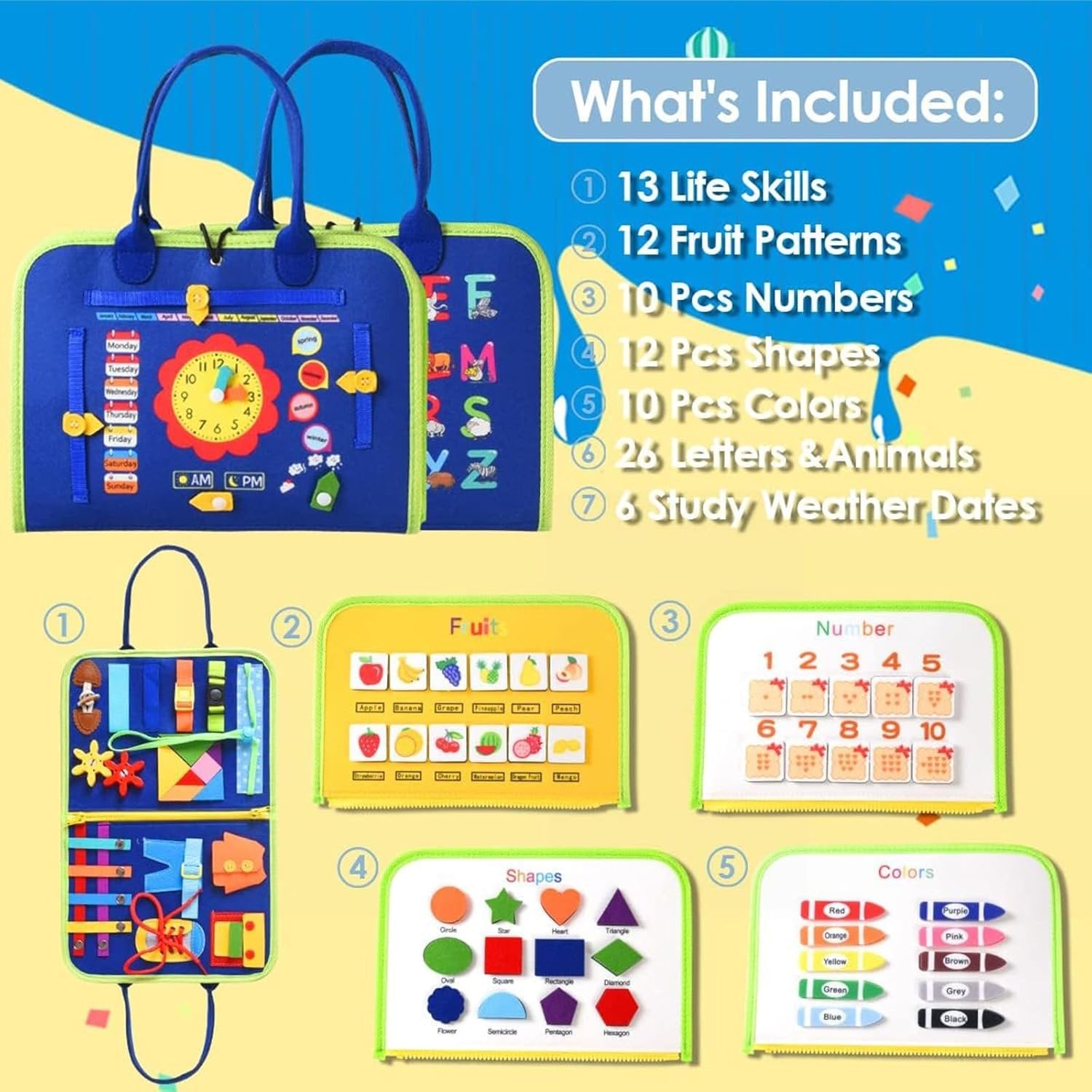 ã€Montessori Toy Busy Board】: Montessori educational method, based on real-life simulations, self-directed learning, and collaborative play.It can help improve your baby's fine motor skills, strengthen hand-eye coordination, and develop your baby's creative logical thinking and problem-solving skills during play. This is a preschool learning toy for babies to explore on their own! ã€89-In-1 Activity Busy Books for Toddlers 3-5】: Busy board helps kids natural learning through play. Including zippers, shoelaces, buttons, belt buckles, jigsaw puzzles, alphabet, clocks and calendar learning games.Safe preschool learning activities for quiet play and develop fine motor skills, dressing skills, finger dexterity, and cognitive skill. ã€Educational Learning Board】: Educational Quiet Book is a practical educational toy for kids not only entertain kids but reduce their screen time and keep them engaged in sensory activity board no matter indoor and outdoor activities. It helps to foster the capacity of learning, improve hand-eye coordination and creative thinking. ã€Soft & Portable Travel Toys】: Our Montessori toddler sensory toys are made of non-toxic soft fabric and felt with no hard corners for your toddler to play safely. The busy board with handle is easy for toddlers to carry and can flexibly fit into most diaper bags or book bags. Perfect for toddlers to stay focused on car rides, plane rides, traveling or environments that require quietness with the activity sensor board. ã€Perfect Toys For Kids】: The activity books for toddler travel toys is completely useful and creative toys for children. As Birthday, Carnival Prize, Christmas, Halloween, Thanksgiving, Contest prizes. Surprise your kids with our amazing busy board.
