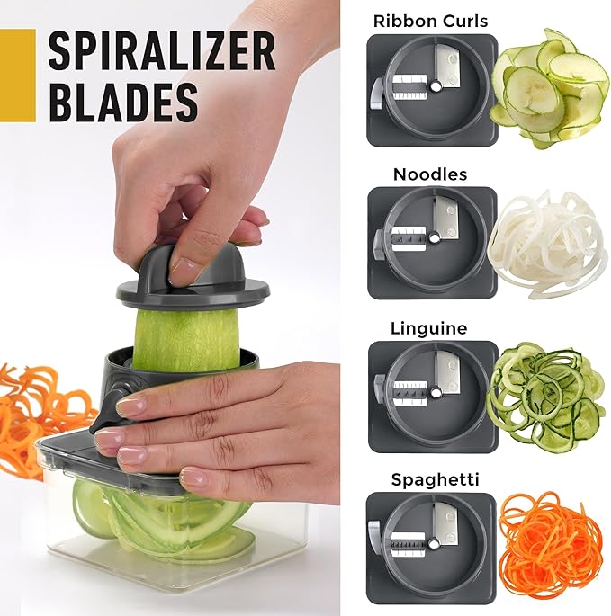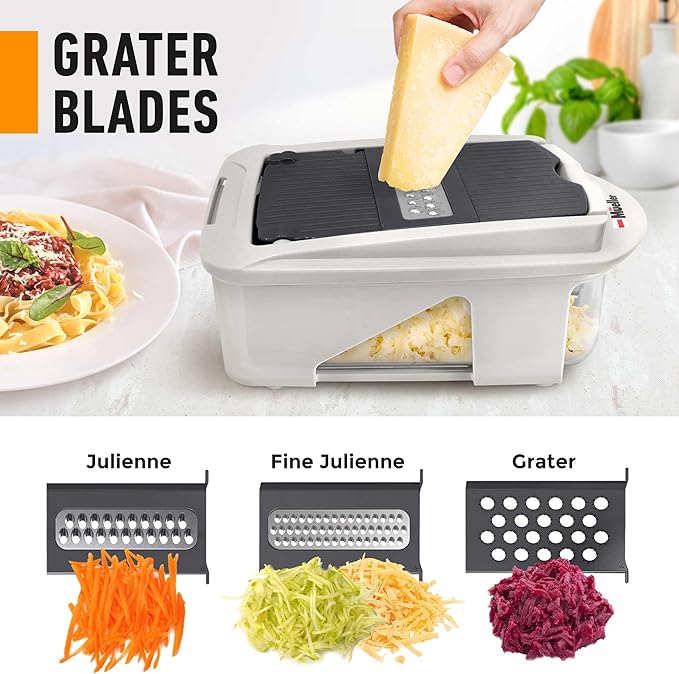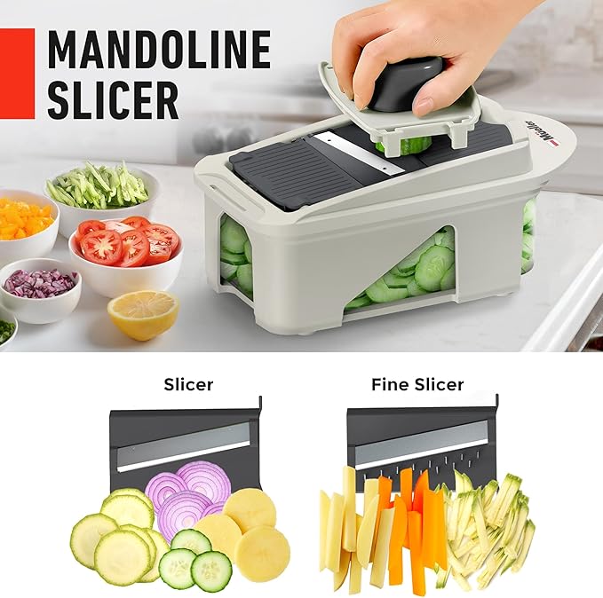 Mueller Pro-Series All-in-One, 12 Blade Mandoline Slicer for Kitchen, Food Chopper, Vegetable Slicer and Spiralizer, Cutter, Dicer, Grater, Kitchen Gadgets Sets with Container, White Sand/Gray