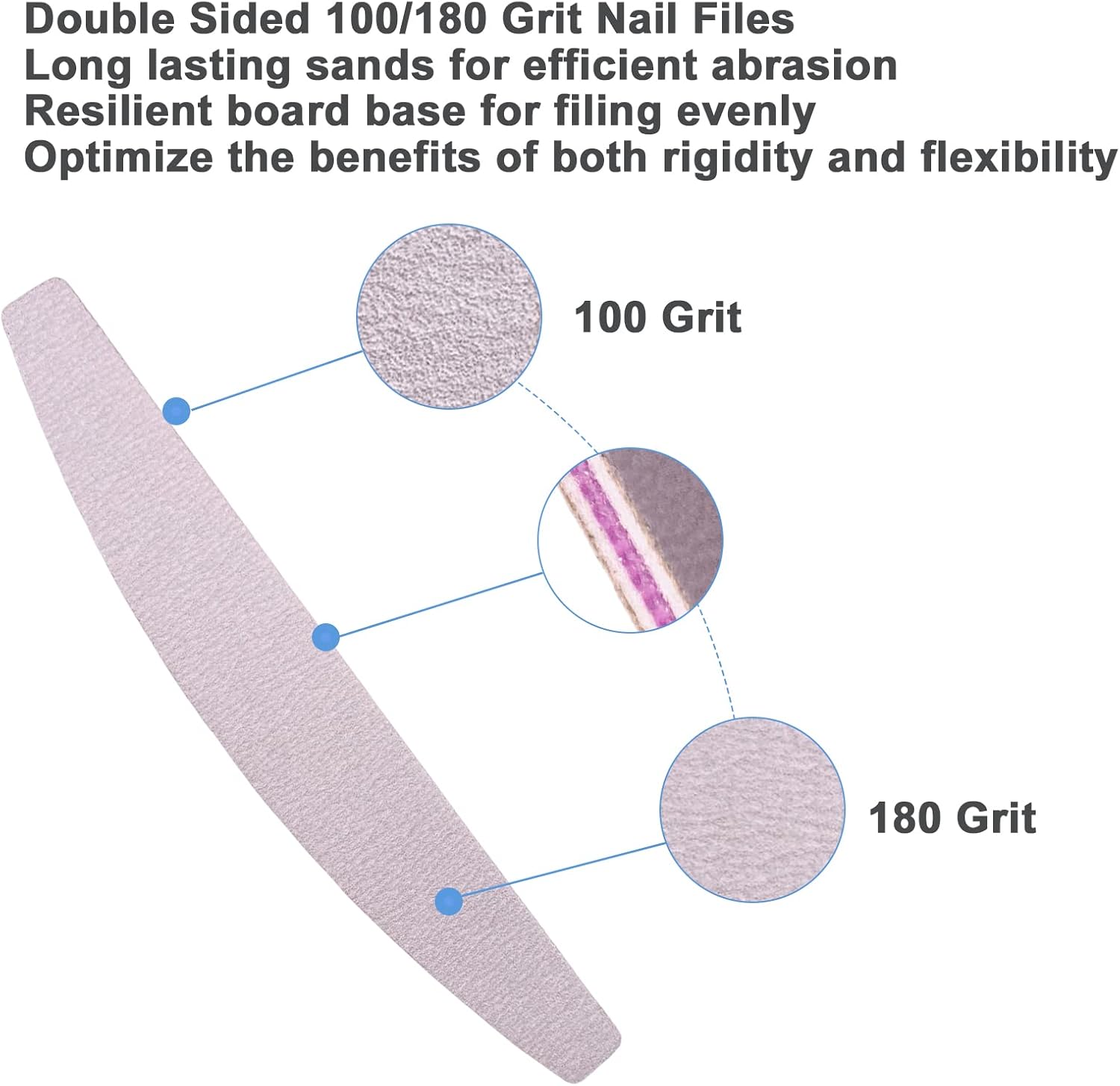 Double sided 100/180 Grit Nail Files and Buffers : Package includes 5 pieces of nail files and 5 pieces of nail buffer blocks, so you can choose for your own preference, where the coarse grit side is used to shape nails and the uneven surface, and the fine side used to polish the grease on the nail surface; 100/180 Grit Nail Files: Made of premium emery board materials with different grit, ideal for removing nail gel, or trimming your nail to the desired length and shape. The double sided 180/100 grit suitable for fake nails and shaping natural nails, and works great for buffing acrylic nails, natural nails, powder dipped nails and false nails, also for getting the nail gel/glue off at home; Resilient Nail Buffer Blocks: Made of high quality sand surface sponge, high-elasticity, sturdy and durable, washable and reusable, good for polishing and smoothing acrylic nails, fake nail tips or natural nails.The foam board can take better care of your nails and will provide you consistent and pleasant filing experience; Right Size and Ergonomic Shape with Multi Colors: The 7.01 inches nail files and the 3.5 inches buffer blocks are just right size, neither too big nor too small; it is in your palm of hand to polish, or to take it on the go for traveling; The half moon shape with round top of buffers and files are also easy use for trimming and buffering; Wide Applications: Our nail files and buffers are very suitable for natural nails, finger nails, toe nails, and also for acrylic nails, gel nails, and more…