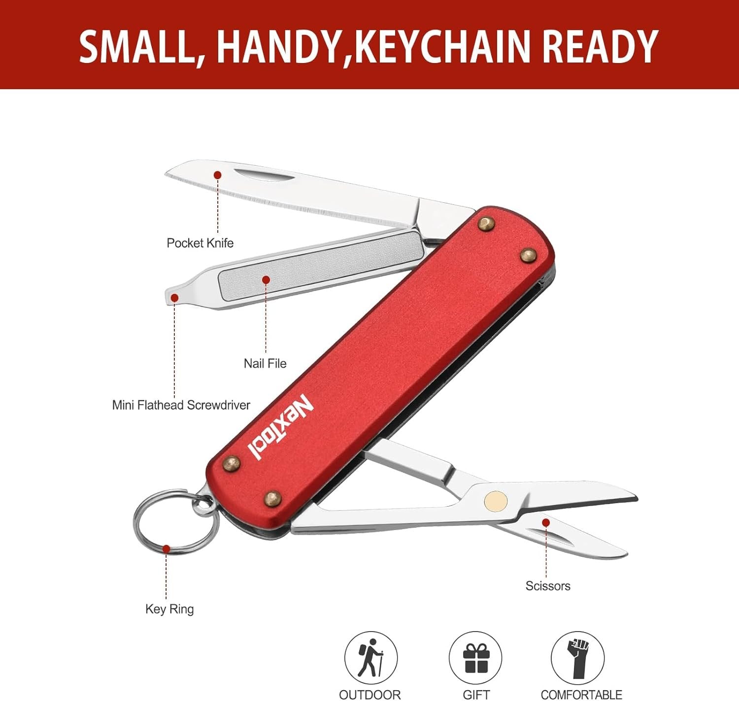 5 IN 1 SWISS STYLE ARMY POCKET KNIFE: This mini multitool with key ring for keychains are a must have, comes with 5 essential functions: mini knife, scissors, nail file with flat-head screwdriver, and key ring. Multifuncional, lightweight, keychain ready, and built to last. SMALL, HANDY, KEYCHAIN READY: Keep looking for ways to reduce the bulk of items that you keep in your pant pockets? This small pocket knife is the perfect size for accomplishing that goal. Mini body in 64.5x18.3x7.8mm, lightweight in 27±2g. Equiped with portable key ring, easy hook to your key chains, handy little tool that is nearly always with you. VERSATILE, CONVENIENT, EASY TO CARRY: Small, versatile pocket tool that can easily be part of one's keychain, EDC, etc. Includes useful tools like knife to open boxes, cut cord, break down cardboard boxes, open bags...., Nail file good for nails or other soft things like plastic that needs to be filed. Flat head screw driver, scissors with great spring, all in a compact body. Perfect gifts for men on Valentine's Day, birthdays, or other holidays. DURABLE & STABLE: Mulititool keychain become an essential and handy helper, the handle is made of 5052 aluminum alloy, and blade is made of 420J2 stainless steel, featuring high quality and corrosion resistance for durability and functionality. Solid metal and right weight tool to everyday carry for camping, backpacking, hiking, traveling and cycling. AFTER-SALE SERVICE: NexTool small pocket knife multi-tool is designed to bring you great convenience. Your satisfaction is our top priority, and if you have any questions, please don't hesitate to contact us. We are always here to help!