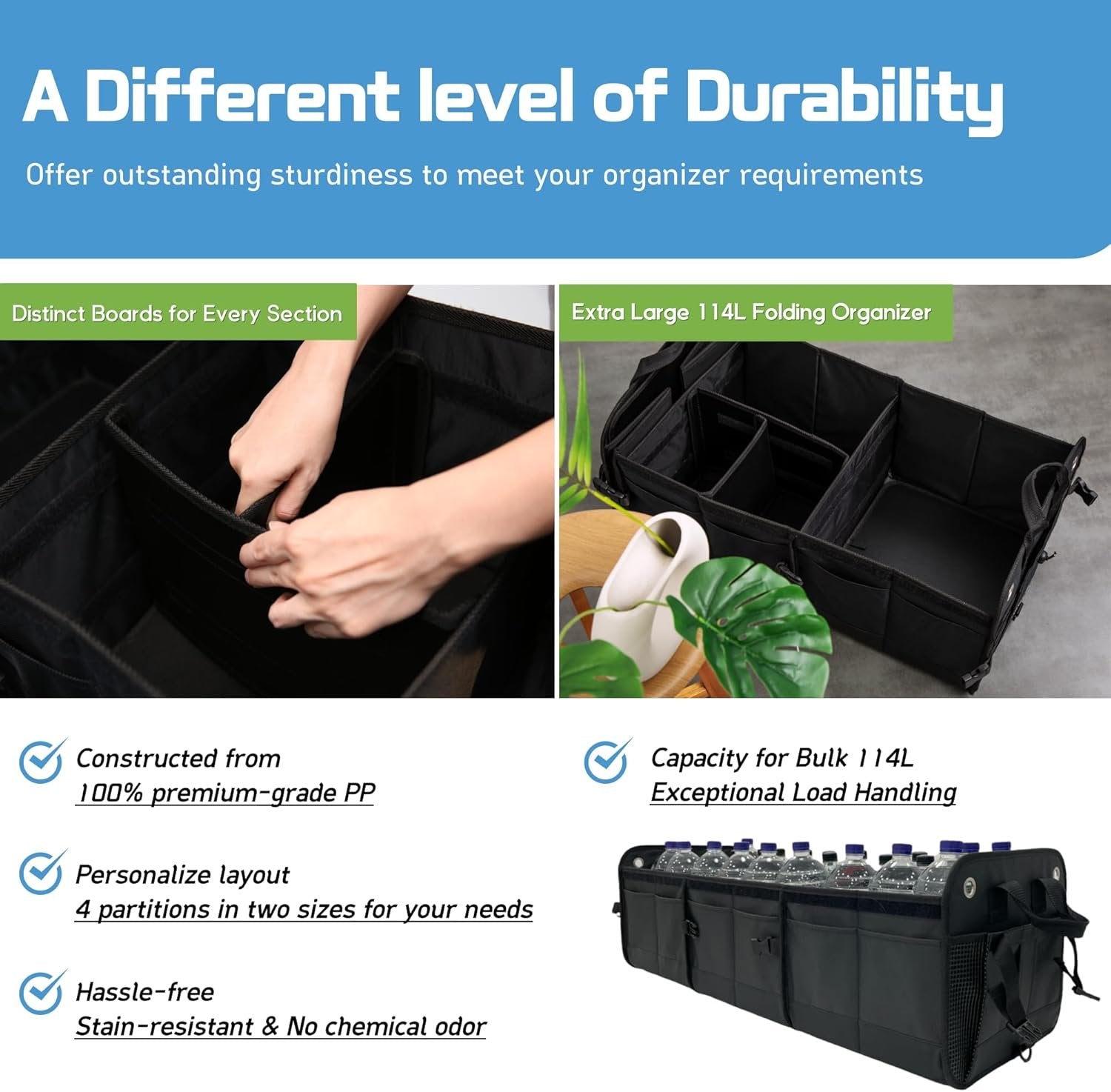 1) Striving for Excellence: Meticulously crafted through extensive product research and collaboration with multiple factories, our unique professional-grade black organizer is a standout in the market. Offering a generous space of 114L, this NINEDUCK brand trunk organizer is an ideal fit for any vehicle, especially larger ones like SUVs, vans, and trucks. With dimensions of 37” (L) x 14.5" (W) x 12.6” (H), it’s a spacious and practical solution, designed to meet your organizational needs even under the most demanding conditions. 2) Built to Endure: Our reinforced double-thread method ensures robust tensile strength, wear resistance, and minimal creasing. Crafted from premium 1680D Oxford woven with highly durable 800D x 800D double weft plain fabric, our organizer is built to endure. It stands out for its unparalleled tensile strength and long-lasting durability in the market, even under harsh, long-term conditions. This resilience makes it a reliable companion for your journeys, ready to withstand the rigors of everyday use. 3) Engineered for Heavy Loads: Our organizer is designed with a robust, high-quality material—specially crafted N-PP board—that outperforms cardboard in durability and strength, surpassing even PE board in robustness. This enhances the organizer’s flexibility and strength, making it a reliable choice for transporting heavy items, even under demanding conditions. 4) Water and Moisture Resistant: Crafted from dense black premium Oxford fabric, our exclusive large NINEDUCK vehicle organizer is designed with a water-repellent coating to resist water seepage and soaking. This feature not only enhances the durability of our product, but also ensures it remains reliable and effective in various conditions, safeguarding your belongings from unexpected spills or moisture. 5) Our Commitment to Quality and Customer Experience: Our dedication to delivering top-notch car trunk organizers is unwavering. Actively responding to customer insights is integral to our approach. We tirelessly aim to provide unparalleled products while consistently meeting the unique needs of our customers. Our commitment extends to offering lifetime support that comprehensively covers any manufacturing defects, ensuring that our product consistently upholds the highest standards of quality and durability. The thoughtful design of our lid enhances the product’s completeness and usability.