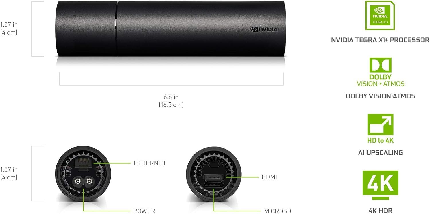 Fast. Really Fast. Shield tv takes media streaming to a whole new level, powered by the Nvidia Tegra X1+ processor, Shield tv is the world’s most powerful Android Tv streaming media player. Bluetooth version: 5.0 + LE Dolby vision - Atmos. Bring your home theater to life with Dolby vision HDR and Dolby Atmos surround sound—delivering ultra-vivid picture quality and immersive audio. Enhance HD video in real-time to 4K for clearer, crisper visuals using next-generation AI upscaling.Captive Portal support Best-in-class design. The new Shield tv is compact, stealth, and designed to disappear behind your entertainment center, right along with your cables. With Gigabit ethernet, dual-band AC wi-fi, a built-in power supply, and a microSD card slot for storage expansion, it is powerful, feature-packed, and built for behind-the-scenes brilliance. The all-new remote is more advanced than ever with motion-activated, backlit buttons—including a user-customizable button. With voice control, bluetooth, IR control for your tv, and a built-in lost remote locator, you have the most advanced remote yet Unlimited entertainment. Get the most 4K content of any streaming media player. Watch Netflix, Amazon Video, Disney+ and Vudu in crisp 4K HDR, and YouTube, Hulu Live, Google Play Movies & tv, and more in 4K. Stream from your phone with built-in Chromecast 4K. Add a game controller (sold separately) and play today’s most popular games like Fortnite with GeForce NOW Voice control. The built-in Google Assistant is at your command. See photos, live camera feeds, weather, sports scores, and more on the big screen. Dim the lights and immerse yourself in your favorite show or music using your voice. And control your Shield hands-free with Google Home or Alexa and Amazon Echo Audio support: AAC, AAC+, eAAC+, MP3, WAVE, AMR, OGG Vorbis, FLAC, PCM, WMA, WMA-Pro, WMA-Lossless, Digital Plus, Dolby Atmos, Dolby TrueHD (pass-through), DTS-X (pass-through), and DTS-HD (pass-through). Android 11.0 powered by Android TV with Chromecast 4K built-in