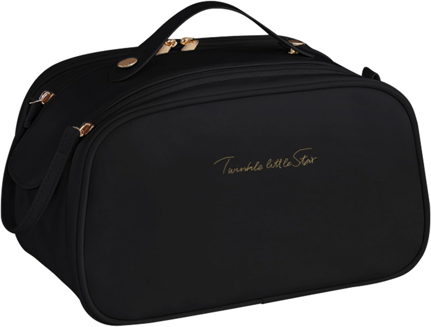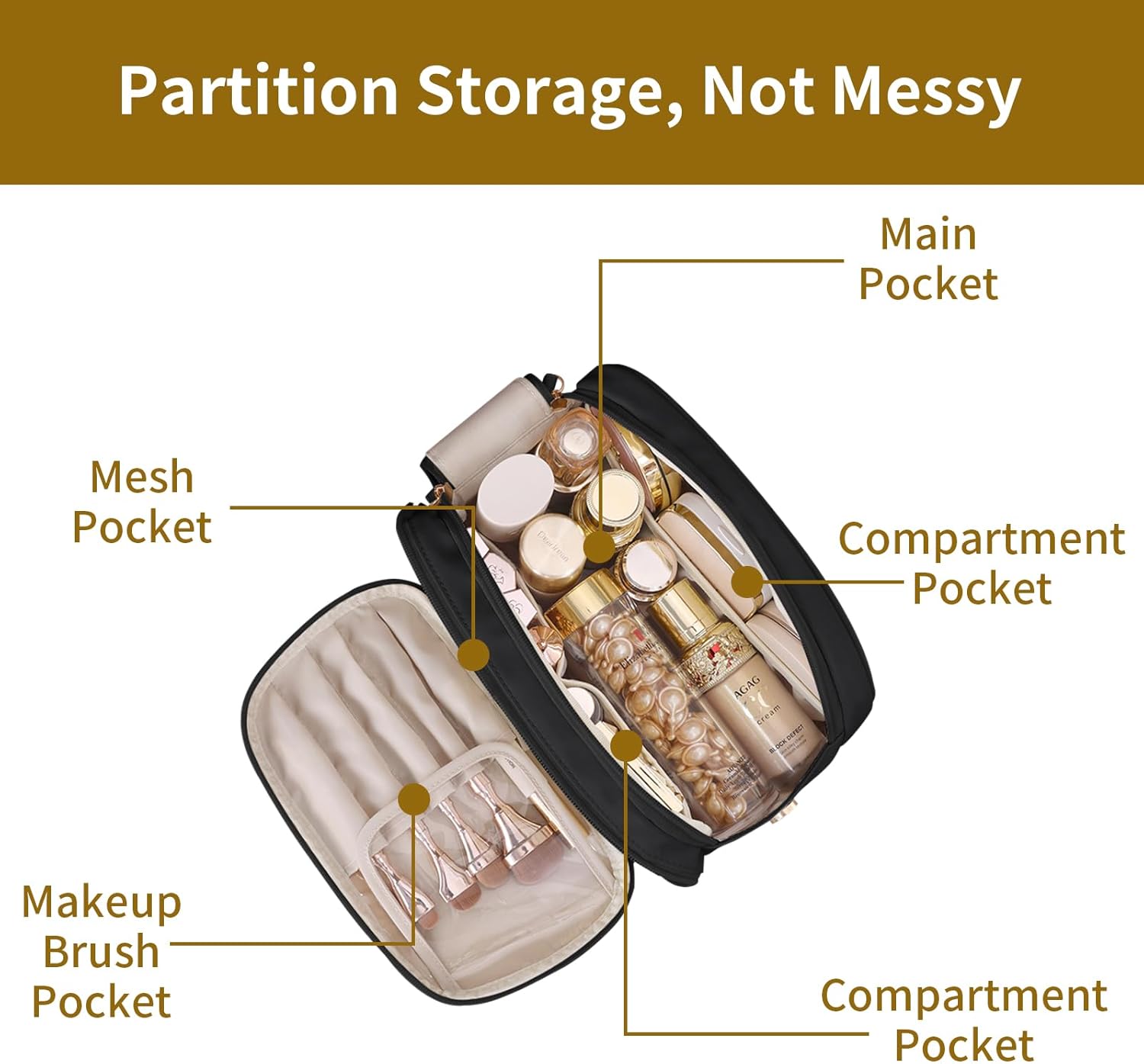 Durable Material: The cosmetic bag is made of high-quality PU leather fabric, which is protected from splashing water, has no odor, and has good abrasion resistance, scratch resistance and tear resistance. The surface is soft, waterproof and easy to clean. High-quality metal double zippers are smooth and durable, easy to open and close. Large Capacity Space: There is 1 large elastic open pocket and 2 small elastic open pockets in the main compartment.There is a mesh zipper pocket and 5 cosmetic pen pockets in the side compartment.Enough to hold your cosmetics and toiletries, such as foundation, concealer, mascara, eye shadow, lipstick, toothbrush, toothpaste, etc. Easy to Carry: The makeup case can be used as a makeup organizer, toiletry wash bag, travel organizer bag and daily handbag. The leather handle is easy to carry and hang, soft and comfortable, and specially designed for travelers. It can be stored in suitcases, backpacks, duffle and luggage when you travel. Travel Must Have: Size: 10.2 x 5.9 x 5.9 inches/26 x 15 x 15 cm, weight: 0.55lbs/250g. Enough to accommodate all the necessities for weekend travel or daily use. Very suitable for outdoor travel, business travel, camping, tourism, gym, home storage, etc. Ideal Gift Choice: Leather cosmetic bag is a great traveling accessory and wonderful gift for mother, girlfriend, family, friends and your loved ones for Mother's Day, Christmas, New Year and Valentine's Day.