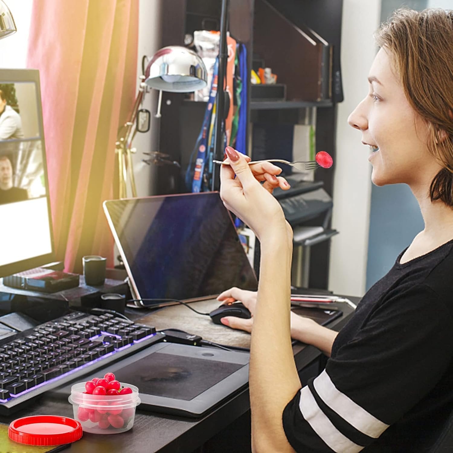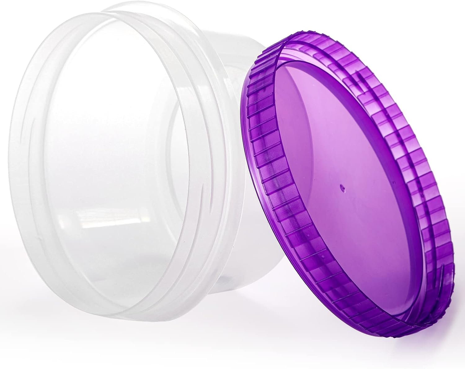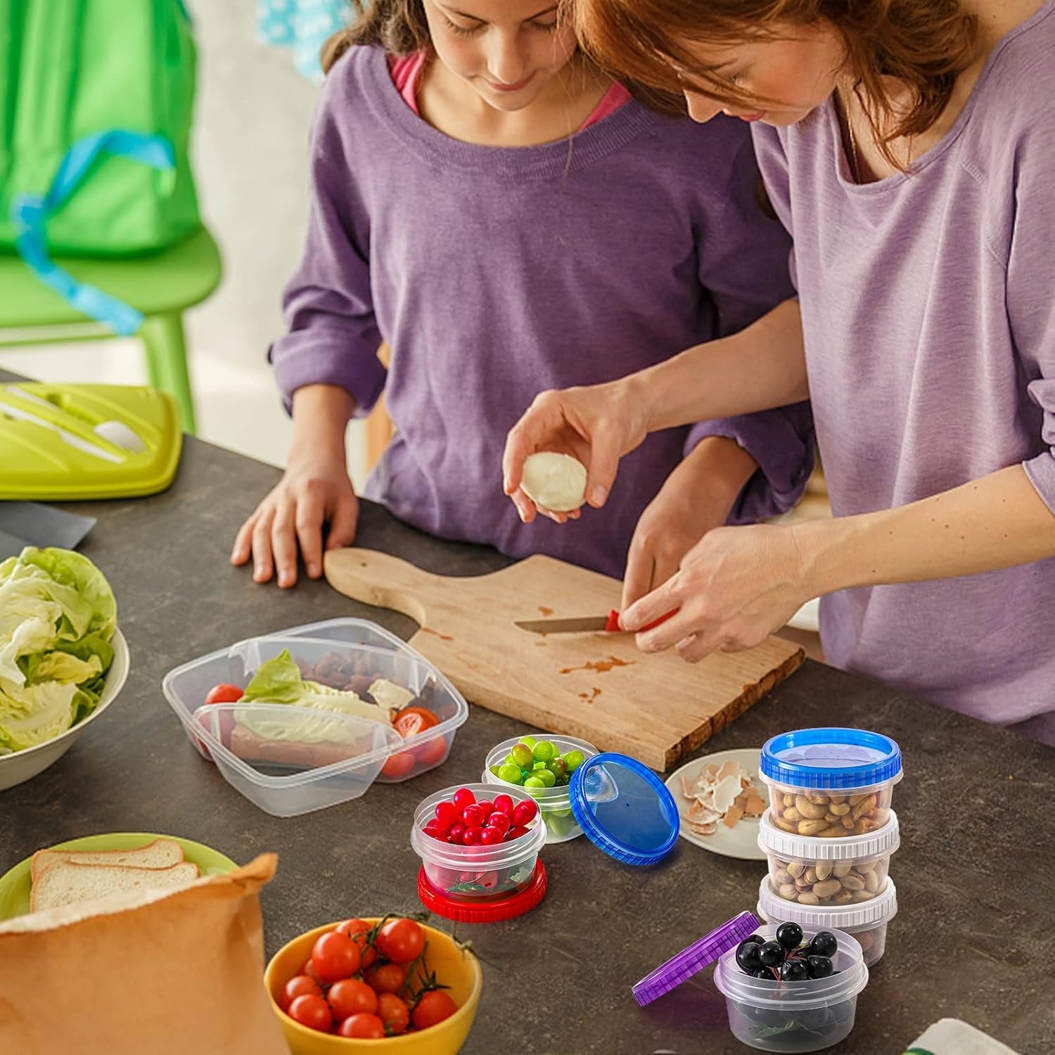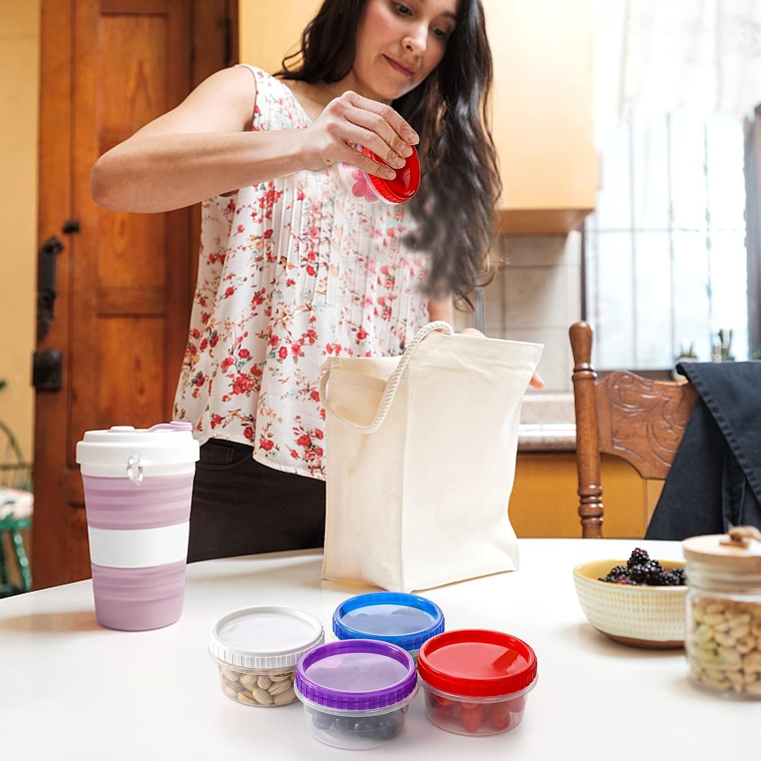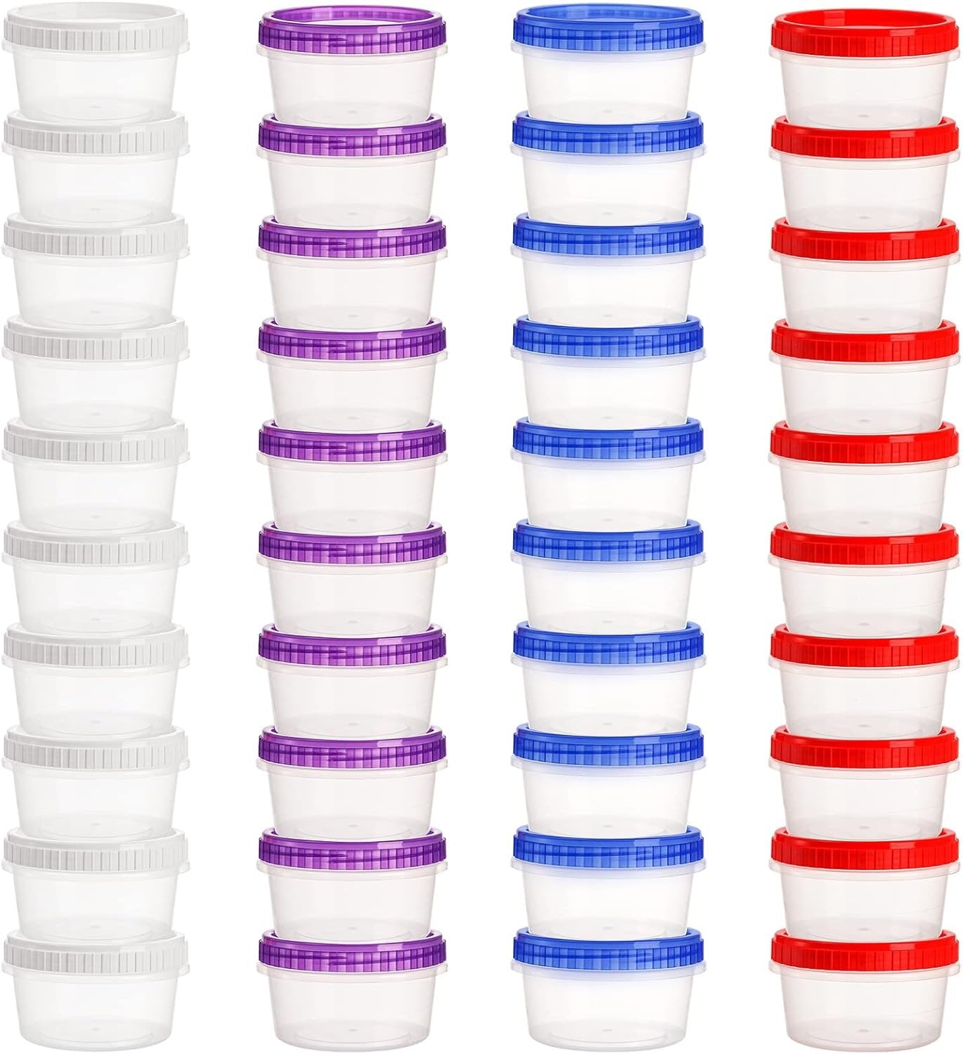 Okllen 40 pack reusable small plastic freezer storage container each measures 2.3" in height and approximately 4" in Diameter, can hold up 10 oz liquid, suitable for food packing, meal prep, portion control and more. 10 oz plastic containers with lids made of food-grade polypropylene plastic, BAP free, non-toxic, odorless, healthy and safe material to directly contact with food, temperature resistant to hot food and sturdy enough will not easy to deform. Microwave Safe (excluding the lids)! The temperature resistance range of -10°C to 110°C. Small meal prep containers feature screw lid design with vertical fringes, easy to twist off or close the cover. Airtight leakproof twist cover seal can effectively prevent food falling out or liquid spilling, keep your food in fresh flavor. Safe and convenient to carry, ideal as to-go containers, lunch containers, soup containers or short travel containers. Our snack containers for kids come with 4 assorted colors, blue, red, purple and white lids, can help you designate different color for different food individually, and easy to recognize. Great for store your nuts, fruits, soup, leftovers, jam ,kids baby snacks , slime, sauce, salad, etc.
