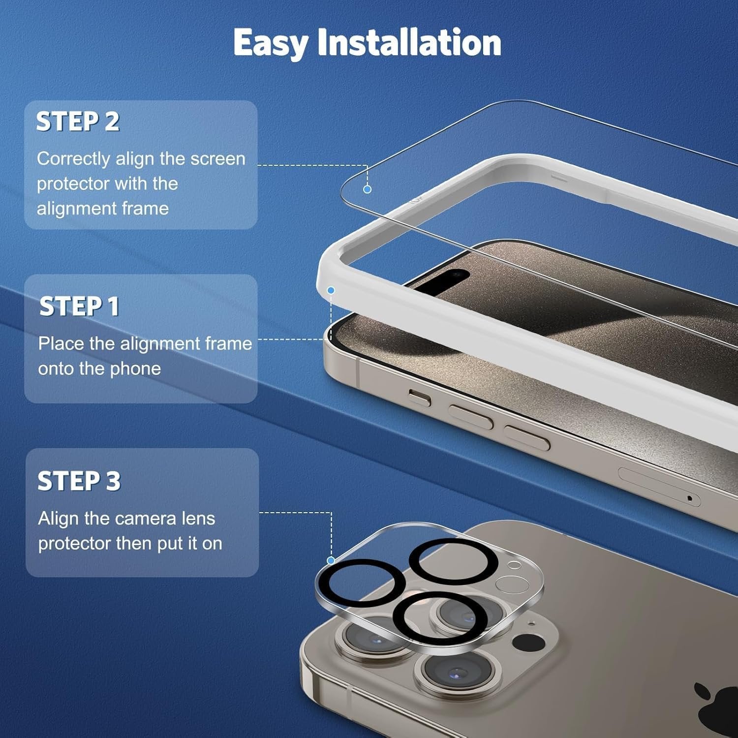 OMOTON Screen Protector for iPhone 15 Pro, 3 Pack Tempered Glass Screen Protector with 3 Pack Camera Lens Protector for iPhone 15 Pro 6.1-inch, Case Friendly/Easy Installation with Alignment Framework