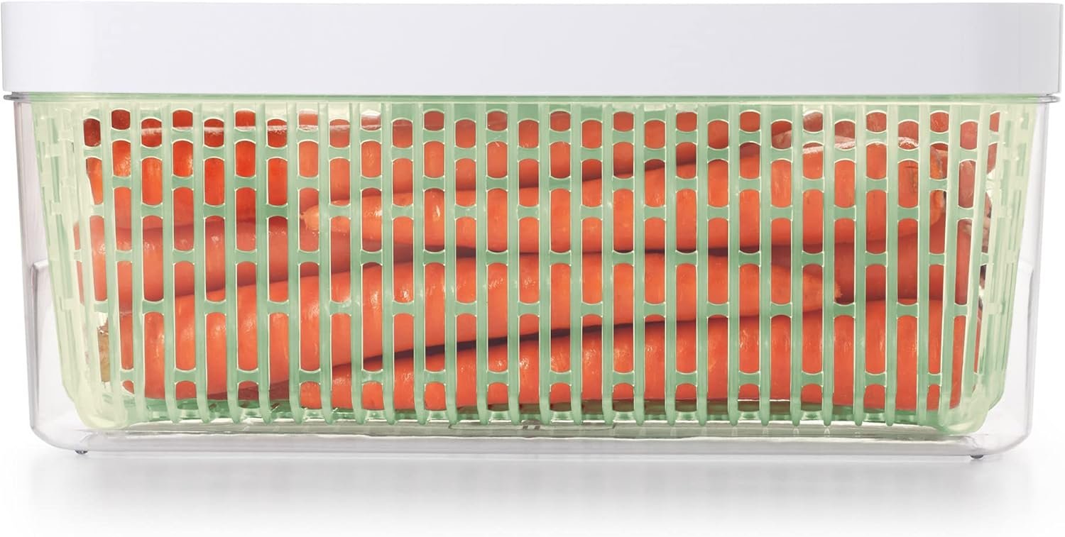 Brand-OXO Colour-Multicolor Material-Plastic Material feature-Non-Toxic, Food Grade Oxo Good Grips Greensaver Produce Keeper is made from high quality material. It is ideal for storing everything from berries and grapes to vegetables. The Produce Keeper will keep your fresh ingredients for longer with the activated carbon filters designed to trap and absorb ethylene gas. The baskets can also be easily used as colanders for rinsing fruit and vegetables. Carbon filter is non-toxic and all natural Carbon filter sits inside lid to absorb ethylene gas Elevated basket promotes air flow and prevents rotting Adjustable vent slides open and closed for optimal humidity levels Suitable for all fruits and vegetables Included components: 1 x oxo good grips greensaver produce keeper, 4.7 litre capacity
