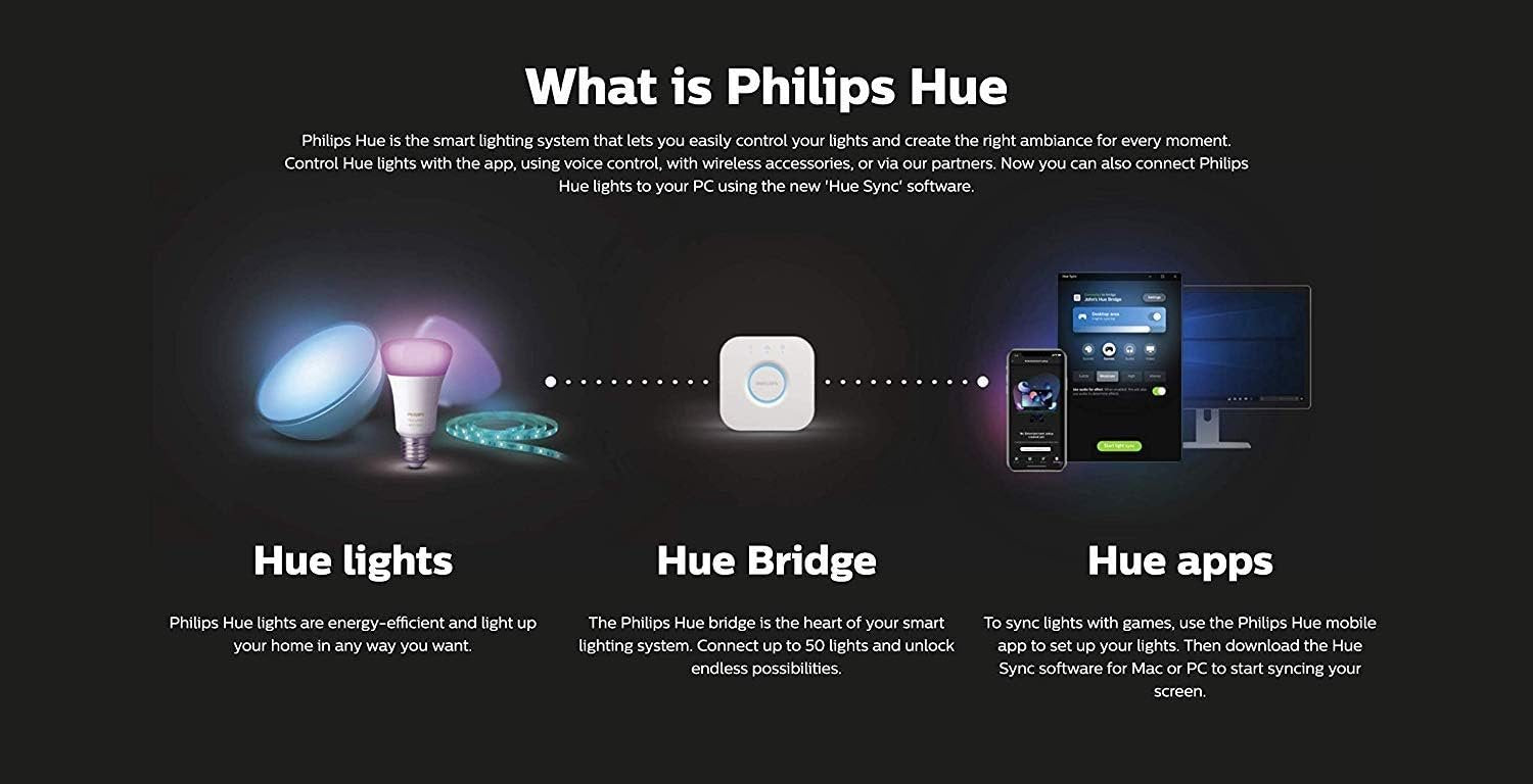 Voice Activated: The Philips Hue White and Color Ambiance Bar Light can be controlled using your voice when you have Amazon Alexa, Apple HomeKit, or Google Assistant enabled (Philips Hue Hub and Smart Home Device required and sold separately); Philips Hue smart lights can also be paired for home automation with your existing Nest products or Samsung SmartThings system Limitless Possibilities: Enhance your smart home with the Philips Hue Play; The design is aesthetically pleasing and will adapt well with any living room setup; Let you smart light stand on your cabinet to create a pleasant ambiance, mount it on the back of your TV or even lay it flat on the floor to brighten your walls from floor to ceiling Ultimate Tv Lightning Experience: Create the most beautiful backlight for your television; Just mount Philips Hue Play behind your screen using the clips and double-sided tape included in the pack, and enhance your viewing experience with splashes of light surrounding your television Easy Installation: Connect not only 1, but up to 3 Hue Plays to the same power supply unit, leaving enough room for other devices; With each additional Hue Play, your smart lighting experience becomes even more immersive; This base kit includes 1 power supply