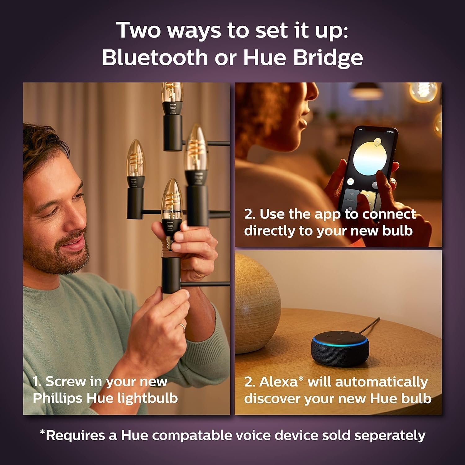 WHAT’S IN THE BOX - Includes two White Ambiance smart 40W-equivalent filament bulbs with an E12 candelabra base; Perfect for decorative light fixtures UNLOCK THE FULL POWER OF HUE - Add a Hue Bridge to enjoy automations, control from anywhere in the world, and a secure, stable connection that won’t drain your Wi-Fi. Use Matter to connect your smart home devices to your Hue smart lighting system. SHADES OF WHITE - Choose from shades of warm-to-cool white light to enhance your room decor and ambiance; Cool white light to focus or energize, warm white light to relax PERFECT FOR DECORATIVE LIGHT FIXTURES - The E12 candelabra base fits narrow sockets like those found in some chandeliers and wall sconces. VOICE CONTROL - Convenient smart control; Set up voice control in the Hue app and use simple voice commands to control your lights with Alexa or Google Assistant
