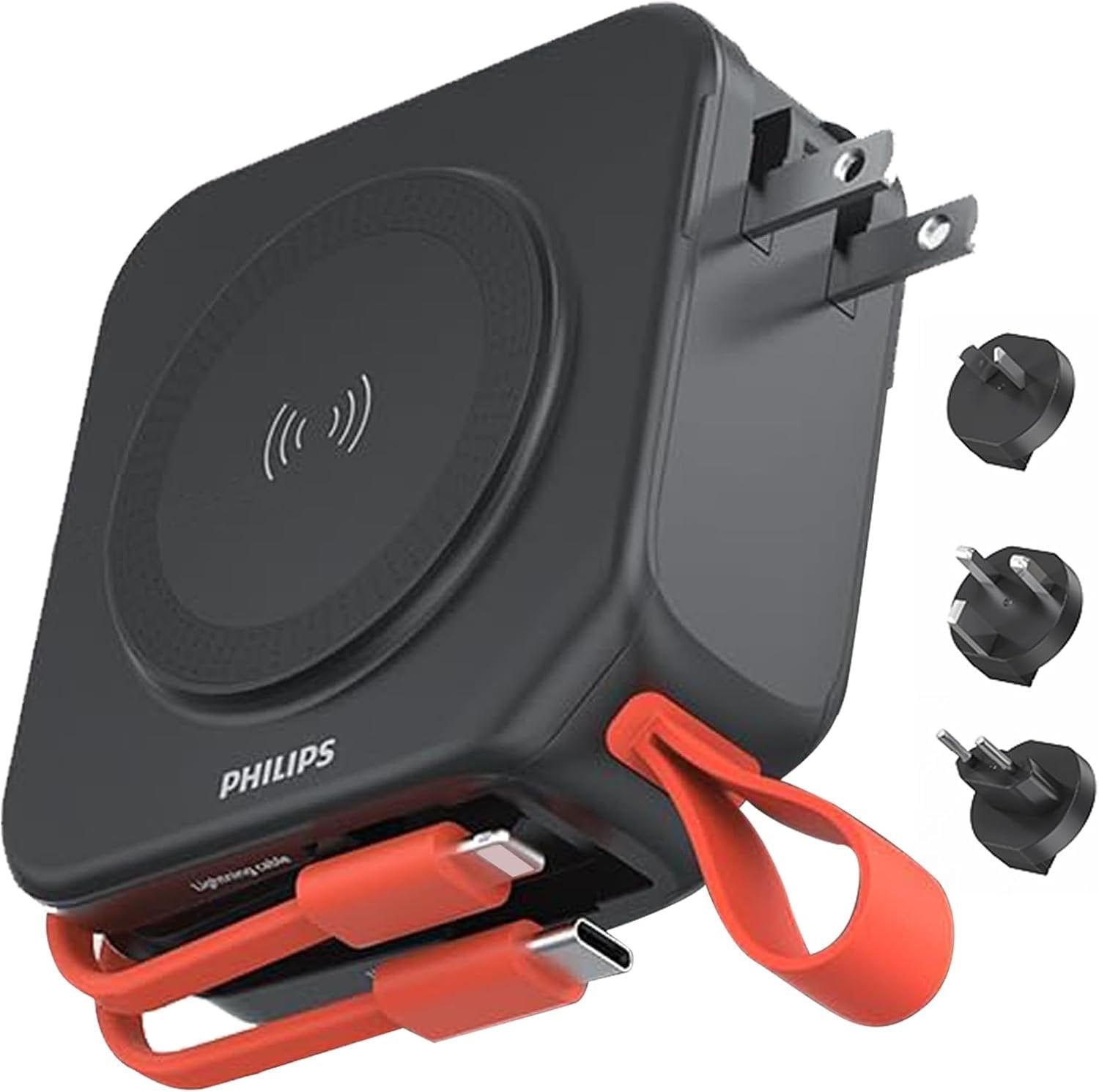 COMPACT DESIGN: Compact and Powerful Power up your latest iPhone or Galaxy series up to twice on a single charge, or utilize the 10W fast wireless charging feature. The Powerbank is a portable and efficient charging companion for your on-the-go lifestyle. FAST CHARGING: Fast Charging Convenience Eliminate cable clutter with the 10-in-1 Compatible with Magsafe PowerBank's integrated Lightning and USB-C cables. Enjoy rapid charging speeds thanks to its 20W Power Delivery technology. UNIVERSAL ADAPTER: Global Portability Designed for travel, the 10-in-1 powerBank includes interchangeable adapters for global use and a convenient travel pouch(bag) for adaptors by "Request only" to keep your charging essentials organized. Bring it with you anywhere of the world, so you will never run out of power. GREAT COMPATIBILITIES: Exceptional Versatility Compatible with a wide range of devices, from the latest iPhone 16 to older models and various Android smartphones such as Samsung Galaxy Series, the 10-in-1 PowerBank is a versatile charging solution for your tech essentials. SAFTY IS OUR TOP PRIORITY: Advanced Safety Your devices are safeguarded by the 10 in 1 PowerBank built-in protection against overcharging and excessive current, providing peace of mind during charging. WARRANTY AND CONFIDENCE: Philips offers up to a 2-year warranty. Enjoy peace of mind and buy with confidence. 30 days risk free to use, Try it and experience one of the best Travel Adaptor + Power bank. Package includes: (Philips Power Bank and Travel Charger (x3 Adapters EU, AU, UK) , User manual x 1. Travel Pouch(Bag) for adaptors by Request only.