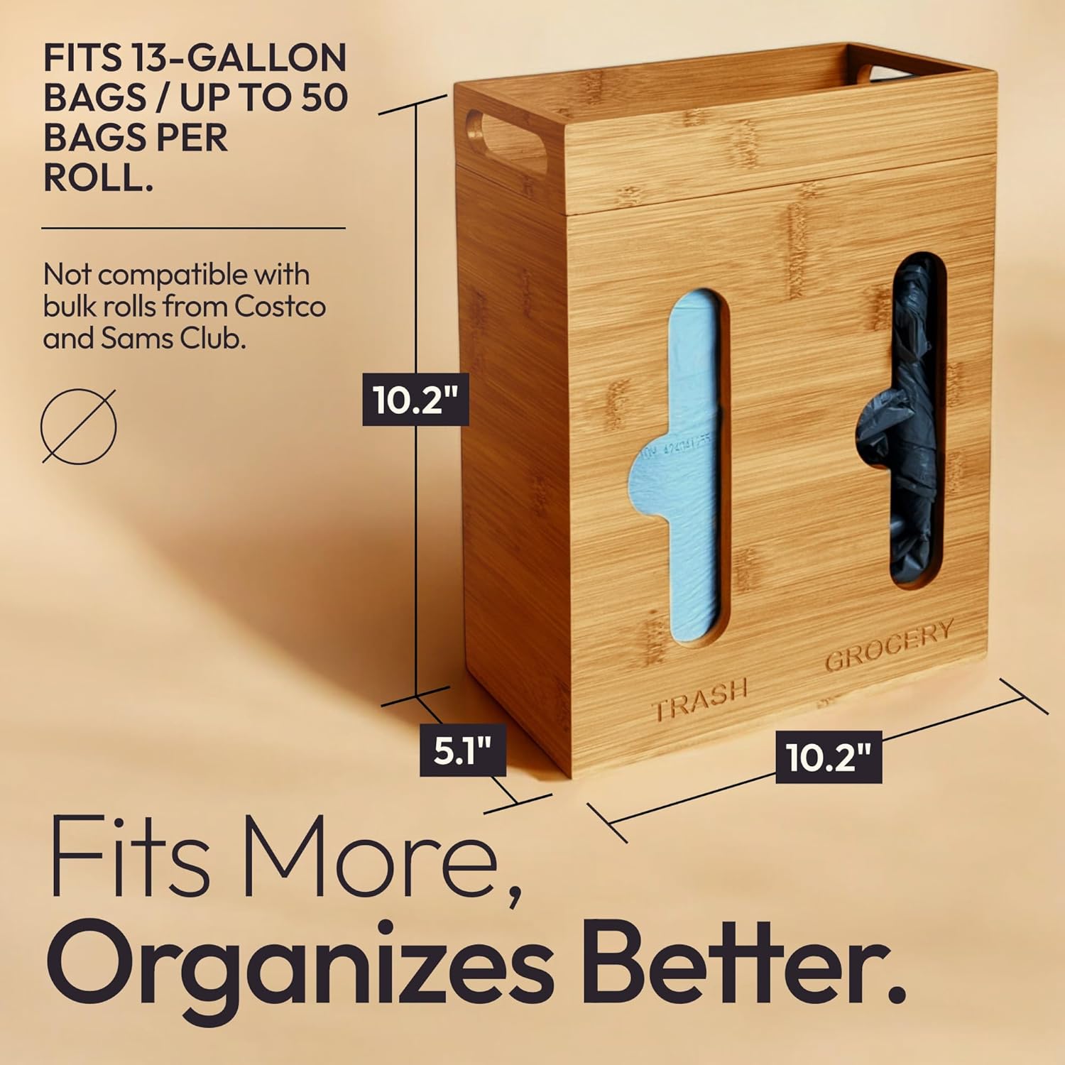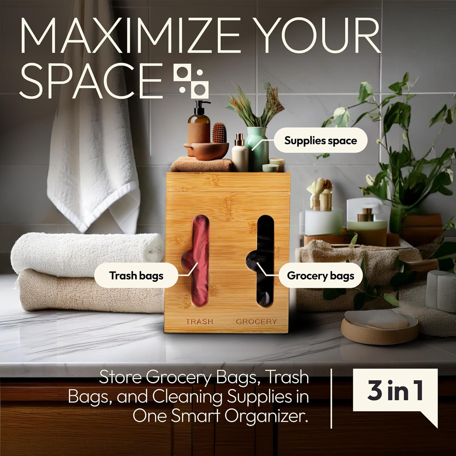 Plastic Bag Holder and Dispenser – Pantry Organizer for Kitchen Accessories - Under Sink Organizer and Storage for Kitchen Essentials - Bamboo Cabinet Dispenser and Trash Bag Holder