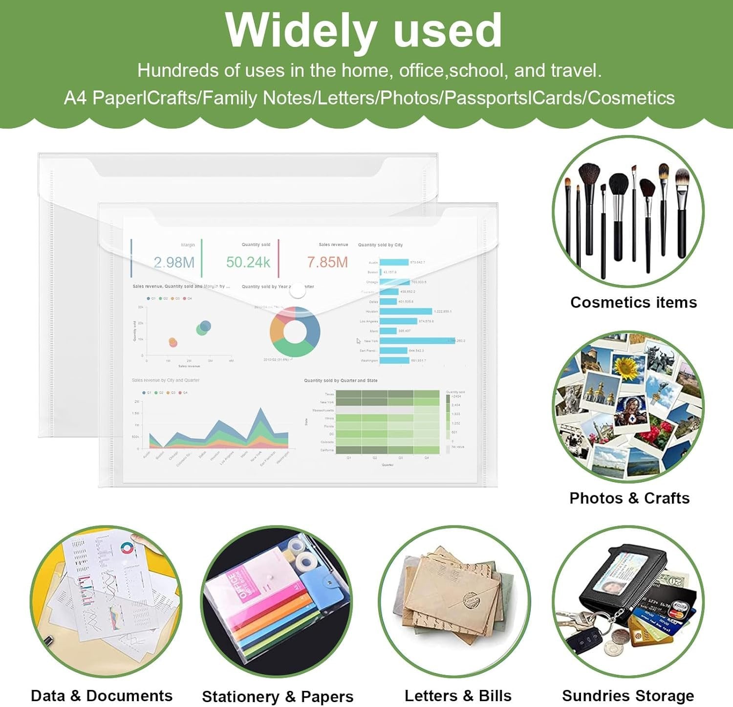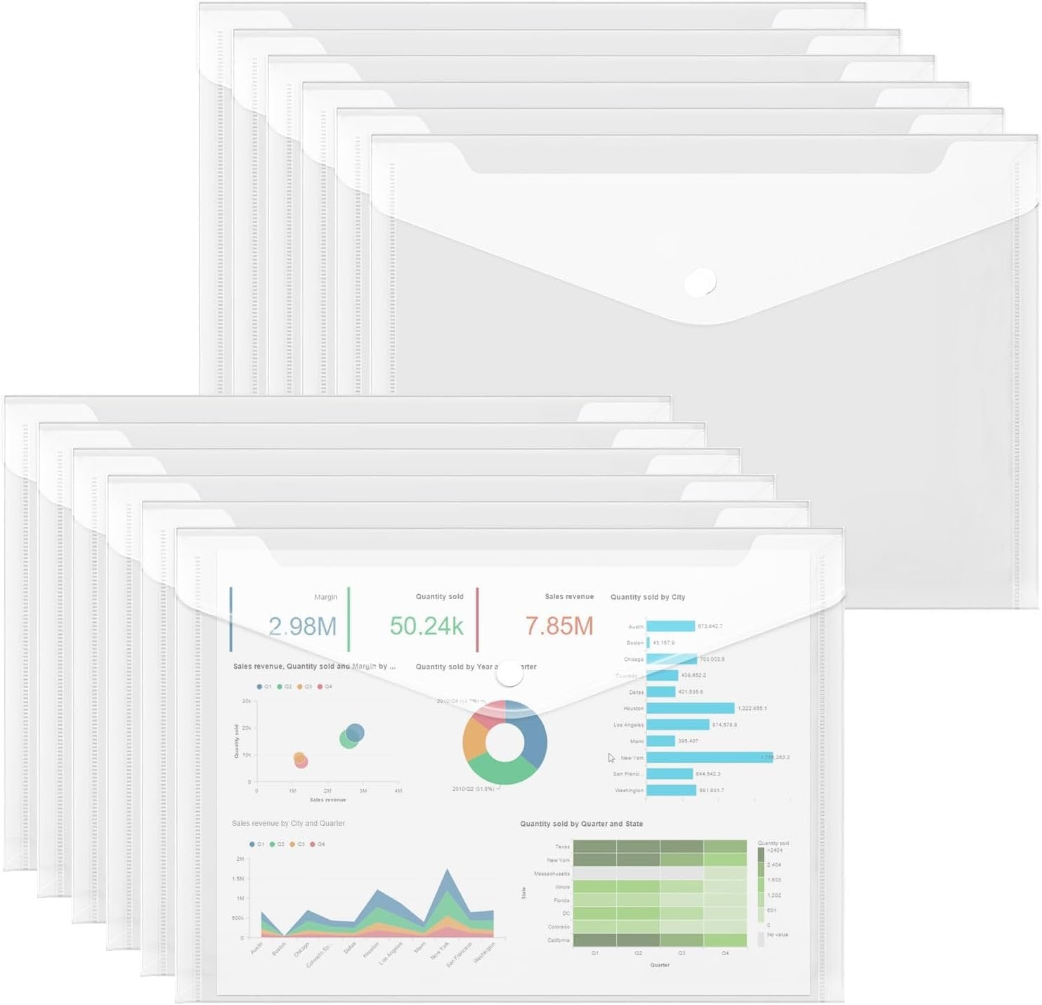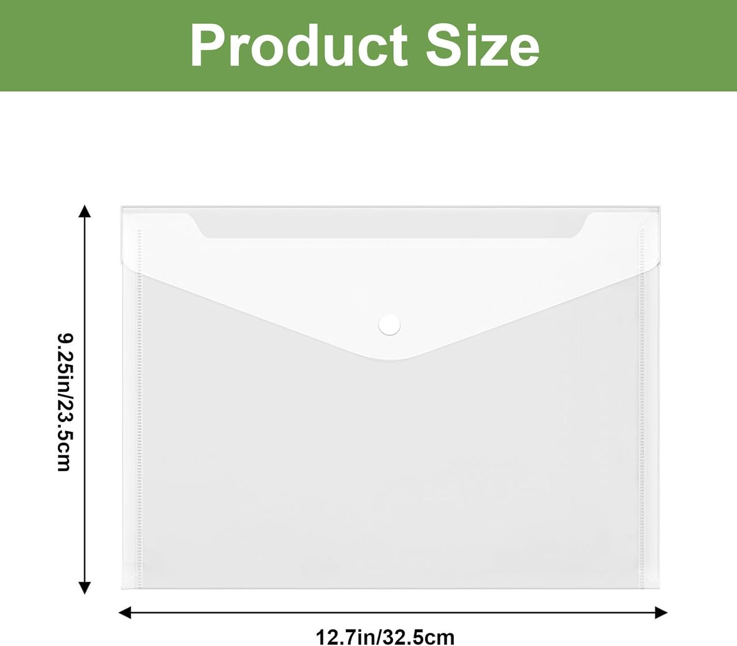 Size: The plastic file folder measure 32.5 x 23cm / 12.8 x 9inch Special Design: Clear document folders allow the contents to be seen at a glance, saving you time and improving your work efficiency Durable Material: Made of high quality plastic with upgraded thickness, you can safely use it to store important documents Snap Button Design: The snap button design allows you to open the filing envelopes easily. Buttons are made of plastic, can be used repeatedly, not easy to be damaged Wide Application: Filing envelopes are very useful to store office supplies, documents, receipts etc. Suitable for school, home, work, office and business travel
