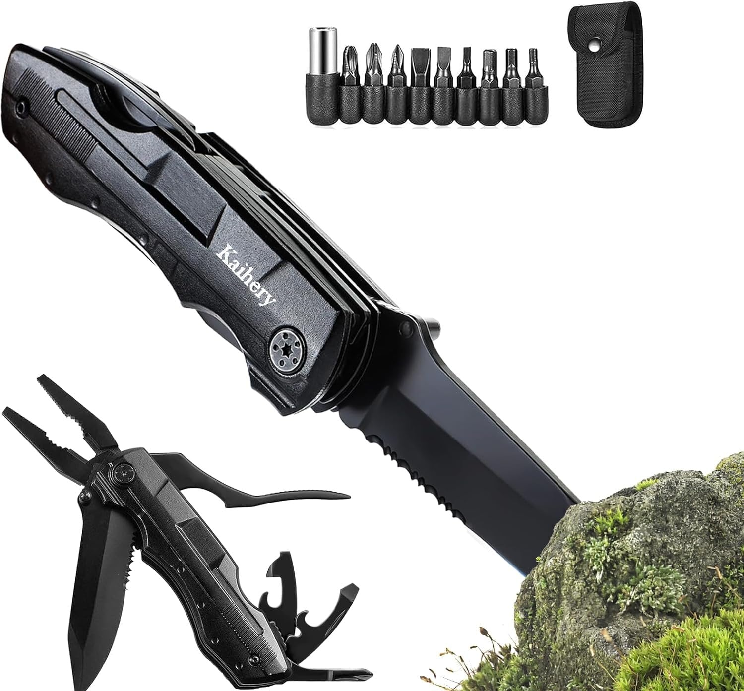 【Unique Gift For Men】: Are you looking for unique or cool gifts for men, dad, husband, grandpa, grandpa or teen boy who like outdoors survival, exploring, hiking, fishing, camping, or backpacking. Our folding pocket knife tools is a amazing stocking gifts at Christmas, Thanksgiving Day, Fathers Day, Valentines Day Anniversary Birthday. Camping knife with a nylon pouch for convenient carry on the belt is hiking essentials gifts. 【All In One Survival Gear】Multi tools-contains knife, saw, pliers, can opener and a screwdriver with a 9-in-1 bit set, which meet you different needs. The camping gadgets are your preferred tool for projects at home,at work or at camp sites. Knife with Safety Lock Design, with a simple push, you can easily slide out the hunting knife in a second!! 【Safeguard Locking Design】-To prevent from accidentally hurting your hands, The blade will be locked when it is open, and if you want to fold hunting knife, then you need to push inward internal lever to unlock and folding then you can close the blade. The camping multitools are strong and durable, coated with a black oxide to make the multi tools rust and corrosion resistant. 【Prepared for Any Emergency】: This camping accessories is the perfect companion to help keep you safe and have peace of mind while you're hiking, camping, hunting, fishing, backpacking,travel, home or daily use. with a nylon bag, which can be directly put on the belt and the bag for easy carrying. Which will bring you enough convenience. Camping Multitools Accessories 12 In 1 Multitools, Gifts For Men Dad Hunting Tools w Pliers Knife Bottle Opener Screwdriver, tools with Safety Locking For Camping Fishing Gear, Outdoorl