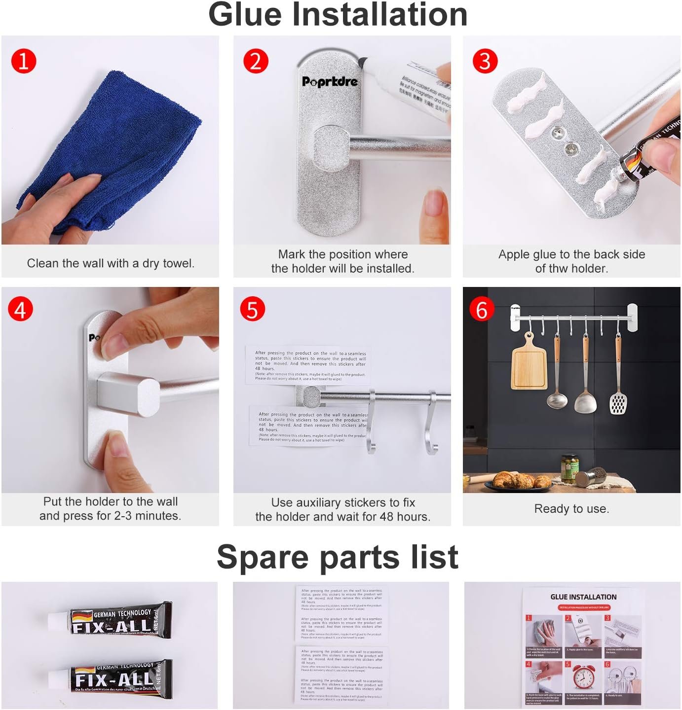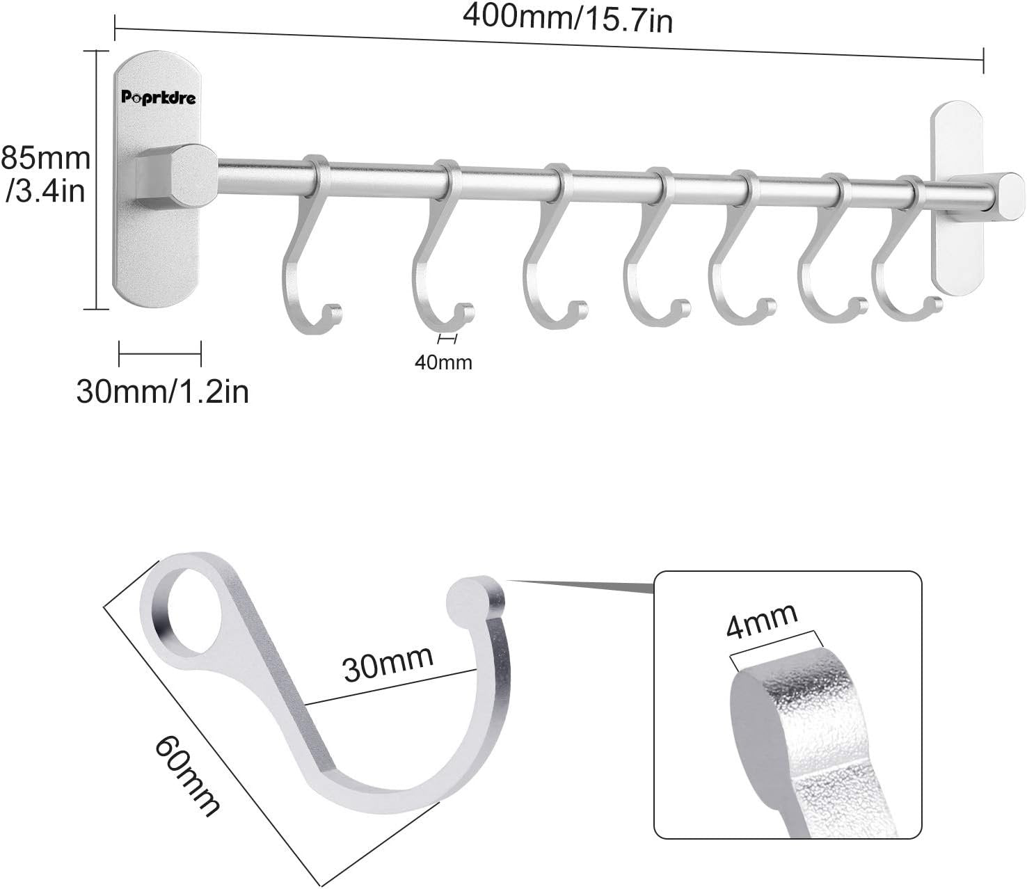 Poprkdre Kitchen Utensil Holder with 7 Hooks, 40 cm Kitchen Utensil Bar, Kitchen Utensils Holder for Kitchen Gadgets / Pot/Ladle, Aluminium, Matt Silver
