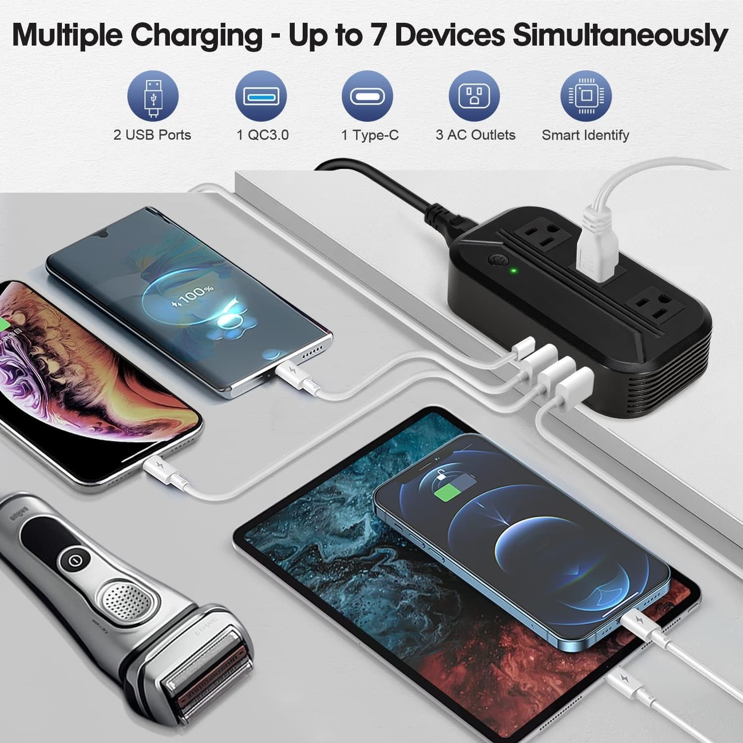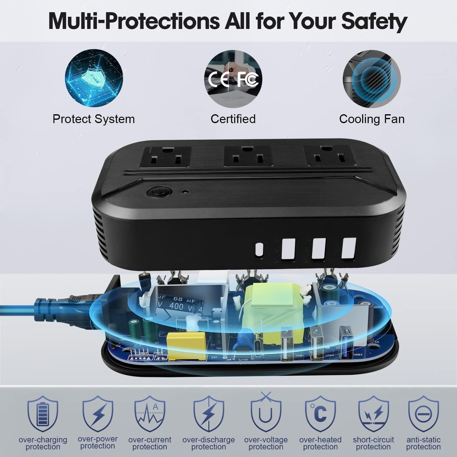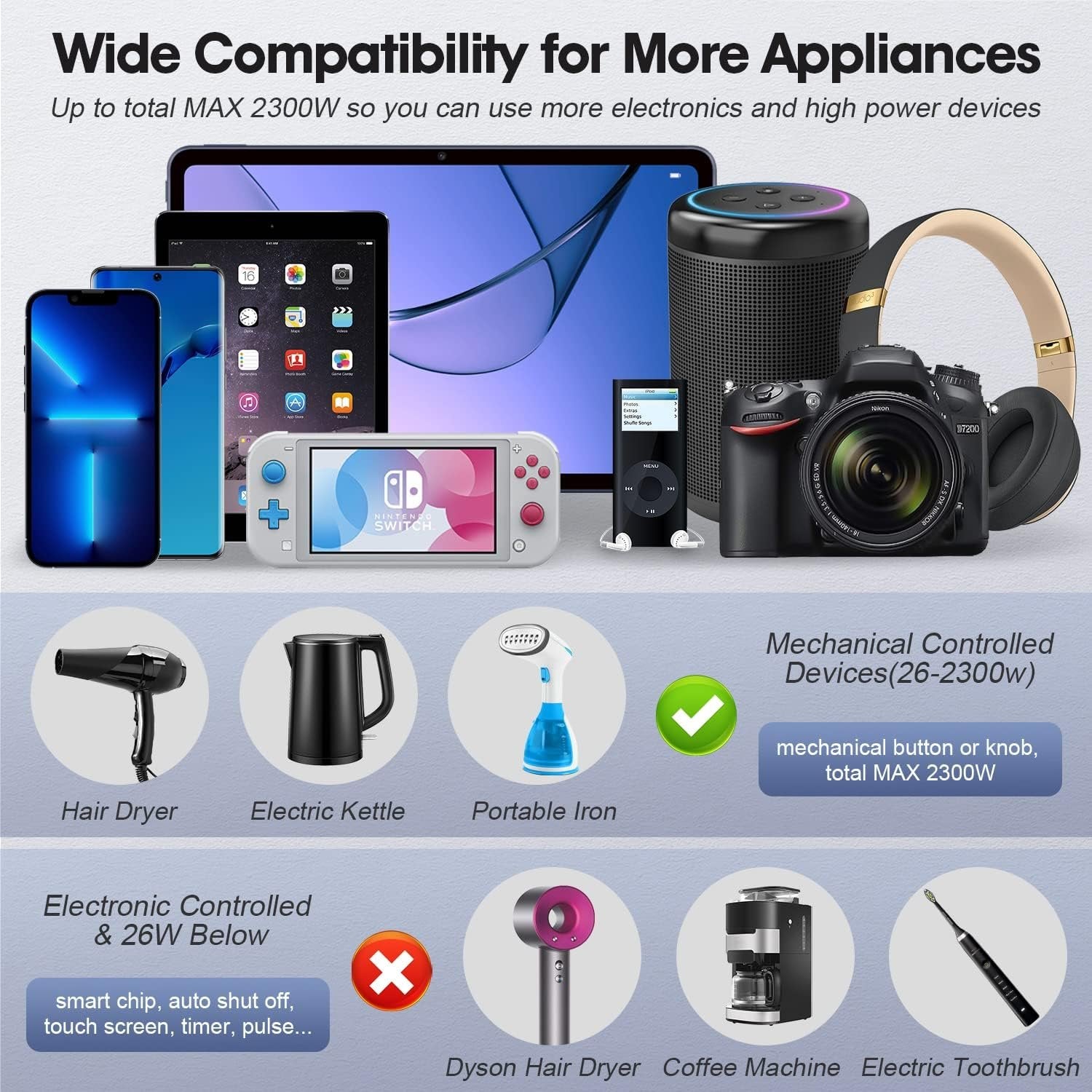 Power Converter w/ 7 Travel Adapters - This worldwide voltage converter helps to step down voltage from 240V/220V to 120V/110V, comes with EU cable plug and AU/IT/UK/US/India/South Africa travel adapters, which cover 200+ countries, it makes you to charge or use your CA standard 110V non-dual electronics when travel to any 220V countries all over the world. You don’t have to worry about the charging or buy an expensive transformer at local store anymore while traveling Upgraded High Power for MORE Appliances - With high 2300W total power, this converter will be able to compatible with more electronics, not only work on cell phone, laptop, tablet, blue-tooth speaker, but for hair dryer, air purifier, rice cooker, electric kettle, etc., it will work as long as your devices are Mechanical Controlled and between 26W - 2300W 【If you’re not sure about the compatible of your devices, please contact us to confirm before the purchase】 International Voltage Converter & Adapters for Travel - Portable compact size and all-in one design make this power transformer a great and must-have companion for overseas travel. With 3 AC outlets and 4 USB ports which also including Type-C & QC charging, you can use it to charge multiple devices simultaneously, even for a family travel! unlike traditional converters which tend to be large & heavy, our special design converter is definitely practical for traveling Must-have Universal Power Adapter Converter - You go abroad, you need a power transformer for sure unless all your devices are dual voltage. It helps to solve the electronics using problem no matter which country you’re going to, and with our 12-month-limited, it definitely worth a try! Any concern or confusion, please ask a question or contact, we are more than happy to be of assistance anytime Safety & Sustainable Travel Converter - Designed with over temperature, over-current, over-voltage, short circuit protection and surge protection, plus with quiet dual cooling fans on both sides for heat-reducing, our converter will run under stable condition and provide a security using of your devices, no worry about blow a fuse or knock out hotel power, which is also a security for yourself 【Our converter is certificated by ETL, CE, FCC, and CSA C22.2 safety test from ISO/ILAC 17025 Lab.】 IMPORTANT to Check Before the Purchase - As we advertised on description and pictures, this voltage converter will NOT work for electronic controlled devices that operated by smart chip, auto on/off, touch screen, timer or pulse function etc.. Please do make sure that your devices are mechanical controlled which has a push side to side on/off button. If you cannot confirm, please contact us via email or "can you answer", we would like to help