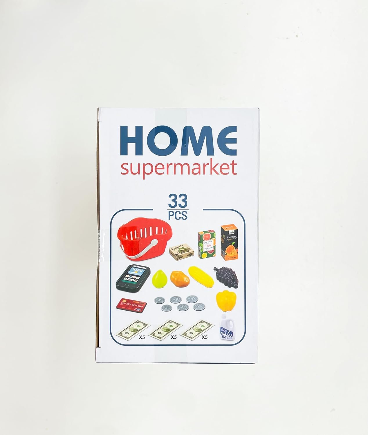 Pretend Play Cash Register Toy Role Play Shopping Cashier Playset with Scanner Card Machine Toy Foods Fruits 33pcs Set Funtional Checkout Game Educational Toy for Kids Birthday