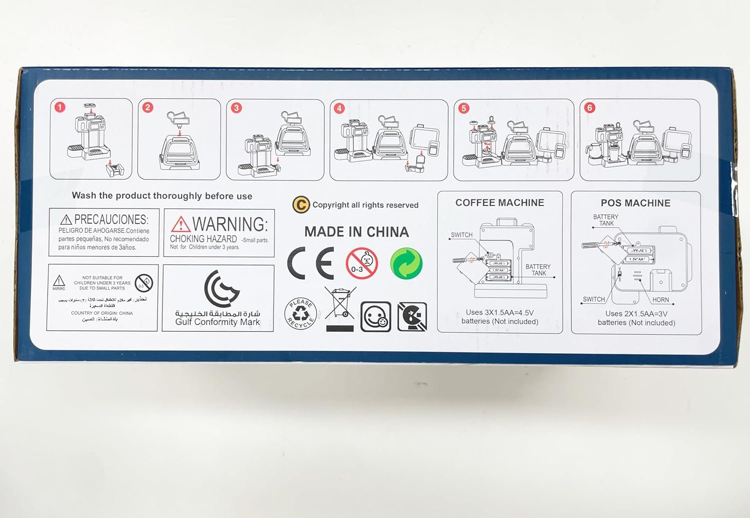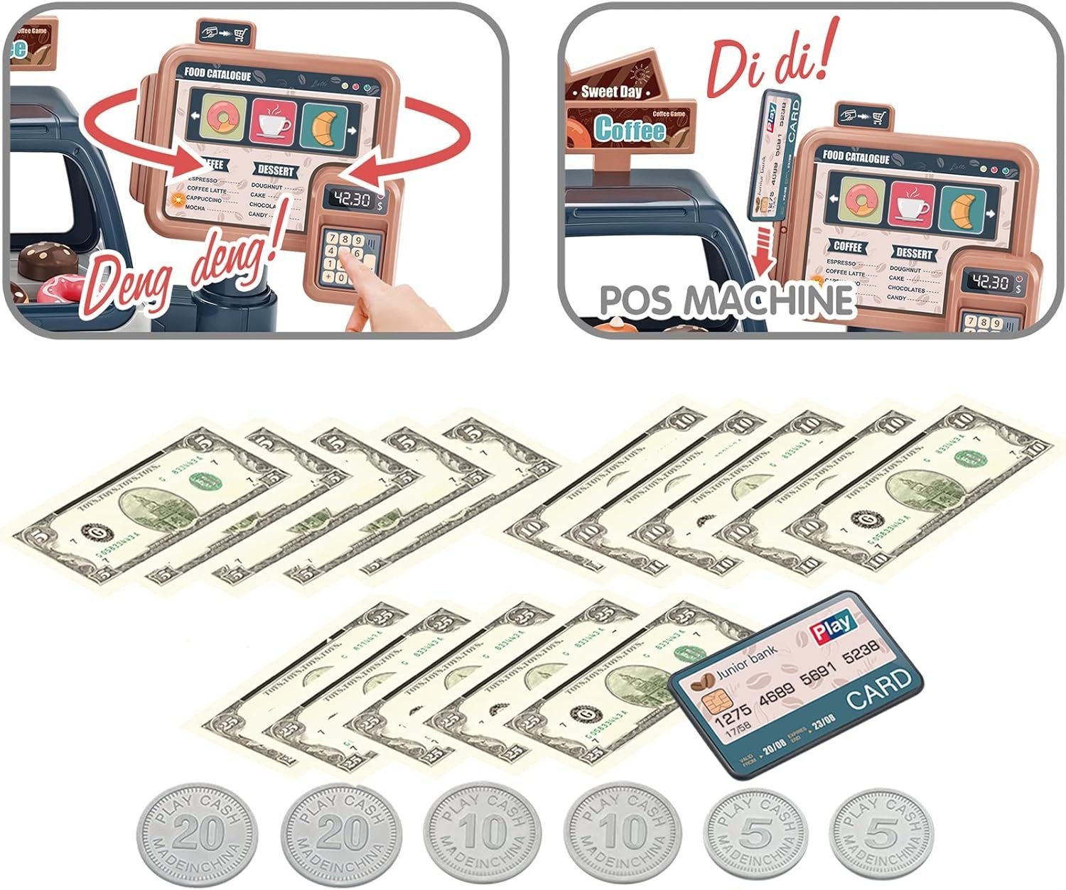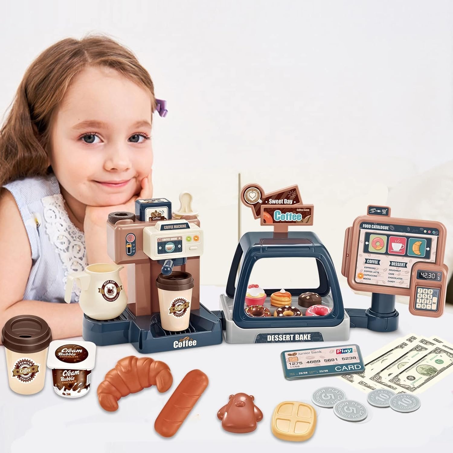Functional coffee machine toy with sound,including coffee handle, powder press,creamer pitcher,coffee cups,kids can pour water to make coffee,pretend play the whole process of coffee extraction,also learn more about coffee shop. Fun and colorful desserts,including donuts,cake,cupcake,cookies,bread,croissant.Kids can pretend play tea party,bakery,baking classes and so on,exercise child's cognitive abilities. Simulated cash registers toys can make sound when swiping,come with credit card,coins and prop money, kids can learn how to pay,practice arithmetic,know about shopping in real life. 3 in 1 toy,suitable for multiplayer,can play indoor or outdoor with friends or family,role play coffee shop,share fun with each other.Exercise your child's imagination to find more play way. A great educational toy,help kids to learn more about life. Perfect present for kids rewards, birthday,Christmas,parties.