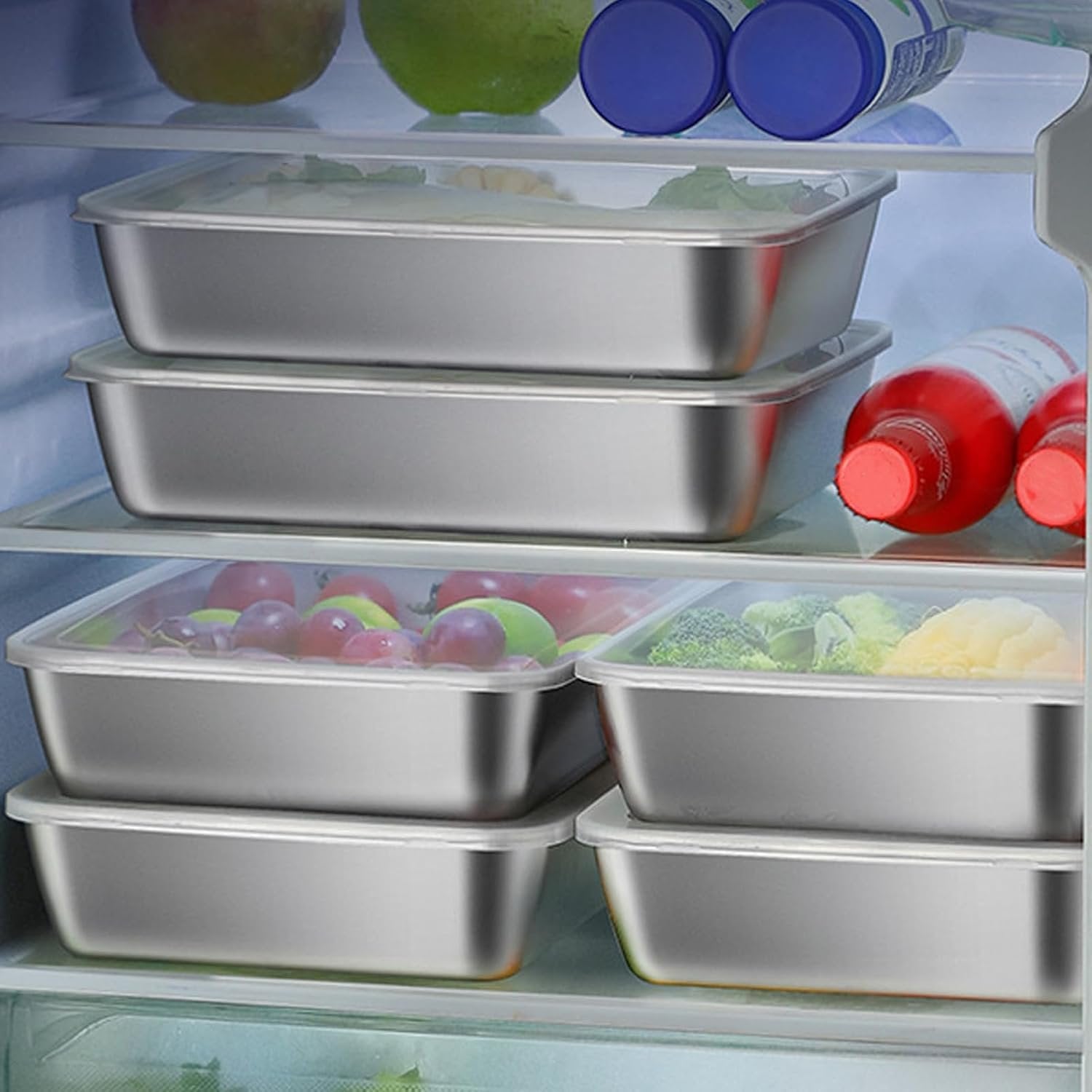 Food Storage Container Stainless Steel Food Storage Containers with Lid: PRITOK Pack of 5 1100 ml Food Storage Container Meal Prep Boxes, Reusable Freezer Containers, Food Storage Box, Suitable for Freezer, Dishwasher Oven Safe Features: 1. Stainless steel food storage containers are made of durable, food-safe stainless steel, ideal for safe storage, freezing and oven cooking. They are durable, easy to clean and stable. 2. Reusable freezer containers come with a sealing lid that can effectively prevent the spread of food odours and preserve the freshness of the food. 3. Stackable food storage containers save space and facilitate organisation. They are versatile whether in the freezer for fresh food or in the oven for delicious dishes. Specification: Material: stainless steel. Size: 18.2 x 13 x 5.9 cm. Colour: silver. Package weight: approx. 650 g. Packing list: 5 x stainless steel food storage containers.
