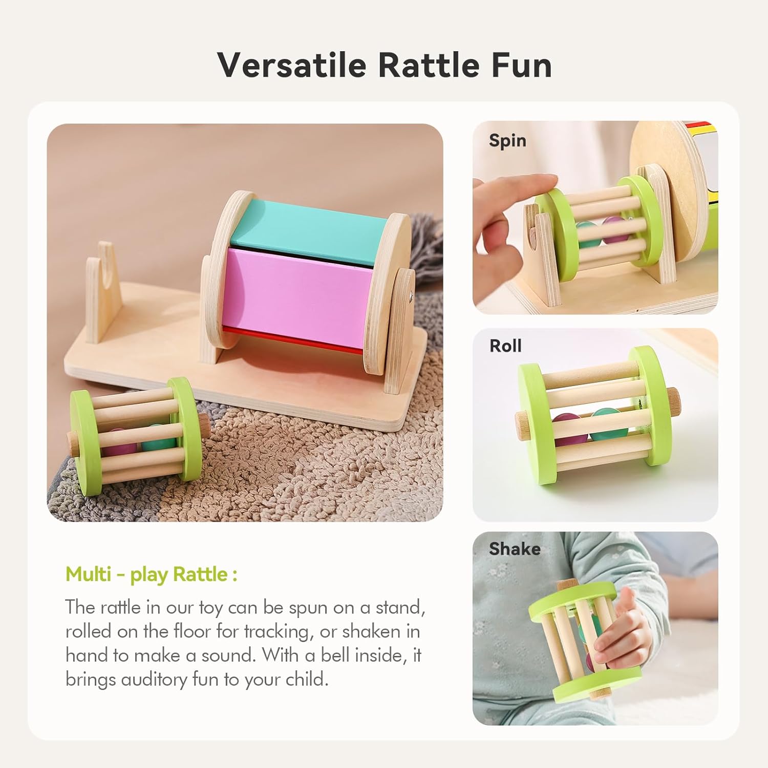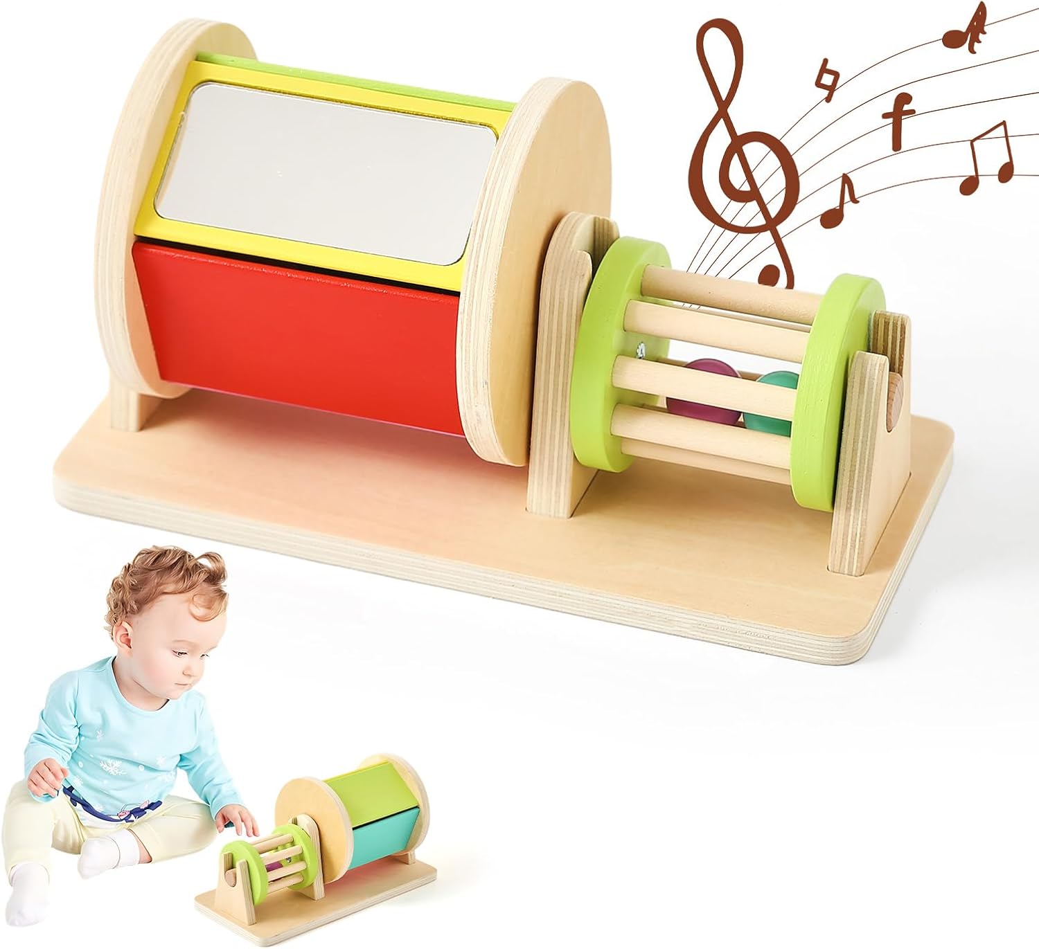 PLAY & LEARN - Give your baby the gift of stimulation and feed their curiosity with this colorful rotating montessori drum. The rainbow drum contains 5 colors as it spins by the baby's hand. There is also 2 small bells inside the drum that make a gentle sound when it's spinning. DEVELOPMENT - The spinning drum promotes gross motor skills. Babies will be drawn to the bright colors and will love hearing the sounds of the drum spinning. The slight twisting motion helps your child develop arm and wrist muscles. It also helps babies recognize colors and stimulate sensory development. PREMIUM QUALITY - Yaani’s Montessori toys are made with the highest quality plywood from sustainable sources – Family fun made with safety and durability in mind. PERFECT GIFT – Yaani’s Rainbow Drum is the perfect gift for a young baby or toddler. Give the gift that's surely to be a hit for generations to come!