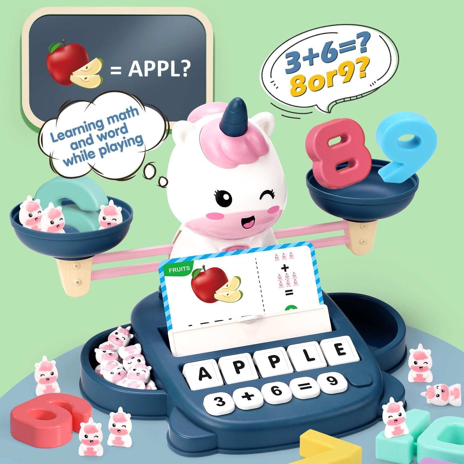 Qizebaby Toy for 3 4 5 6 Year Olds,Unicorns Learning Toy Balance Counting Math Toy with Matching Letter Spelling Games,Math & Cards Learning Preschool Educational Game,Kid Toys Boys Girls