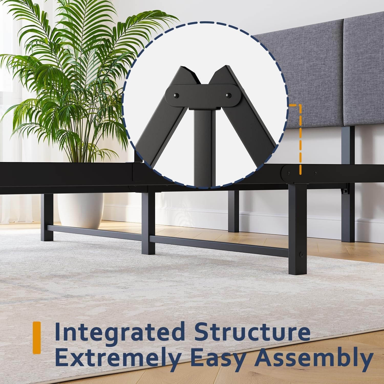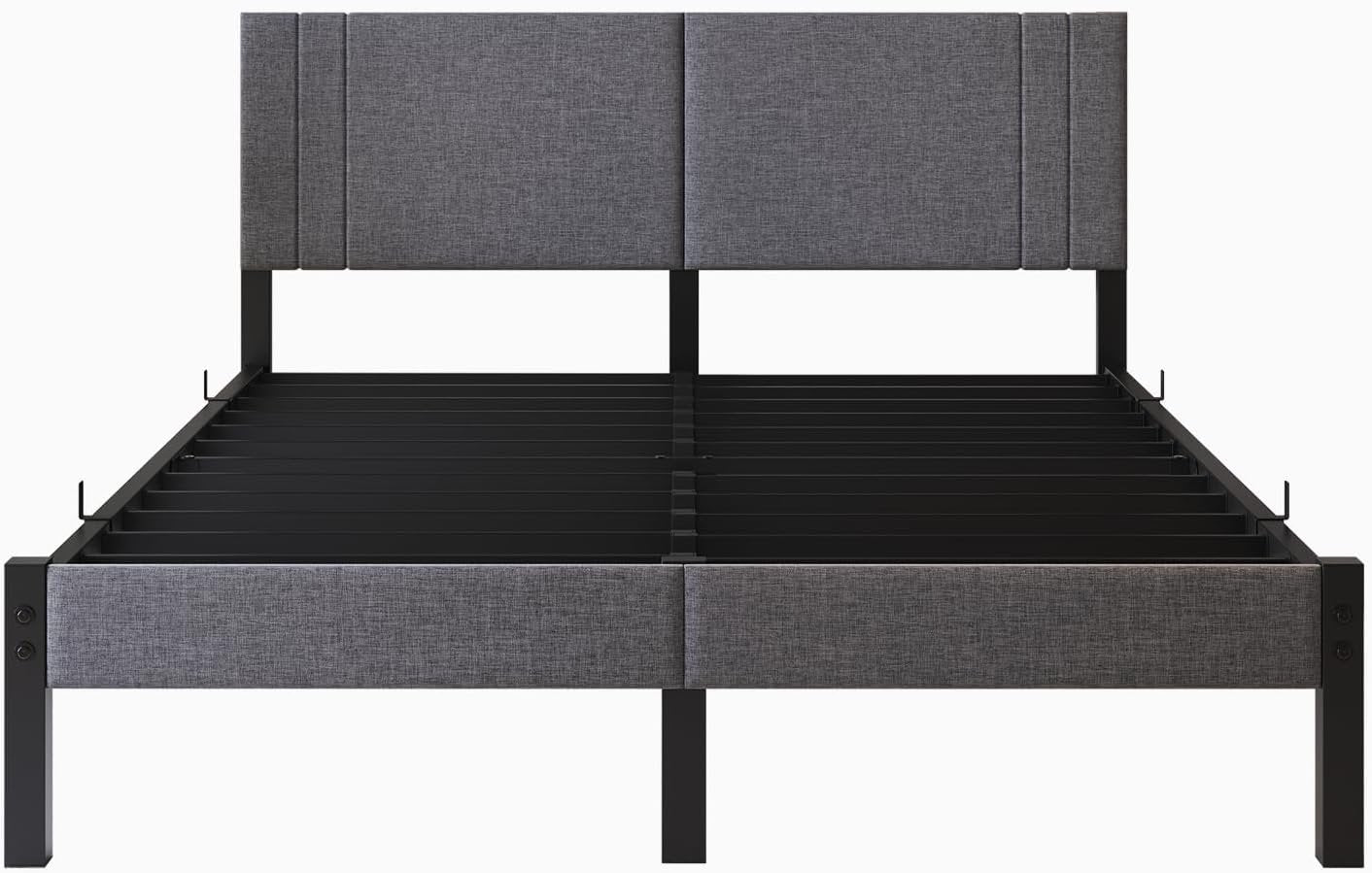 【Sturdy Structure】 The queen bed frame is built of heavy duty metal steel structure and upholstered headboard with high-density foam padding. Adding bottom connecting tubes on side legs to enhance support, more sturdy and stable, reduce sagging and distortion, extend mattress and bed life. 【Comfortable Upholstered Bed Frame】Upholstered queen bed frame is soft and cozy. It is a thoughtful design of this cushioned backrest that your fatigue from the day will be completely released here. Anti-slip plastic foot pads protect floor from scratch and noise. 【Modish Design】Simply and generous geometric design, dark gray linen fabric with vertical line pattern, skin-friendly, breathable and wear-resistant. Appearing classic and lasts forever, suitable for varieties of room styles. 【Product Size】Bed Frame Queen Size: 82.2” x 60” x 35.6" (L*W*H). 11” bottom provides ample under bed storage space, making full use of the space and conveniently storing various items, keeping your bedroom organized. 【Easy Assembly】Bed frame comes with clear instruction and all labeled parts, no additional tools are required. Everything is efficiently packed into a box for easy assembly and delivery.