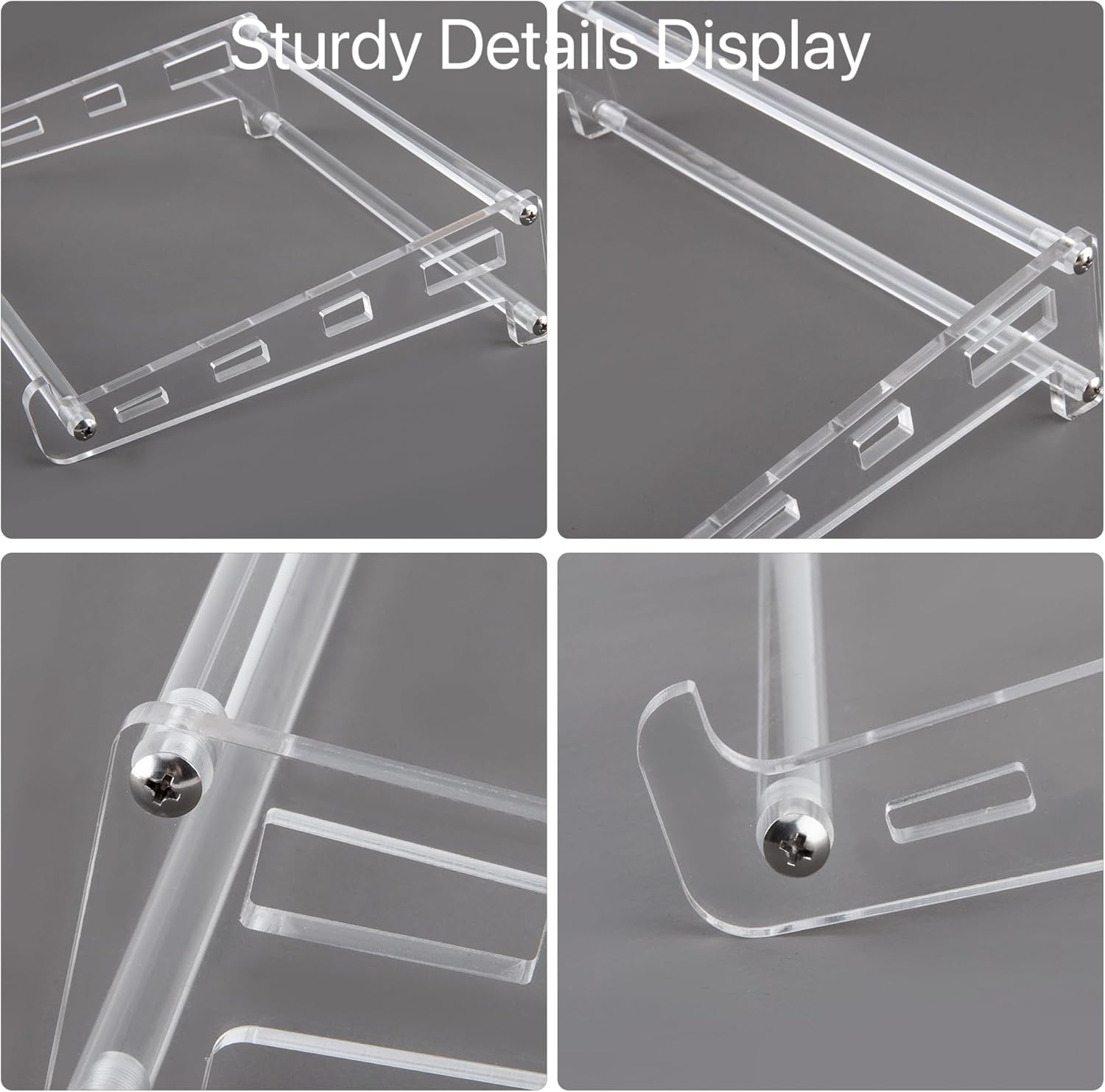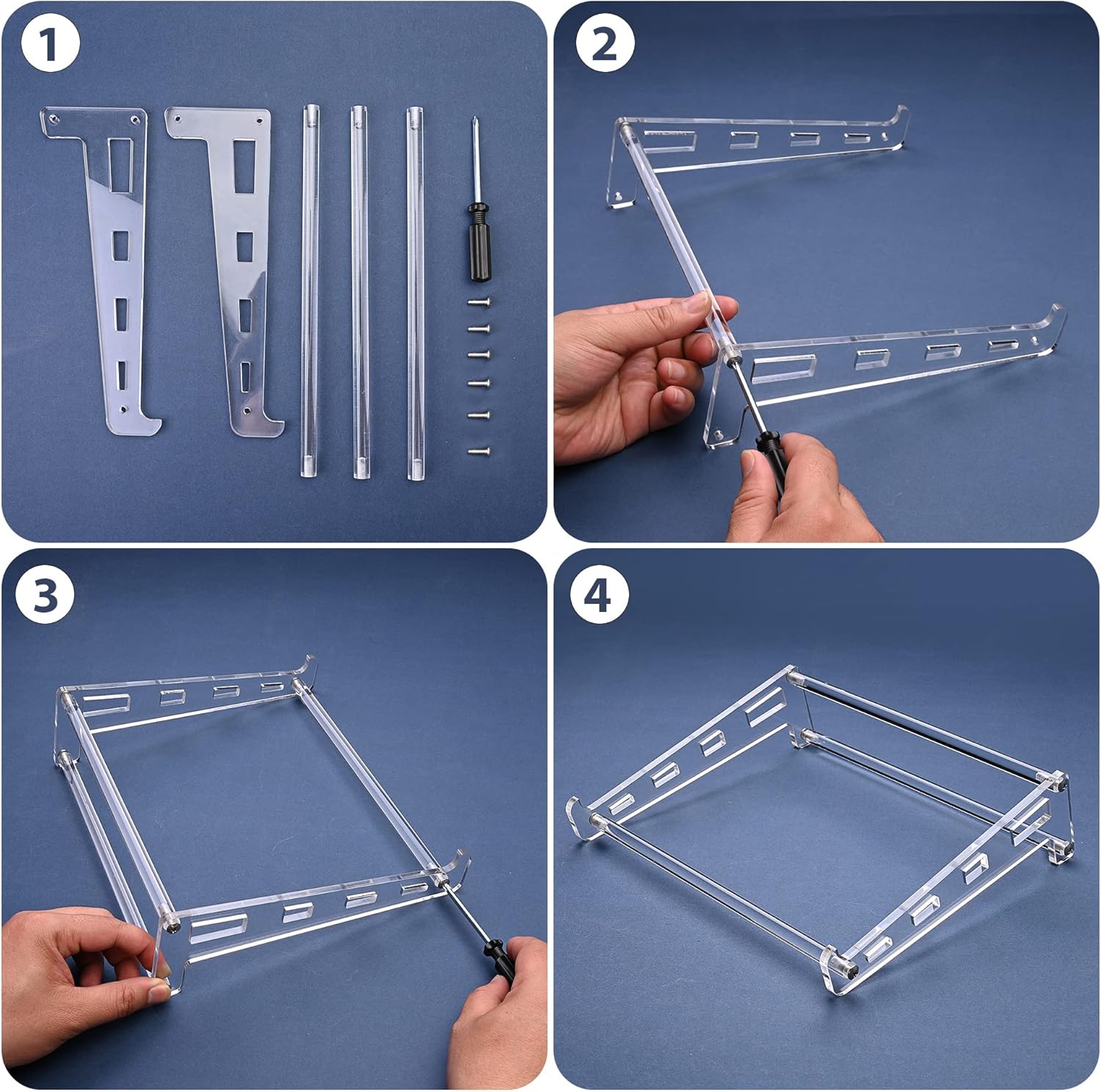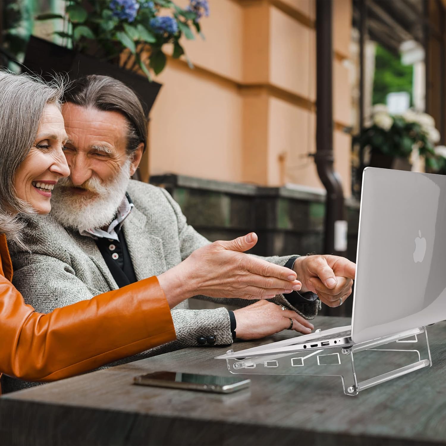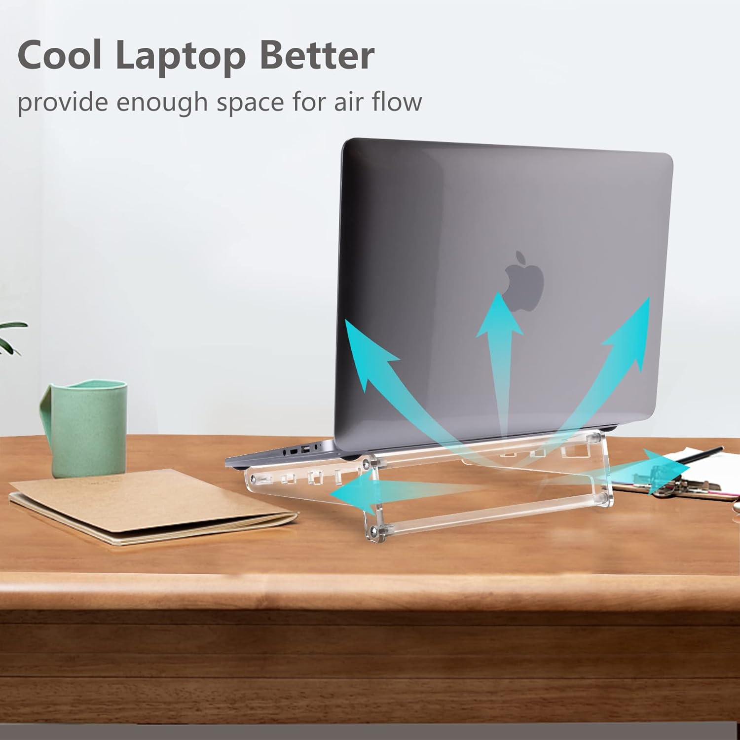 【Stable & Sturdy】This laptop stand is made of high quality acrylic, it is thick, sturdy and durable,The crystal-clear high transparency appearance creates a new experience for you. 【Wide Compatibility】Compatible with all laptops 10 to 17 inches, such as MacBook/MacBook Air/MacBook Pro/Microsoft Surface/HP/Dell/Google/ASUS/Lenovo Thinkpad and other notebooks. In addition, this is also a great choice as a gift for family and friends! 【Cooling & Ventilation】Our acrylic laptop riser only has three horizontal holders on middle part, which provides enhanced ventilation and airflow and keep your laptop from overheating. 【Easy To Install】This clear laptop stand for desk consist of three horizontal bars and 2 panels on two sides. Simple structure design make it easy to install, just need about 2 minutes to complete it. Panels is 5mm thickness, sturdy and provide perfect support for your notebook. 【Perfect view angle】The laptop stand can raise your laptop up to 3.2 inches,offer an ideal viewing angle, beneficial to relieve your neck, shoulder, back, and eye strain while you are watching, reading, or writing. It is a good assistant to help you correct your posture.