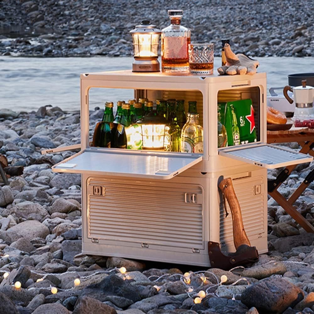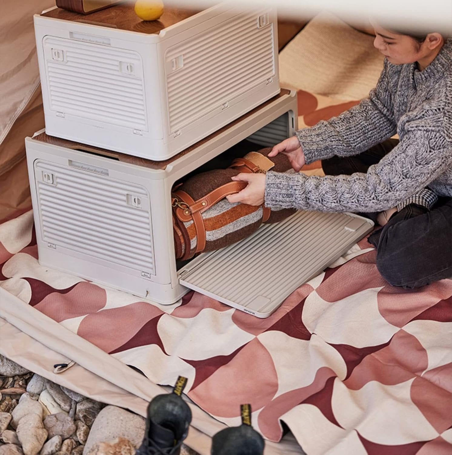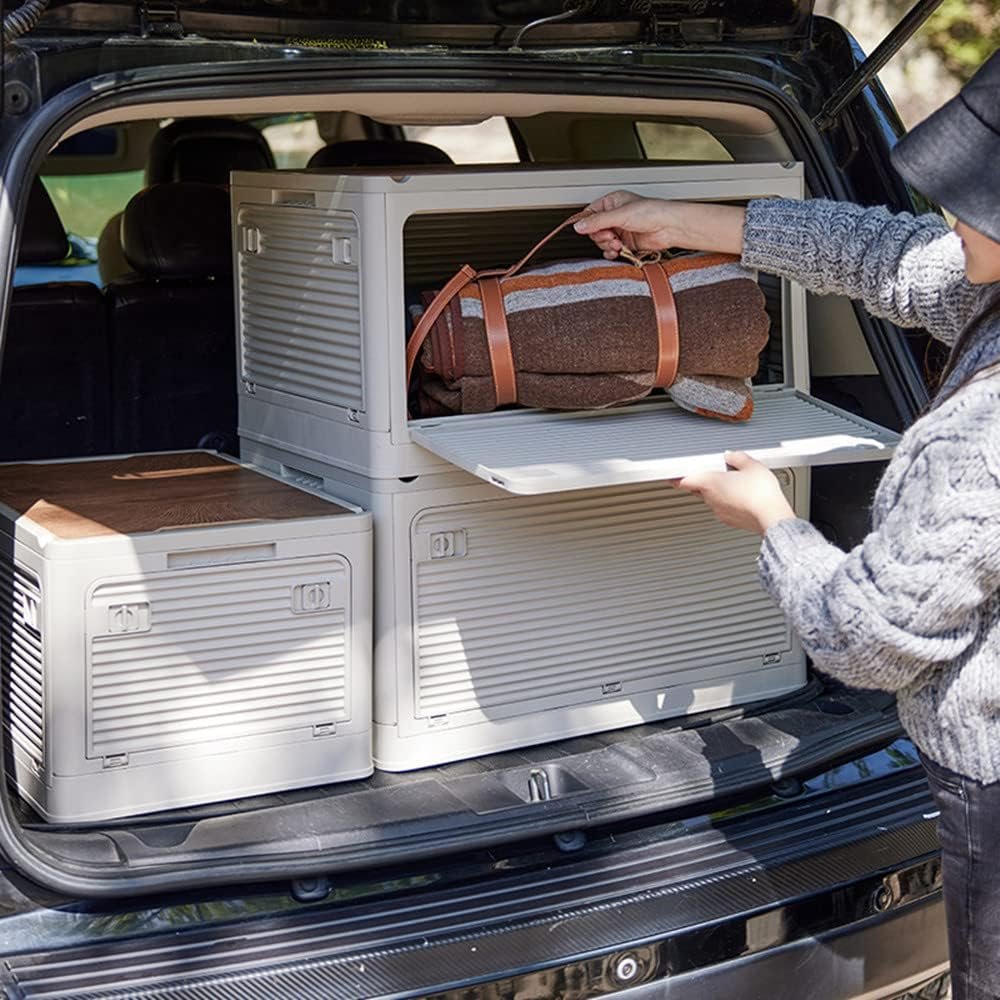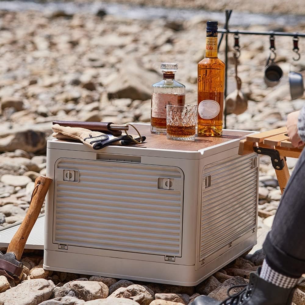 The expanded dimensions: 44.5 X 31.5 X 25.5 cm ≈ 17.52 x 12.4 x 10 inch. The folded dimensions: 44.5 X 31.5 X 7 cm ≈ 17.52 x 12.4 x 2.75 inch Durable Material: Use PP+HIPS+density board material which enables it to possess the features of anti-deformation, no odor and durability and guarantees a long service life. Collapsible Design: Our storage box is a collapsible and install-free storage bin. It allows to fold flat when not use and you don’t need to keep instructions to remember how to assemble and reassemble or use tools to operate it when you want to use it. Original four-sided door design: you could open lid on the top or open from the left, right, front and back door. It is very convenient for storage and access. Versatility: This collapsible storage boxes is a multi-purpose organizer. The top wooden Lids design can not only be used as a table, but also can be used as a cutting board. Perfect for indoor and outdoor use