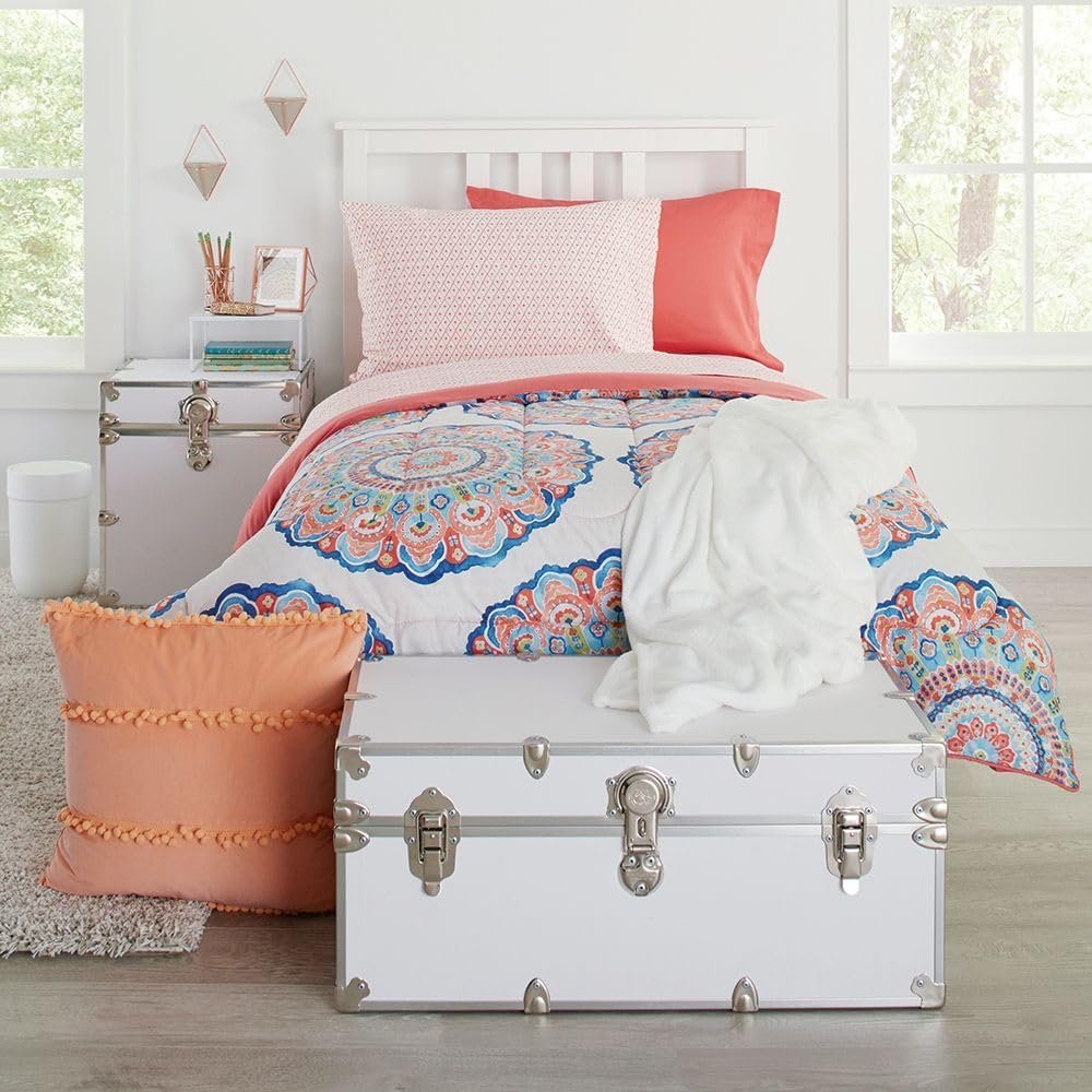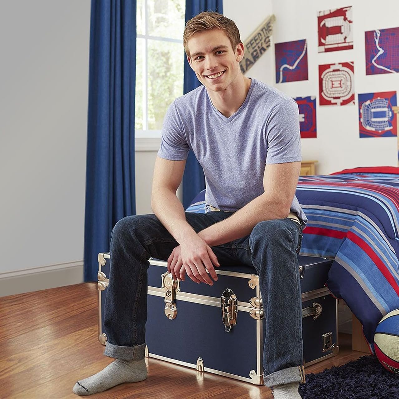 LARGE LEATHER EMBOSSED VINYL TRUNK FOR SUMMER CAMP - This large leather embossed vinyl trunk for summer camp is built to last, tough as a Rhino and strong enough to jump on. Made in the USA with durable nickel-plated steel hardware, with exclusive "no slam" soft close safety lid stay to keep the lid from slamming shut, 3/8" Baltic Birch plywood laminated with our custom vegan leather embossed vinyl. LARGE LEATHER EMBOSSED VINYL TRUNK FOR COLLEGE - This large leather embossed vinyl trunk for college can be used for secure storage, a coffee or end table and more. Your personal items will be safe in this lockable trunk. Thick, heavy-duty nickel-plated steel hardware, a soft close safety lid stay and stylish trunk lock with a loop for attaching a padlock. Extremely strong, can be used as a bench or step up to a loft bed. LARGE LEATHER EMBOSSED VINYL TRUNK FOR HOME STORAGE - This large leather embossed vinyl coated polyester trunk for home storage can be used for home furnishings, toys and games, a hope chest, seasonal storage and more. Laminated with tough scratch and water resistant Rhino leather embossed vinyl over 3/8" Baltic Birch plywood. Tight fitting steel tongue and groove lid to base closure keeps out moisture, dirt, insects and odors. LARGE LEATHER EMBOSSED VINYL TRUNK FOR DECORATING - Design your trunk right with this large leather embossed vinyl trunk for decorating. Ideal for decorating & plastering with decals. INCLUDES GENUINE LEATHER HANDLES - This made in the USA large leather embossed vinyl trunk includes genuine leather trunk handles for a comfortable grip.
