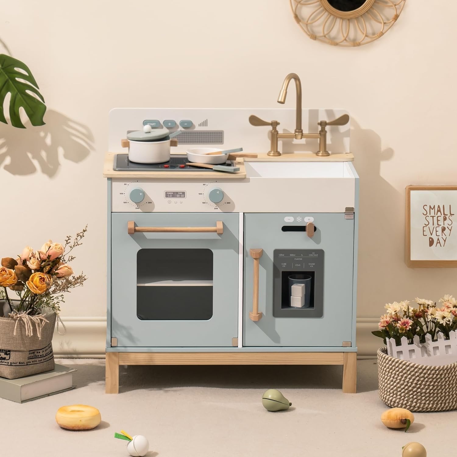 ROBOTIME Play Kitchen for Toddlers, Wooden Kids Play Kitchen Playset with Real Lights & Sounds/Ice Cube Dispenser, Pretend Play Montessori Toy Kitchen, Gift for Ages 3+ (Blue)
