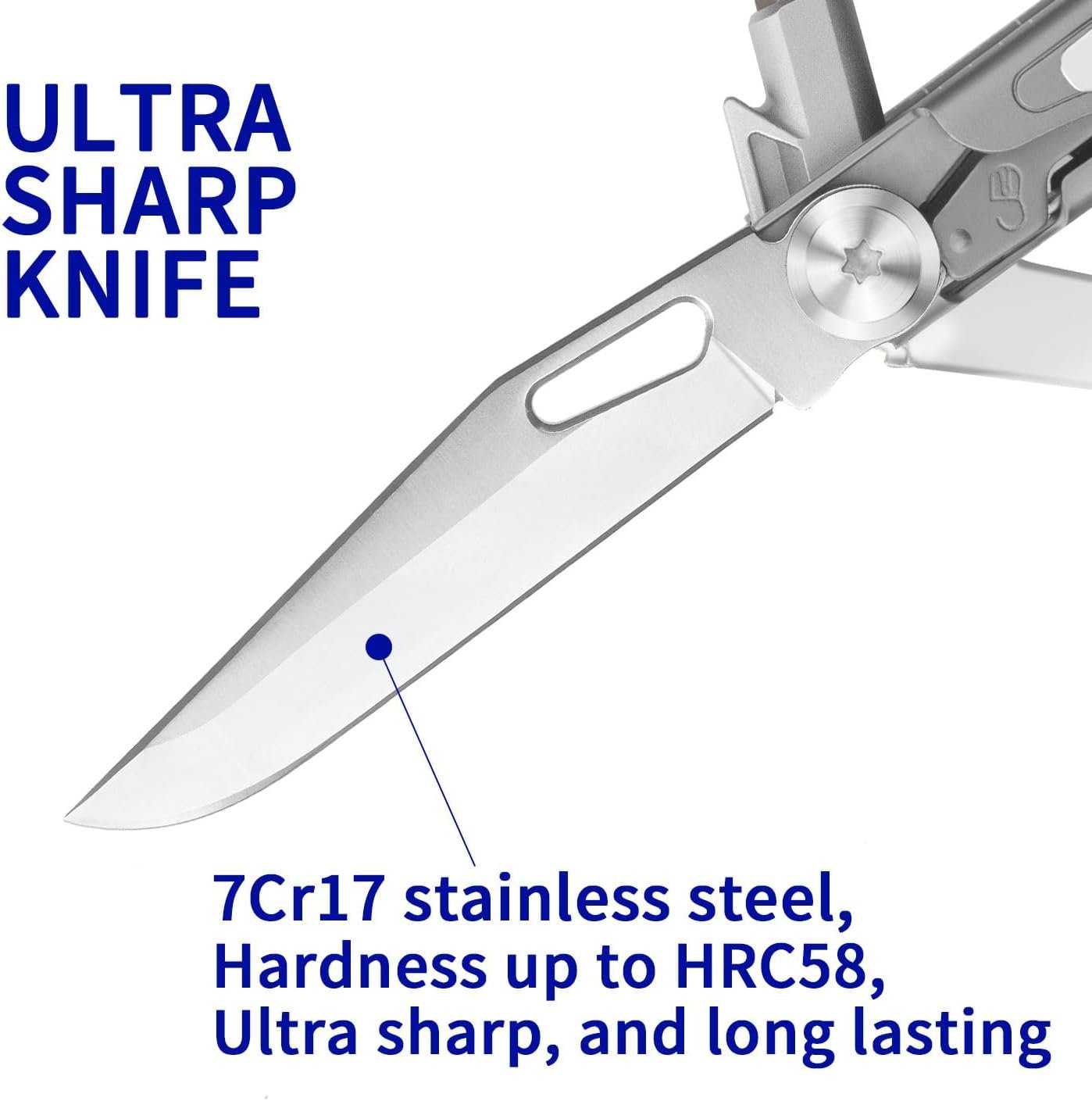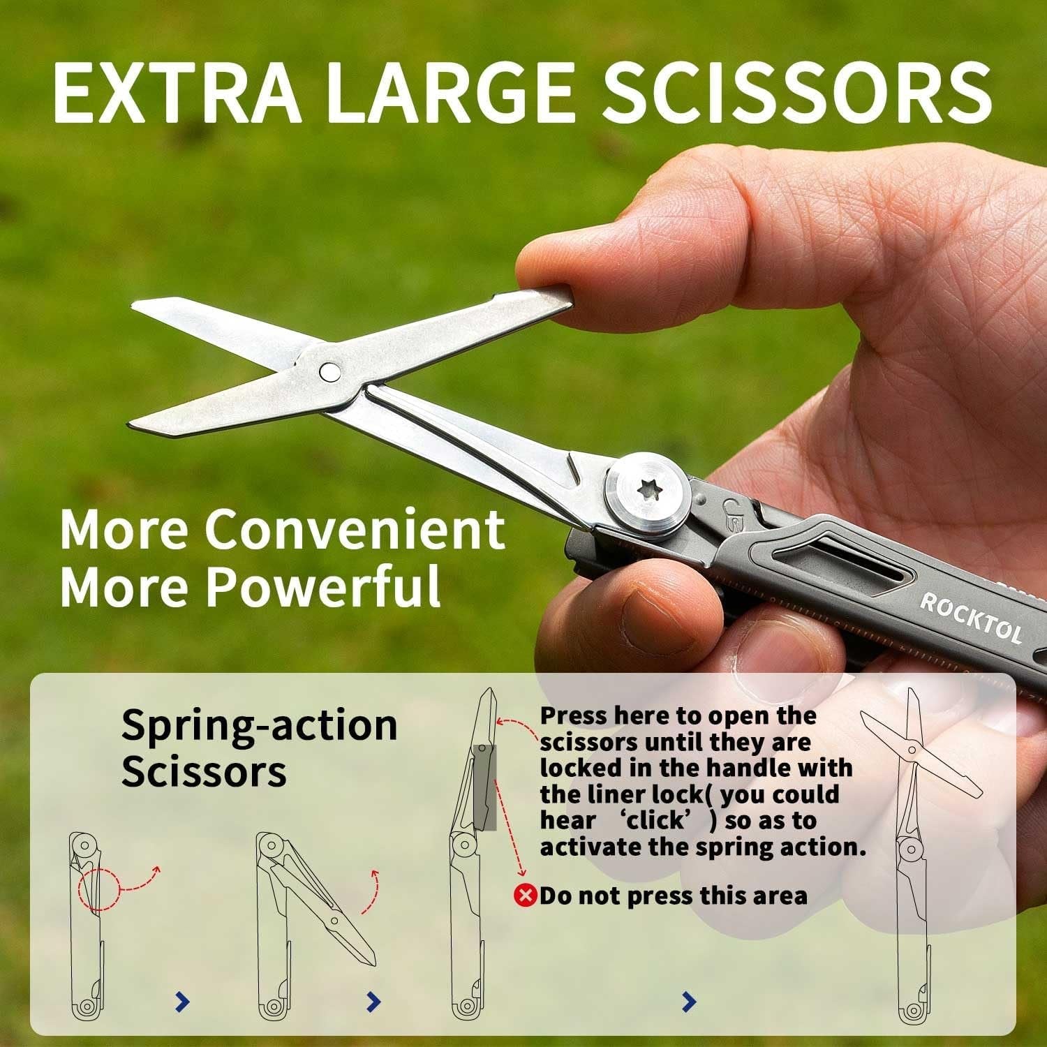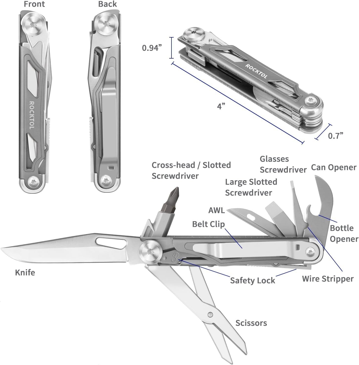 Pocket Multitool Knife with 12 Functions: Rocktol Folding Pocket Knife features 12 functions all-in-one, including a 2.68" long knife blade, Phillips #1 and 3/16" screwdrivers, slotted and glasses screwdrivers, can and bottle openers, wire stripper, awl, large scissors and a built-in pocket clip . All functions are equipped with safety locks to ensure your safety during use. Folding Knife with Titanium-Plated Handle: This Folding Pocket Knife features a sleek and durable titanium-plated handle that provides a secure grip and adds an extra layer of durability to the knife. The 2.68” folding knife blade is the main feature, made of premium 7Cr17 stainless steel that ensures long-lasting sharpness and effortless cutting. EDC Knife with Pocket Clip: This 12-function multitool knife is ergonomically built in a slim and compact profile that is lightweight and convenient to carry with the built-in pocket clip. With small size of 4” x 0.7” x 0.94” and weight of 4.37 oz, it's perfect for everyday carry and fits in your pocket, tool pouch or glove box. Pocket Knife with Large Scissors: Rocktol Folding Pocket Knife is a versatile tool featuring large scissors for wider use, ready for any task in your everyday life, at work, or during outdoor adventures. It is a great companion for camping, hiking, travel and survival. EDC Gear as Great Gift: This portable folding knife with multiple tools all in one makes a great gift for EDC enthusiasts, outdoor adventurers, tradesmen, and craftsmen. It's a must-have EDC tool for anyone who needs a reliable and versatile knife for everyday use.