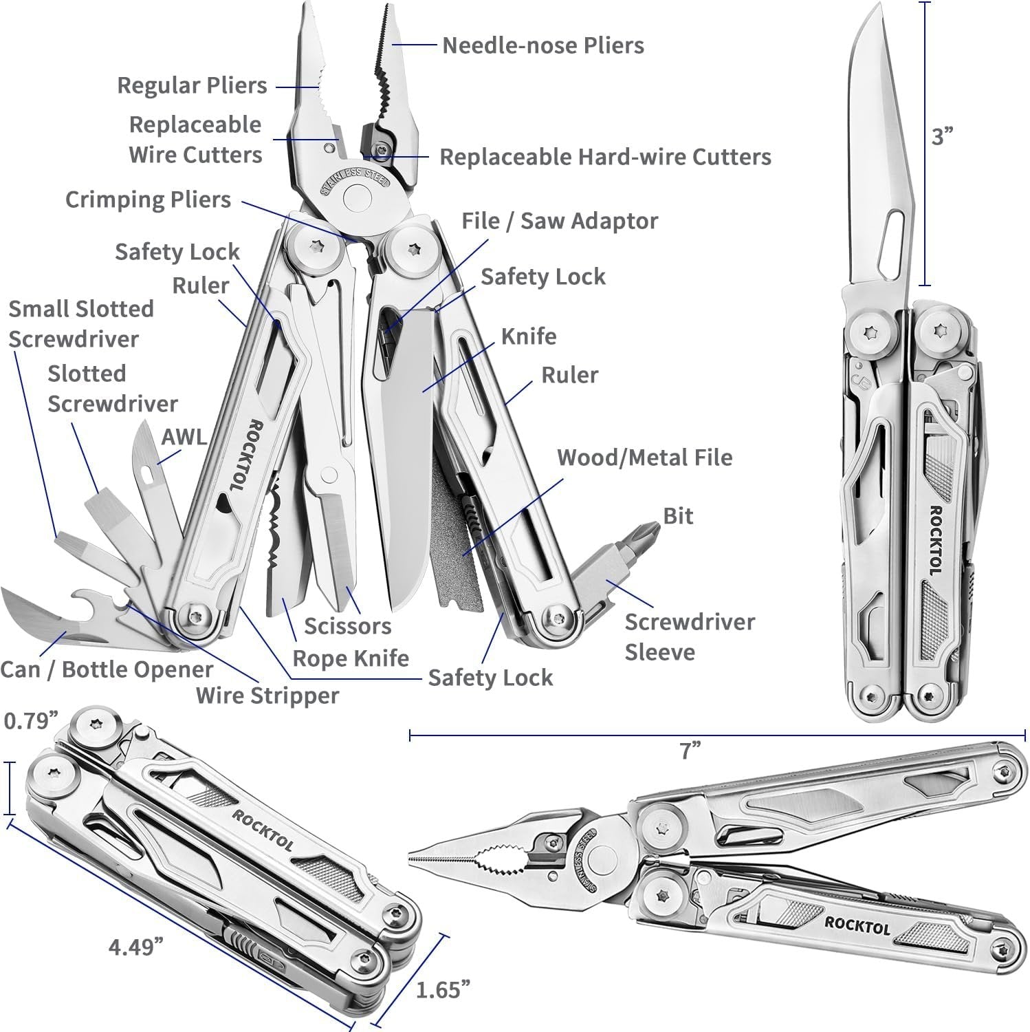 ROCKTOL Multitool, 29-in-1 Multitool Pliers with Replaceable Wire Cutters and Saw, Heavy-Duty Stainless Steel Multitool Set and Nylon Sheath for Camping Survival Gifts for Man