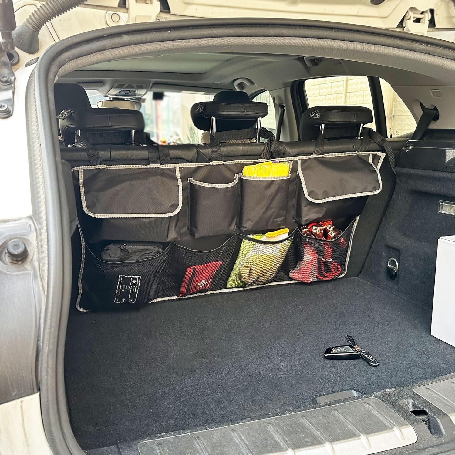 ROOCKHITCB Car Back Seat Trunk Organizer Hanging Bag, Car Interior Organizer Accessories with 4 Pockets and 4 Mesh Pouches,Save More Storage Trunk Space for SUV,Jeep,MPV