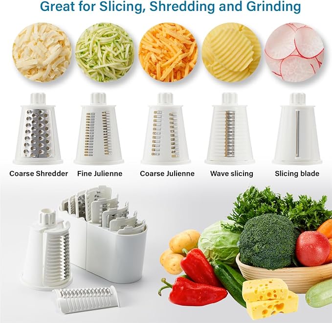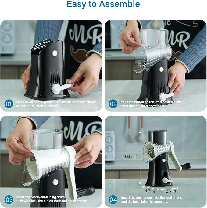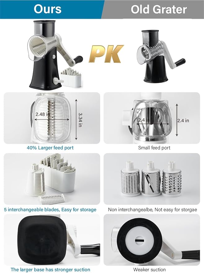 Rotary Cheese Grater Hand Crank, 5-in-1 Rotary Cheese Grater, Stronger Suction, Easy to Clean Grater for Fruit, Vegetables, Nuts, Black