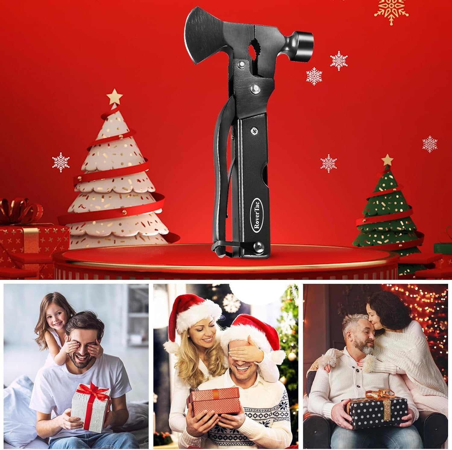 14-in-1 Multi Tool Axe: Features Axe, Knife, Pliers, Saw, Hammer, Wrenches, Screwdrivers, Bottle & Can Opener, File etc. Heavy-duty Camping Gear: This camping axe is made of high-quality stainless steel with robust black oxidation for durability and resistance to everyday wear and tear. Convenient to travel with a durable nylon sheath. Ready for Anything: This multitool is ideal for splitting small logs, cutting branches, and making small wood for the fireplace, stove, barbecue, or campfire. A great addition to camping essentials, toolbox, glovebox, workwear, and hiking and fishing gear. A Perfect Gift for Men: This is a thrilling gift for men, dads, Husbands, Sons, and boyfriends for birthdays, Christmas, Father's Day, Anniversary, or Valentine's Day gifts. Lifetime Warranty: Making this your favorite no-risk purchase, we are proud to stand behind our products and warranty against defects in material and workmanship. Feel free to contact us at service@rovertac.com for any questions.