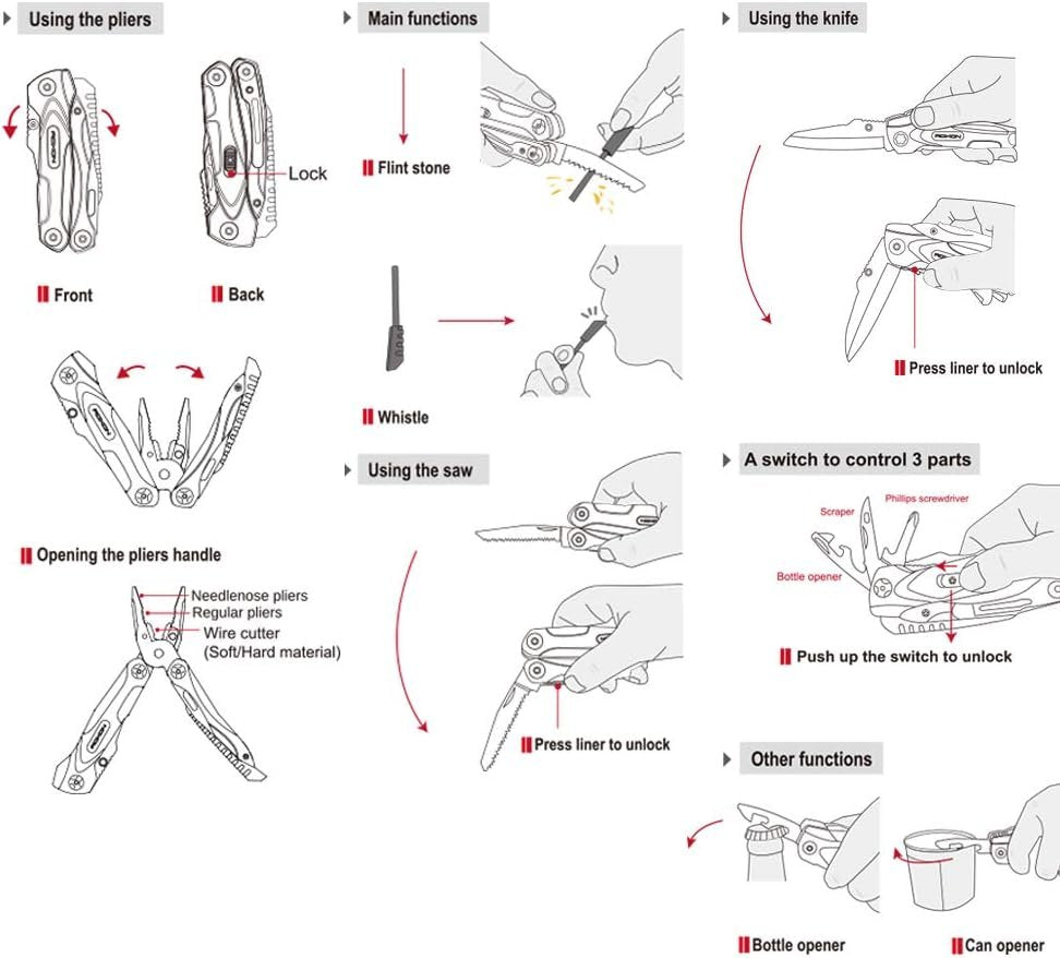 LOCKING MECHANISM: Independent locking mechanism, all the tools lock nicely into place. 14 functions in 1, includes saw, knife, can opener, bottle opener, flat screwdriver, phillips screwdriver, needlenose pliers, regular pliers, wire cutters (Soft/Hard material), flint stone, whistle, reamer, scraper and awl. OUTDOOR ESSENTIAL: Quick access to the knife, and the good size blade actually came really sharp so no additional work was required. EDC multi-tool with belt clip for camping and hiking. COMPACT & LIGHTWEIGHT: The handle is made of nylon and fiber plastic, it's lightweight. Ergonomic handle. SUPERIOR QUALITY: The plier body is black coating which has strong oxidation resistance and high-end appearance, you can enjoy its quality and durability. GUARANTEED: We offer 10-Year warranty and excellent customer service which makes your purchase absolutely risk-free. Any question, just contact us.
