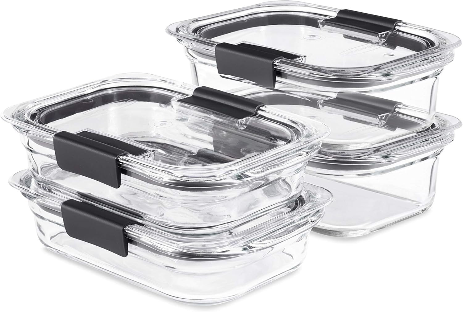 Rubbermaid Brilliance Glass Food Storage Set of 4 containers, 8 Total Pieces (4 containers + 4 lids) for Lunch, Meal Prep, and Leftovers, Dishwasher and Oven Safe, Clear/Grey