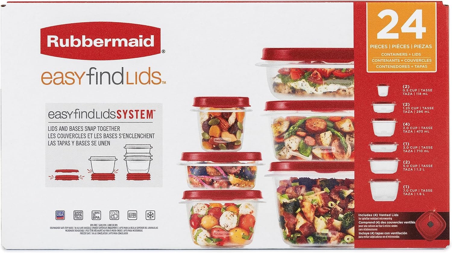 Food storage containers feature Easy Find Lids that snap on to container bases as well as same-size lids, so you can always find lids when you need them Plastic food container lids with vents to help prevent moisture buildup and allow you to microwave splatter-free with the lid on Containers nest easily for compact storage, so your cabinets stay organized BPA free, and built to withstand a wide range of temperatures, so they're top-rack dishwasher safe, microwave safe for reheating only with the lid vents open, and freezer safe Set includes two 118 mL (0.5 Cup) containers, two 296 mL (1.25 Cup) containers, four 473 mL (2 Cup) containers, one 710 mL (3 Cup) container, two 1.2 L (5 Cup) containers and one 1.6 L (7 Cup) container, plus lids