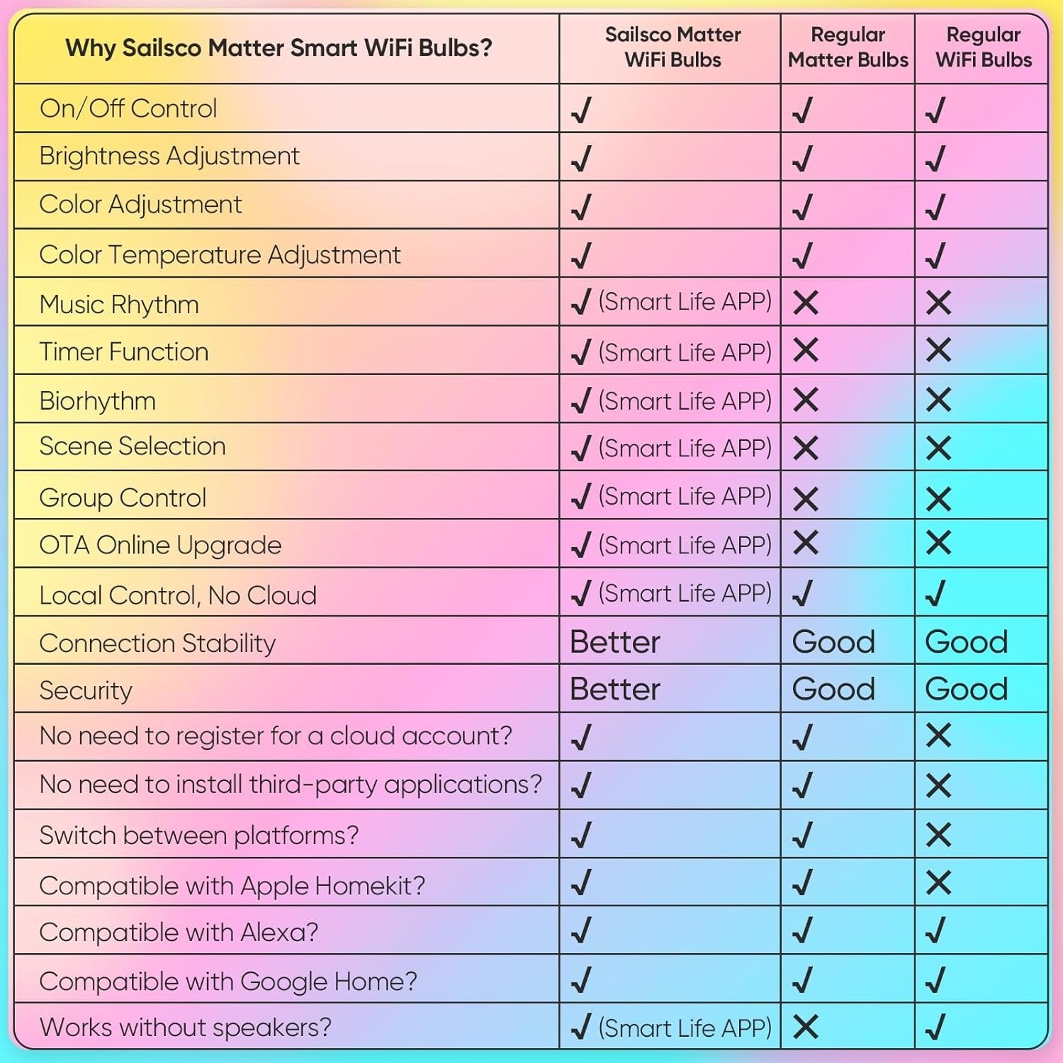 ã€Powerful Matter】- The Alexa E14 sailsco Matter bulb is compatible with all Matter platforms. You can control all your smart home devices with one Matter certified app, without having to download other apps. Scan the Matter QR code to pair the Alexa E14 bulb and simply add it to your Matter or Smart Life APP certified apps ã€Reliable Security】- Matter equips its devices with proven standard encryption algorithms to ensure user data security, while unlimited OTA upgrades build a secure firewall to strengthen security measures. In addition, all our smart devices only support 2.4G networks ã€Voice Controlled Bulb】- The E14 smart bulb is compatible with Alexa and Google Assistant, which allows you to control the lights only by voice, including switches, color adjustment and scene conversion. You can say "Alexa, turn on the bedroom light". We are committed to creating a simple and practical lifestyle for you ã€Multi-coloured dimmable & 8 scenes】 – The colours of the E14 smart bulb are RGB + W + C, Matter Smart Home bulb that provides 16 million colours, the colour temperature can be changed from 2700 K to 6500 K to create a cool white light and a warm white light. Colour changes bring your smart home to life. It has 8 scene modes that meet your lighting needs for balls, dinners, games and other scenarios ã€Brightness adjustment and music rhythm】 - The brightness of the dimmable bulb can be adjusted from 1% to 100% to meet your brightness needs and protect your eyes.E14 Alexa bulbs change color according to the music detected by the microphone, making your home more creative and giving it personality, suitable for family gatherings, movies, reading or gaming ã€Group Control】 - Wherever you are, you can control your Alexa bulb remotely via the "Smart Life" app. You can also gather all your bulbs into a group to control them together