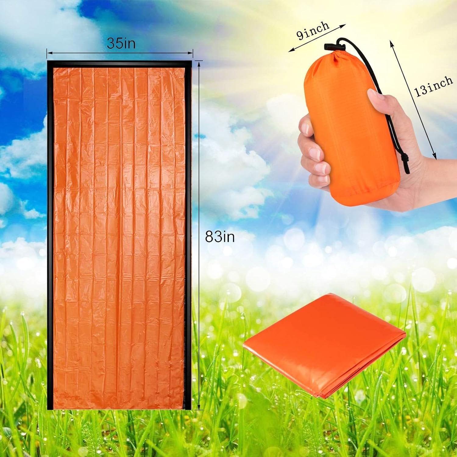 【Survival Emergency Bags】Survival emergency bag, poncho, emergency shelter and more, suitable for your bug out bag. Emergency sleeping bags perfect for emergency situations where warmth or protection from all-weather conditions is required. 【Multi-Purpose Emergencys 】This bivy bag is small and lightweight, easy to carry and store. A must-have tent camping gear when camping, trail running, marathons, tactical gear preparer and travel first aid kit. 【Use It Convenience 】Pull out the bivy sack, unroll and climb inside. Emergency sleeping bag can be used as a sleeping bag liner to keep your body temperature. Orange is a great color for signaling. 【Lightweight Portable】Sleeping bag come in their own durable waterproof stuff sack so you can store it anywhere. They also come with a convenient carabiner clip to clip on to any bag. 【Package Includes】4 Pack Survival Sleeping Bags. Each emergency sleeping bag measures 83 x 35 inches, Lightweight at 4 oz. Made of extra-thick Polyester material. This is a must for everyone who like outdoor expedition.