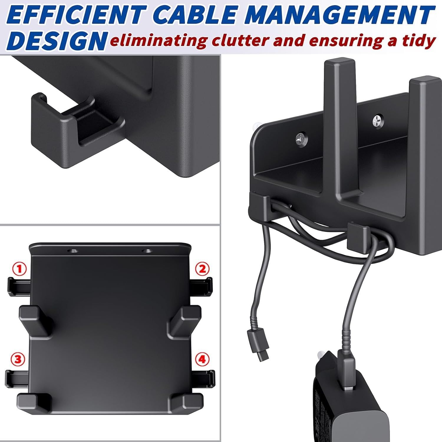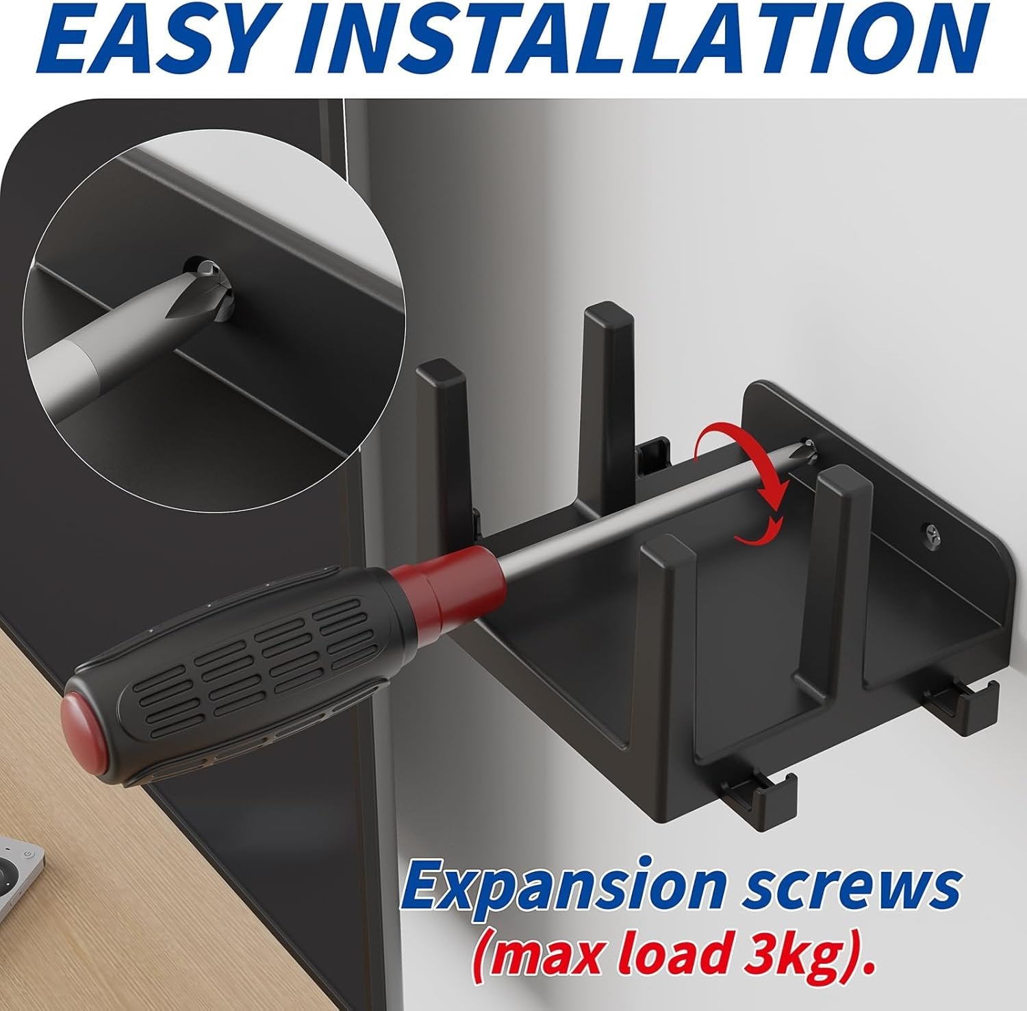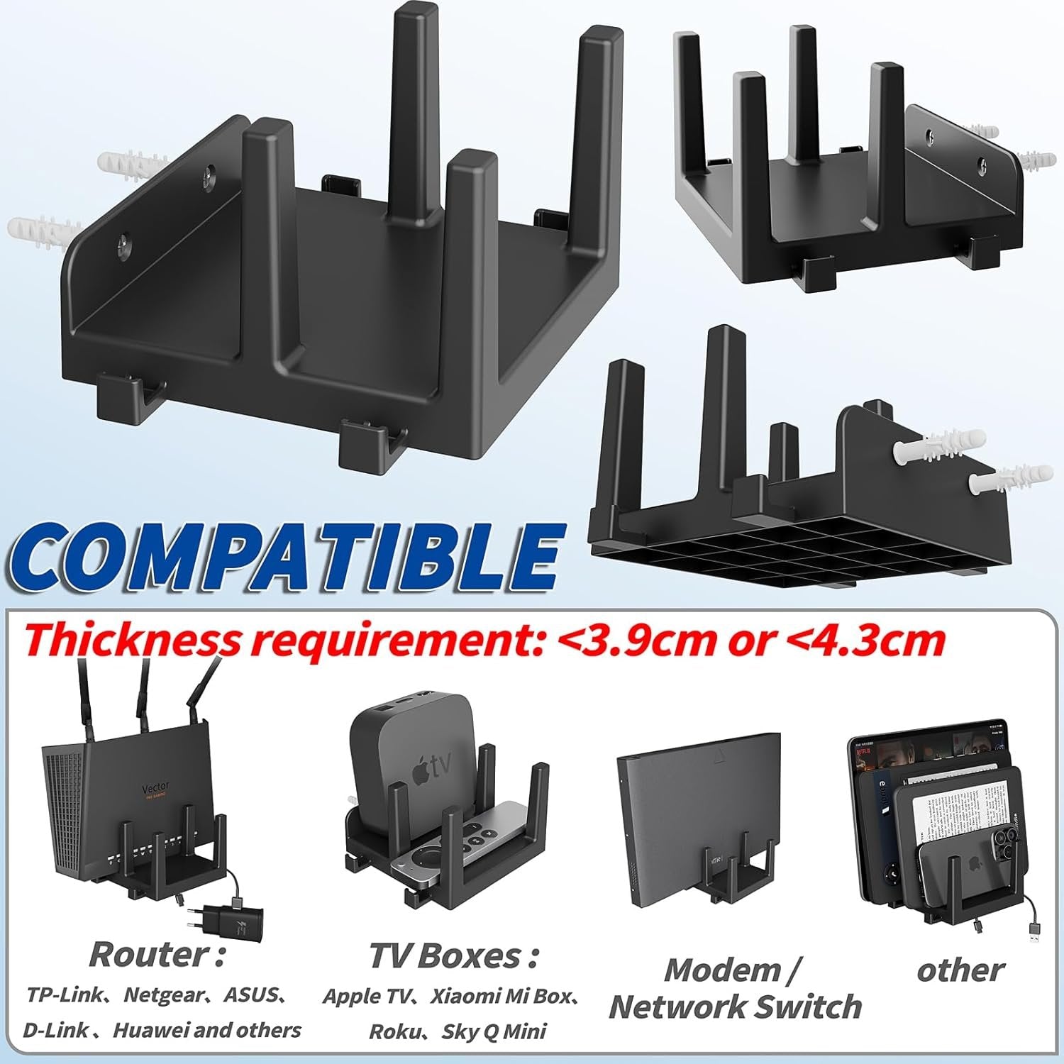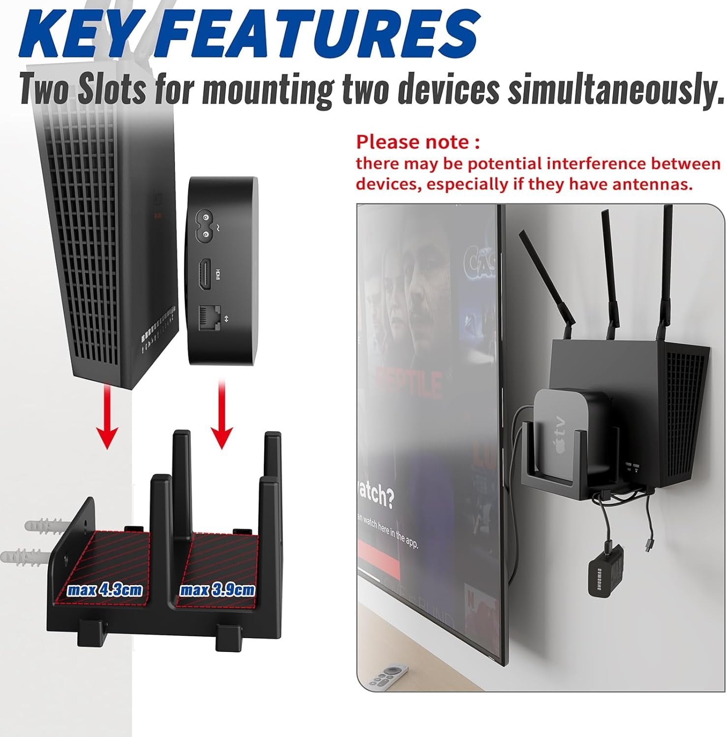 UNIVERSAL COMPATIBILITY - Perfect for routers, TV boxes, modems, network switches and streaming devices. Ideal for TV box as compatible with Xiaomi Mi Box, Apple TV, Sky Q Mini, Android TV Box, etc. For routers such as compatible with TP-Link, ASUS, Huawei, and many more. DOUBLE FLEXIBLE MOUNTING SLOT - Holds two devices simultaneously thanks to the two mounting slots. The first slot supports devices up to 1.5 inches thick, while the second slot is suitable for devices up to 1.75 inches thick. Note: Interference may occur between devices, especially if they have antennas. CABLE MANAGEMENT DESIGN - Integrated side hooks allow you to easily wrap and organize excess cables, eliminating clutter and maintaining a tidy and professional setup. ROBUST AND LIGHTWEIGHT ABS PLASTIC - Made of durable ABS plastic with a smooth and flat surface to ensure a long service life. The lightweight design makes installation easier and the included countersunk screws prevent scratches on devices during placement. COMPACT & SPACE-SAVING DESIGN – With dimensions of 14 x 11 x 7.3 cm, this slim wall bracket maximizes space on desks or shelves. Ideal for organizing electronics in home offices, living rooms or entertainment centers.
