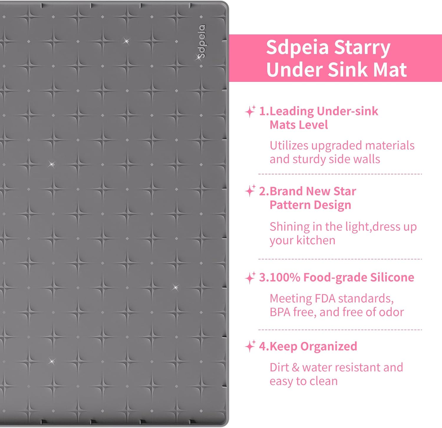 - Sdpeia NEW DESIGN STARRY MAT: Designed to bring functionality and style to your home. Our latest cabinet mat features a striking star pattern that shines beautifully under light, adding a touch of elegance to your kitchen space. With more than 10 new colors and various sizes, finding the perfect match for your decor has never been easier. Our soft and foldable kitchen sink mat saves valuable storage space compared to traditional hard mats but also helps environmental sustainability.
