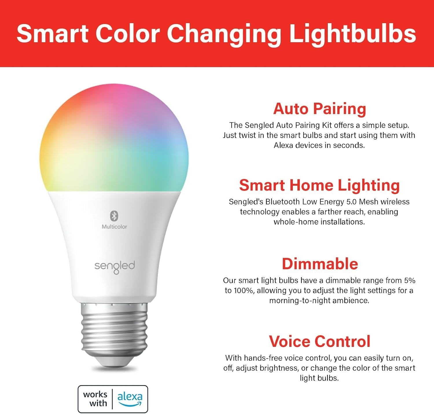 Sengled Light Bulb, S1 Auto Pairing with Alexa Devices, Color Changing , Smart Light that Work with , Bluetooth Mesh Smart Home Lighting, E26 60W Equivalent, 800LM, 4 Count (Pack of 1)