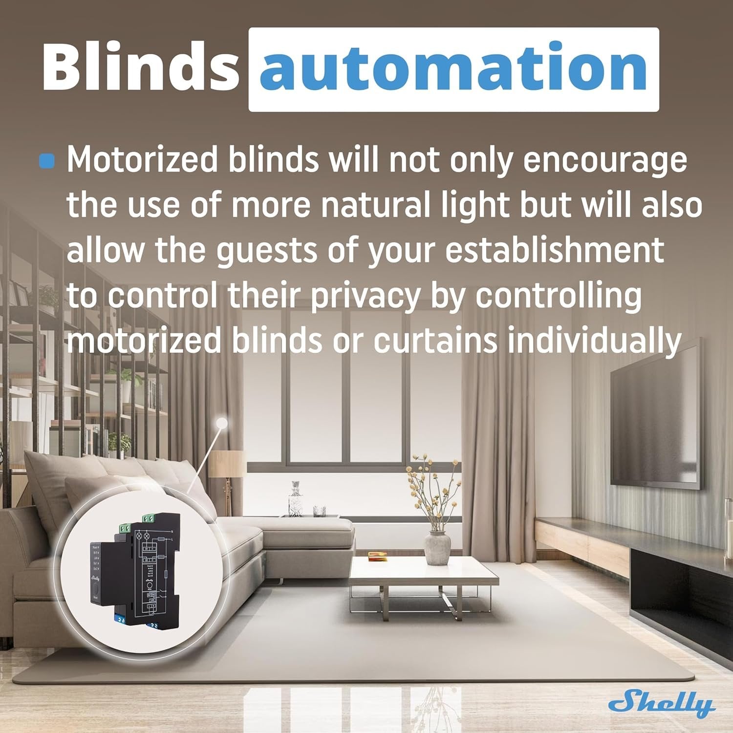 Shelly Pro 2PM - Professional 2 - channel relay with Wi-Fi, LAN, and Bluetooth connection. Suitable for office and business facility automation with remote control and precise power management. The best solution for new home buildings and business facilities: Shelly Pro 2PM, a one-phase 2-channel relay, handles up to 16A per channel (25A total). Featuring integrated power meters for separate consumption control, it supports two-directional motor control for applications like roller shutters, curtains, and gates. Utilize scripting for custom automation scenes based on occurrences, weather, and wind forecasts.Shelly Pro series: Enhanced with temperature, overpower, and overvoltage load protection, Shelly Pro series is designed to be installed inside the breaker box (DIN). Allowing full smart automation with no additional cables or wiring, Shelly Pro line is perfect for everywhere.An awning that follows the weather: Outdoor motorized awnings provide shade on sunny days, but strong winds can damage them. Using Shelly Pro 2PM with a wind sensor or weather forecast script enables automatic closing during windy conditions. If rain is predicted, Shelly reopens the awnings to protect seated customers outdoors.Automated blinds for privacy control: Motorized blinds and curtains in your hotel not only promote the use of natural light but also empower guests to control their privacy. They can individually open, close, or adjust the angle of the blinds based on their preferences.Remote control of the parking gates: Security services can be expensive. Shelly enables access control automation, providing remote control for your office or home's parking barrier or gate door. Schedule Shelly Pro 2PM to keep the barrier open from 6:00 PM to 7:00 PM to facilitate smooth traffic flow as people leave the office.