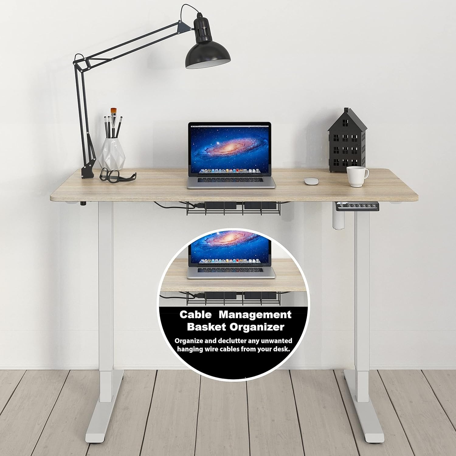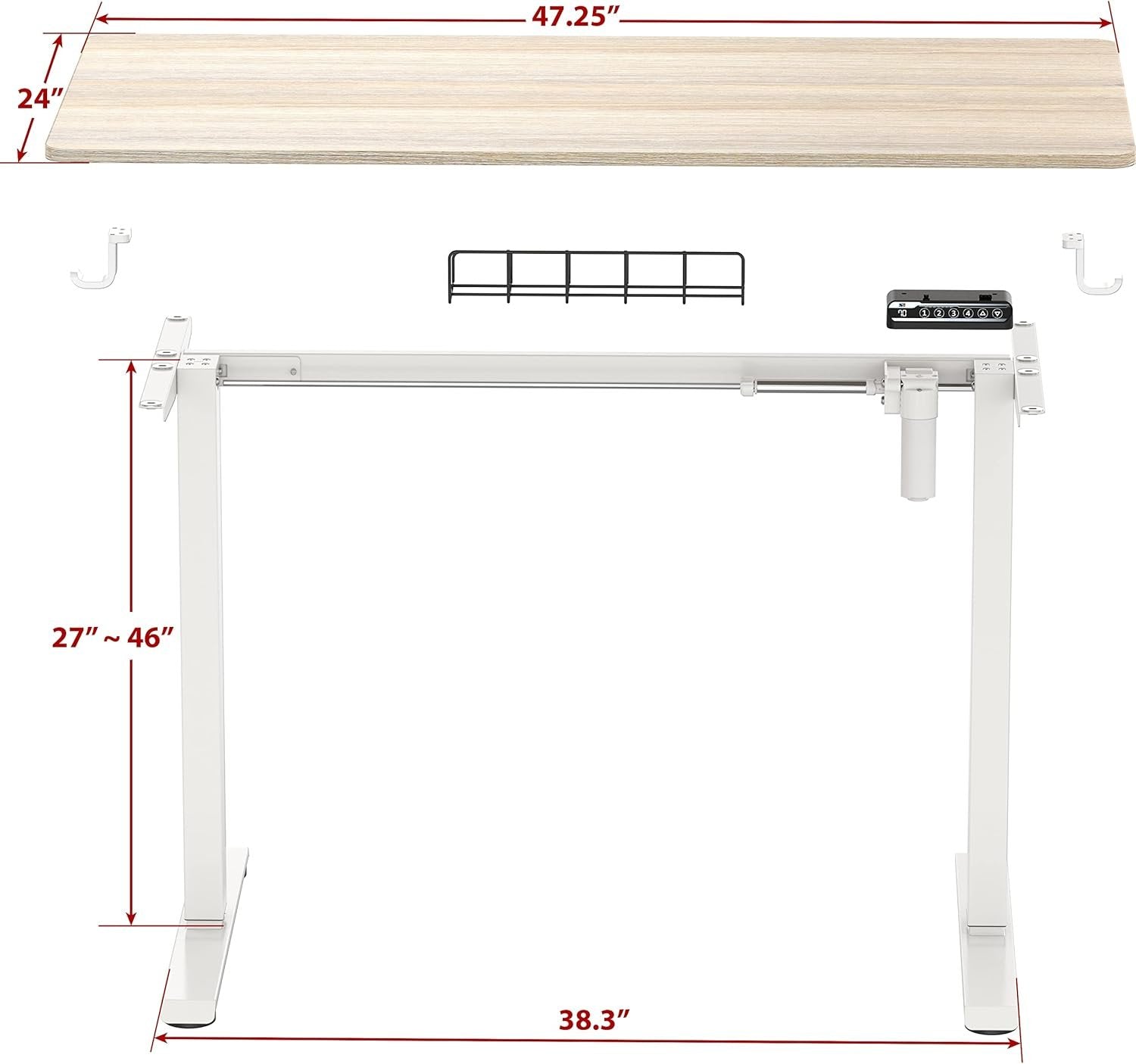 Electric Height Adjustment – Seamlessly transition between sitting and standing positions with a motorized lift system that adjusts from 27" to 46", promoting ergonomic comfort and reducing fatigue during extended work hours. Programmable Memory Controller – Features a digital control panel with four memory presets, allowing you to save and access your preferred height settings effortlessly, enhancing workflow efficiency. Compact Work Surface – The 48" desktop provides ample space to accommodate monitors, laptops, and other essential office equipment, supporting a productive and organized workspace. Integrated Cable Management and Hooks – Includes a built-in cable tray to keep cords neatly organized and out of sight, maintaining a clutter-free and professional workspace. Product dimensions: 48" D x 24" W x 27-46 " H. (121.9 cm D x 60.9 cm W x 68.6-116.8 cm H)