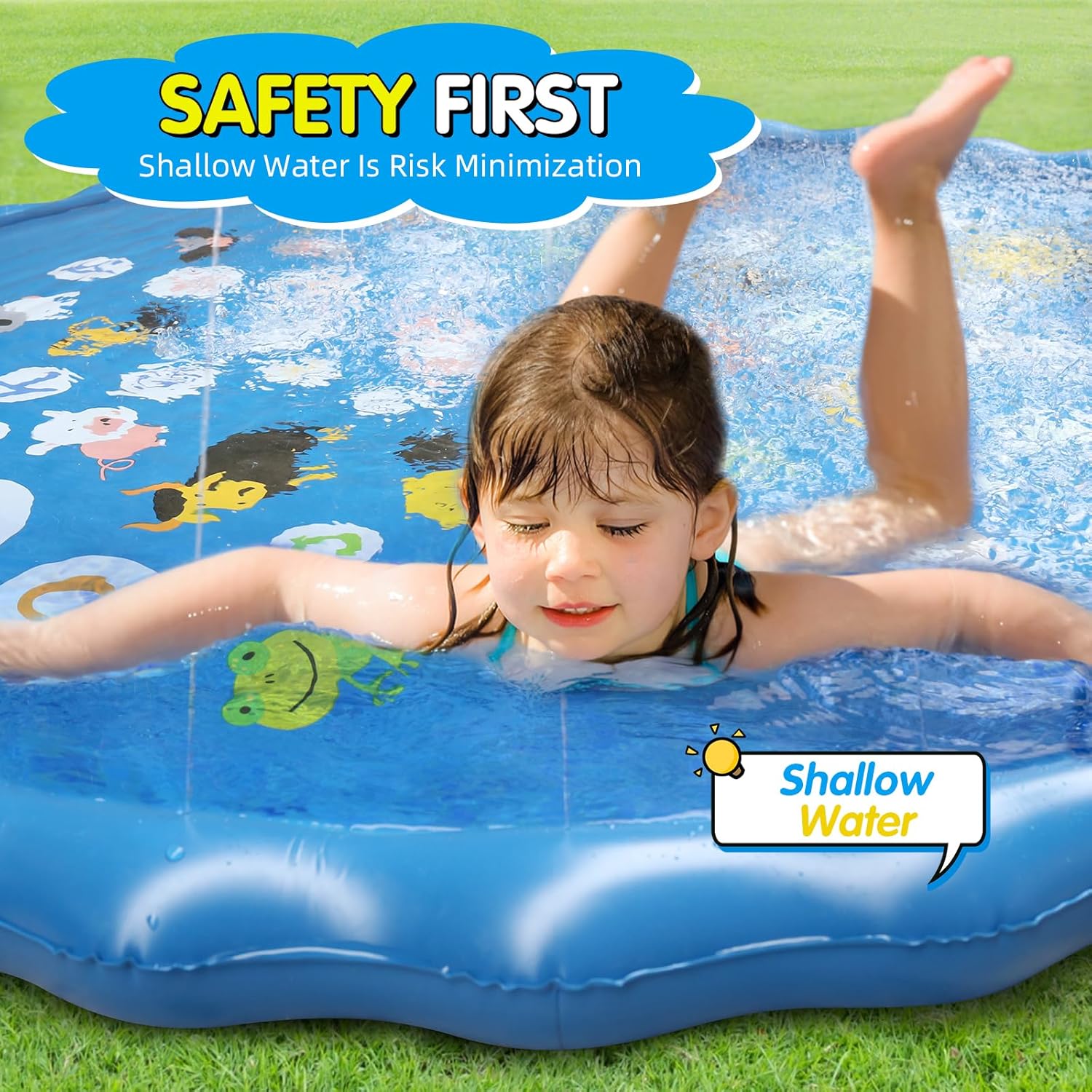 SAFE NON-SLIP DESIGN FOR KIDS: Our splash pad features a textured, non-slip surface, helps prevent slips and falls, allowing children play safely and confidently with water in the backyard. LARGE 170CM SPLASH ZONE FOR FAMILY FUN: This spacious splash pad measures about 170 cm in diameter, which is perfect for kids and pets, providing ample room for multiple children to enjoy cooling off and splashing around in the summer sun. ADJUSTABLE WATER SPRAY HEIGHT: Our sprinker mat allows you to easily control the spray height by adjusting your water pressure, from a gentle mist to thrilling fountains, ensuring fun for kids of all ages and water splash preferences. LEARNING THROUGH WATER PLAY –We make learning fun! Experts agree that play-based learning is vital for a child’s development. Our splash pad combines outdoor play with colorful educational designs, helping kids explore shapes, colors, aand more—all while having a blast in the sun! Perfect for fun summer learning! THICK, DURABLE MATERIAL FOR LONG-LASTING Made with premium heavy-duty PVC, our splash pad is designed to withstand active play from your whole family, ensuring it’s tough enough to withstand kids and even pets. QUICK & EASY SETUP: Simply connect the splash pad to any standard garden hose and watch it fill up in seconds—perfect for spontaneous backyard fun, summer parties, picnics, or beach days!
