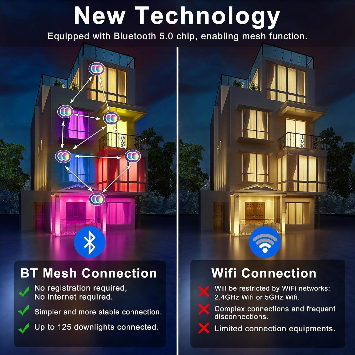 [Smart Voice Control] SikSog Smart RGBCW recessed lighting is compatible with Alexa voice control. Support one-step connection, power on the lights, say to the speaker “Alexa/Echo, find device". A simple conversation can let you turn on and off the lights, set the color of each lights, and dim the lights to match your favorite scenes (such as home theater, bathroom, yoga, game room, etc.) [APP Control & No Internet Required] Download the "BRmesh" APP, turn on the Bluetooth of the mobile phone, click on the home page to add device, and it will automatically connect. No registration required, no internet required. Then you could easily control multiple smart downlights via your phone,enjoying lights color change, dimming and group control ets (Note: remote control is don't required) [BT Mesh Technology] Smart downlight is equipped with Bluetooth 5.0 chip to realize mesh function. Does not occupy the router broadband, and is stable and does not drop the line. A simple application gives you the freedom to control any number of lights (up to 125 lights). BT Mesh is an excellent solution for multi-lamp control, which solves the shortcomings of short control distance of IR remote control lamp, few lamps and disconnection of WIFI lamp due to network speed [Daily Lighting & Mood Lighting] SikSog 16W 1350LM Smart Downlight has a color temperature of 2700K-6000K to choose from, and supports 1%-100% brightness adjustment, no flicker and no glare to meet daily lighting requirements; In addition, it also provides RGB multi-color lights, and you can use APP to choose the ideal flash-free backlight or ambient lighting for your mainstream media live broadcast and video recording according to different scenes or different needs [DIY Scene & Music Synchronization] You can set the color or mode of each lamp to match your favorite scenes (such as home theater, bathroom, yoga, etc. ), only need a button to start after saving; 23 different dynamic modes are provided. When multiple lights are activated at the same time, the rhythm of color change can be kept consistent [Easy to install] LED pot lights with Junction Box. The outer diameter of the LED downlight is Ø6.25 inch, Ceiling cutout: 5.7-6.2 inch, the suitable installation depth: 1.57 inch, the installation is convenient and safe. It is suitable for installation and use in different places , such as home,hotel,coffee shop, restaurant,Bar,game room,etc