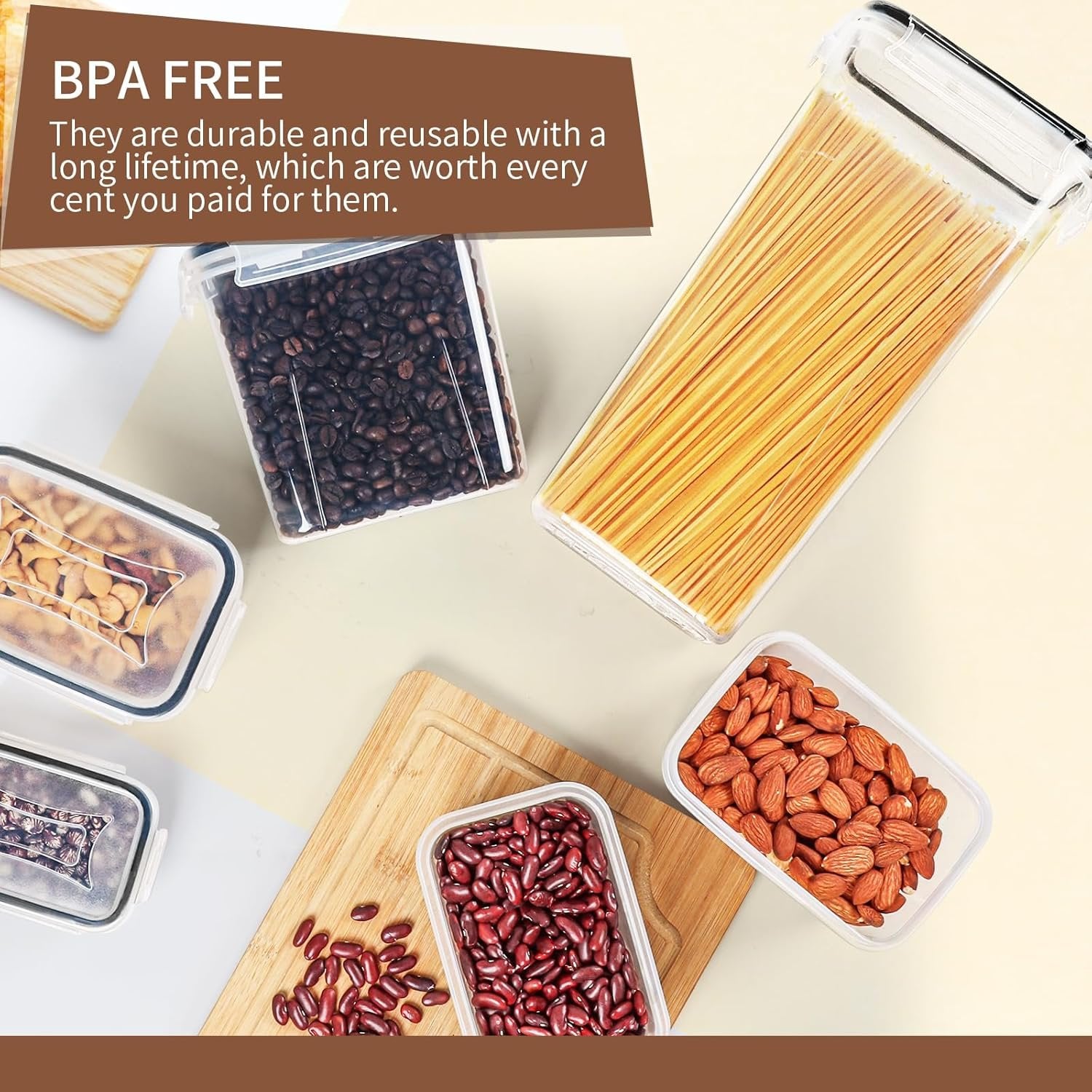 vailable in 6 Sizes: Our flour and sugar containers set come in 6 different sizes from 0.24L to 2.8L(Including 6Pcs 0.24L+6Pcs 0.52L+6Pcs 0.8L+6Pcs 1.4L+6Pcs 2.0L+6Pcs 2.8L). Plus, they come in a beautiful box with a chalkboard marker, 40pcs labels can easily help you mark your food and quickly find out what you need Airtight Locking Lids: The side-locking lids with silicone gaskets make food storage containers with lids airtight, which ensures airtight protection, liquid friendliness, and prolonged food storage. So you don't need to worry about your favorite foods turning stale anymore! Plus, except for the 0.24L lid that is not universal, other sizes (2.8L, 2.0L, 1.4L, 0.8L, 0.52L) of lids can be shared Making Storing Easier: Skroam kitchen pantry organization and storage set has an excellent design to minimize space, they are stackable and will easily fit into your pantry which enables you to get the kitchen organized and free up space. The airtight food storage container is perfect for storing flour, sugar, spaghetti, rice, nuts, cereal, snacks, pasta, and more More Value: Skroam pantry organizer set is a must for anyone who wants a neat and nice look kitchen. Our plastic storage containers for organizing food are perfect for a variety of occasions: gym, office, picnic, party, travel, outdoor and indoor