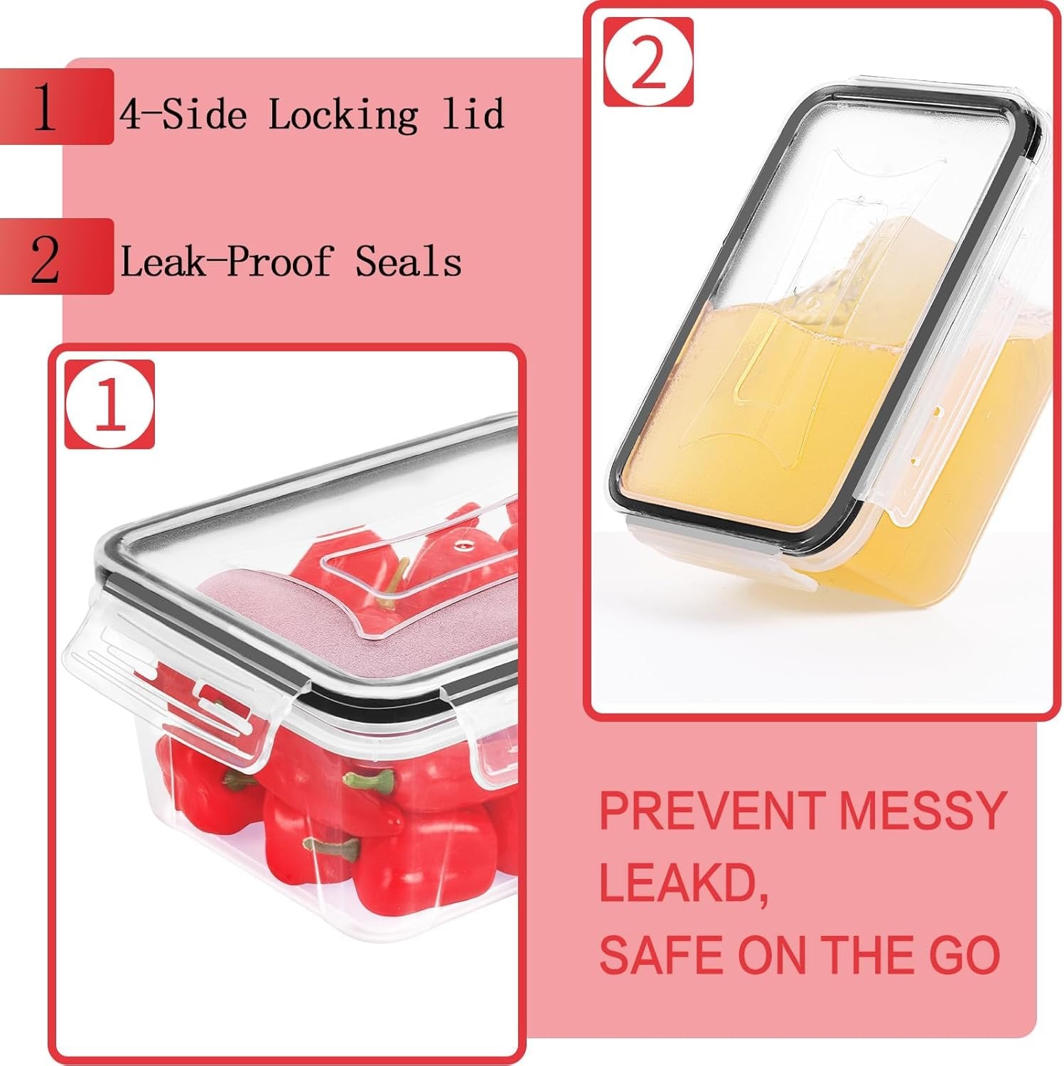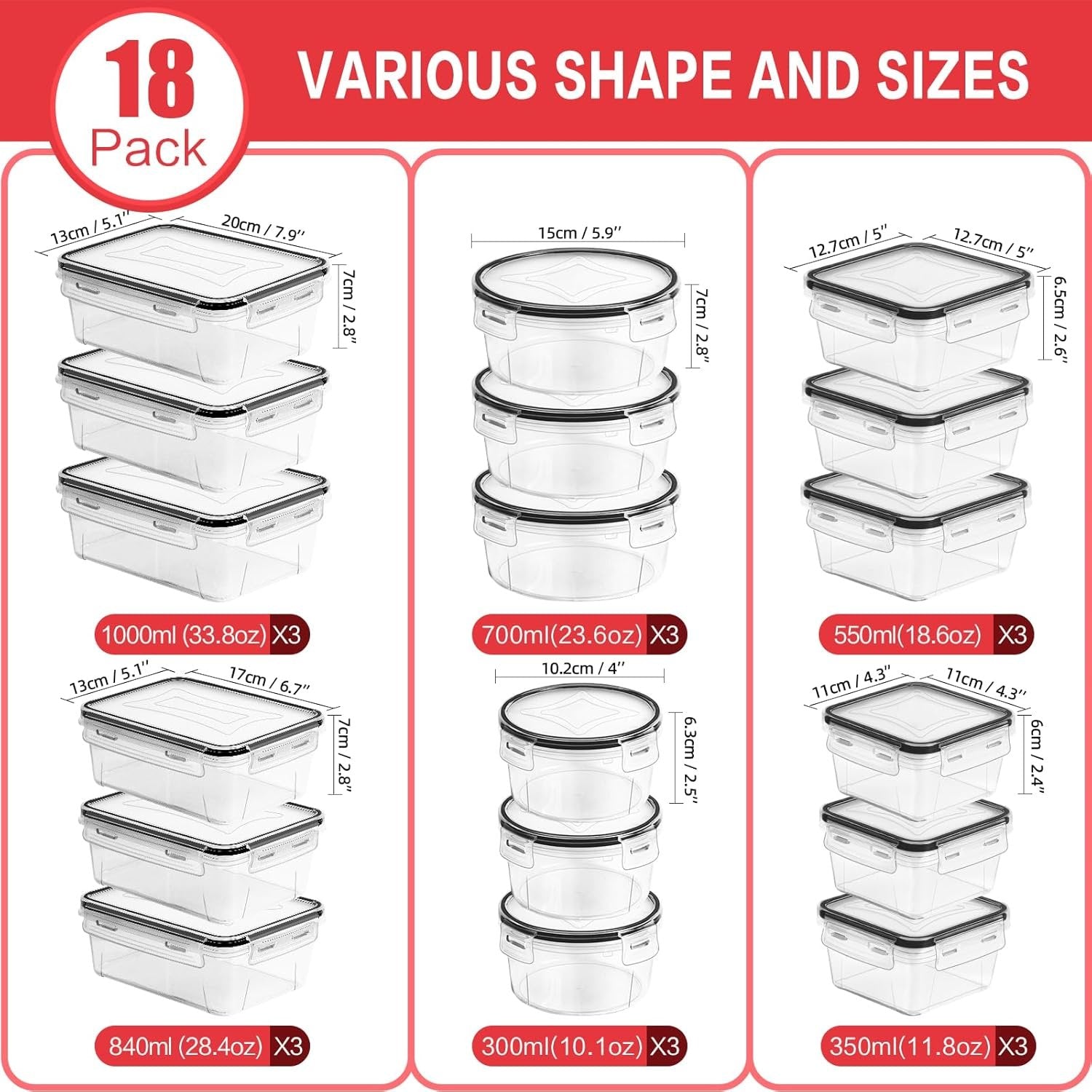 All Possible Sizes: This 36pcs stackable storage containers set comes 18 containers with 18 lids of multiple sizes and shapes to fulfill your storage requirement, which includes 6 round containers (3*700ml, 3*300ml), 6 square containers (3*550ml, 3*350ml) and 6 rectangle containers (3*1000ml, 3*840ml). Plus, equipped with 20pcs labels and pen, you can record the time of food storage, no longer expired, stale food Prolonged Freshness: The side-locking lids with silicone gasket make food storage containers with lids for pantry airtight, which ensure nothing goes stale and stays leak-proof to keep your food fresh and dry. These fridge storage containers are perfect for storing leftovers and enjoying them later on with your family Save Space: This pantry organizer set has an excellent stackable design, they will easily fit into each other leaving more space on your kitchen slabs and cabinets, also perfectly stackable to fit in your refrigerator and freezer. Easy to wash and clean, air tight storage containers with lids can be reused and cater to multipurpose storage requirements Daily Living Assistant: Kitchen storage containers set is made of BPA-free plastic, perfect for storing leftovers, fruits, vegetables, cooked meals, dry food and even gravy. Our storage bowls for kitchen with lids are perfect for a variety of occasions: gym, office, picnic, party, travel, outdoor and indoor. Lightweight and easy to carry, it is ideal for workers, students and travelers