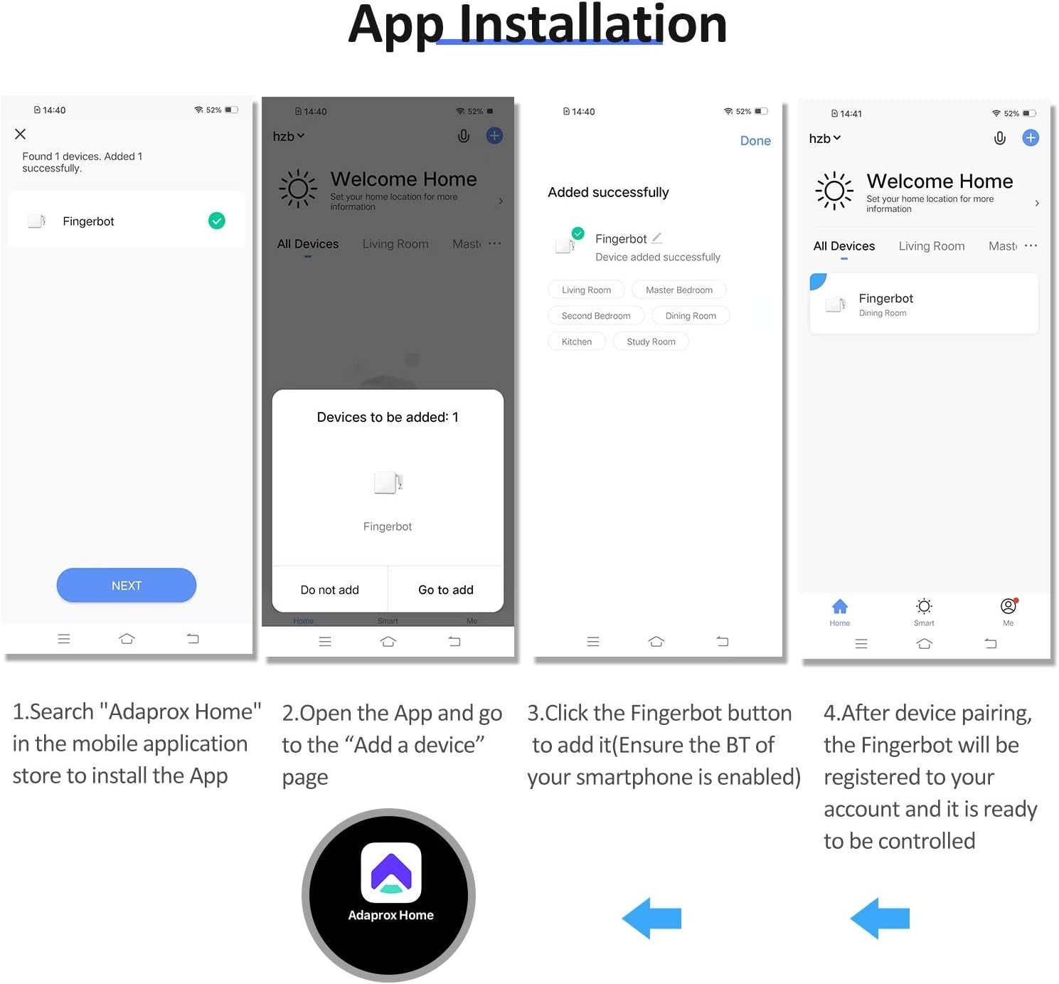 - - - - Fingerbot is the world's smallest robot for smartly controlling different types of buttons and switches. It can control your existing home appliances with robotic clicks. Switch lights via App, schedule a morning coffee, activate your vacuum cleaner with voice command, and remotely power on your office PC. Now all these become effortless with Fingerbot. Device Installation: To install your Fingerbot: 1. Clean the surface of the button panel where you want to install the Fingerbot. 2. Attach it to the panel using a double-sided tape provided in the Fingerbot package. 3. Connect your Fingerbot with the App and calibrate the movement of the Fingerbot's robotic arm to fit the button. The "Down Movement" parameter should be set to the value at which the Fingerbot's arm can just press the button. Note: Improper movement settings may bring additional resistance and reduce the life of your Fingerbot. 4. After installation, we recommend resting the device for 24 hours to reach maximum adhesion. Specifications: Type: Fingerbot / Gateway / Fingerbot II White / Fingerbot II Black / Accessories (Optional) Material: ABS Communication Protocol: BLE 4.2 System Support: iOS 11 and above, Android 9.0 and above Stall Torque: 2.0 kgf.cm Maximum Arm Movement: 12mm Working Temperature: -10~45℃ Battery: 3V 150mAh CR2 lithium battery Item Weight: 39g / 1.40oz Package Weight: 54g / 1.93oz Package Size: 6 * 5.6 * 3.8cm / 2.36 * 2.20 * 1.50in Packing List: 1 * Fingerbot 5 * Double-sided Tape 1 * Manual (English) ✅ Smart Device Requirements: support by both Android(Android 9.0 and above) and iOS(iOS 11 and above) system. ✅ Voice Control: supports voice assistants such as Google Home and Alexa. You can set up voice commands in the APP to active voice-control function. ✅ APP Control: create an account on your smart phone, then you can control the Fingerbot via BT wirelessly. ✅ Replaceable Arm: with the modular design, the Fingerbot's arm is replaceable in order to meet different needs in diverse situations. ✅ Timer Function: you can set timer in the APP. When the time is up, it will be actived automatically.